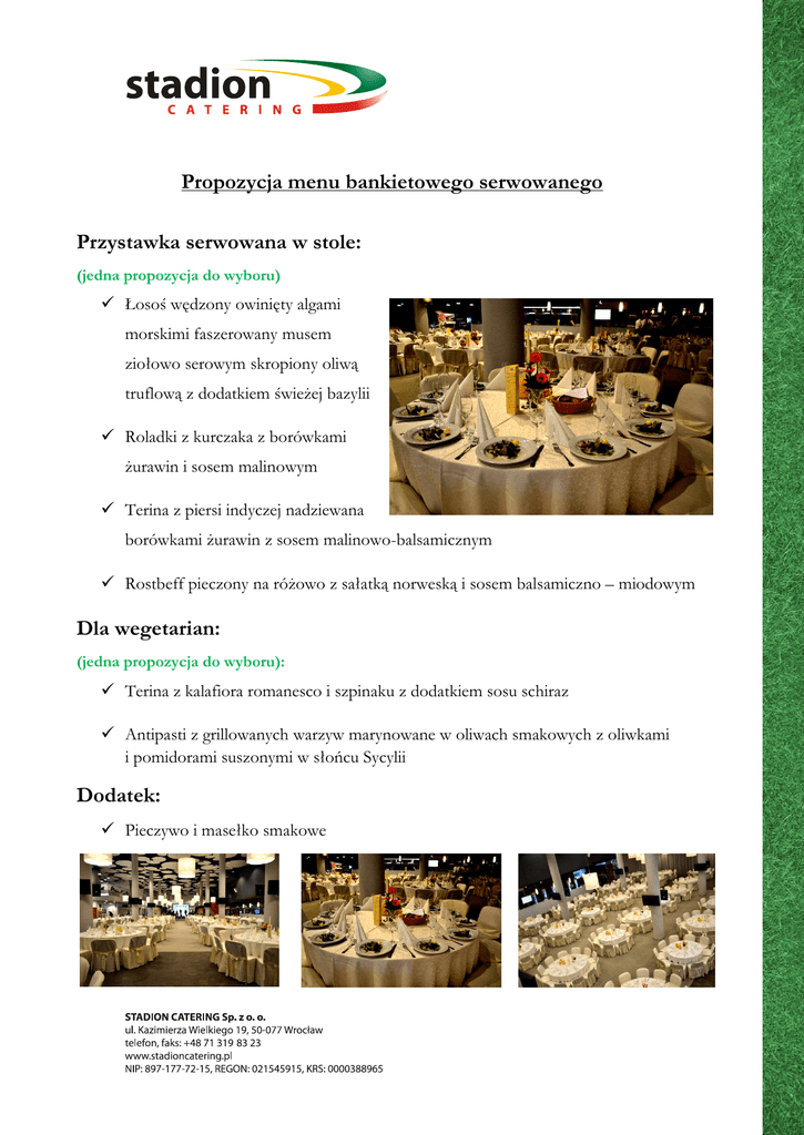 Propozycja menu bankietowego serwowanego Przystawka serwowana w stole: (jedna propozycja do wyboru) Łosoś wędzony owinięty algami morskimi faszerowany musem ziołowo serowym skropiony oliwą truflową z dodatkiem świeżej bazylii Roladki z kurczaka z borówkami żurawin i sosem malinowym Terina z piersi indyczej nadziewana borówkami żurawin z sosem malinowo-balsamicznym Rostbeff pieczony na różowo z sałatką norweską i sosem balsamiczno – miodowym Dla wegetarian: (jedna propozycja do wyboru): Terina z kalafiora romanesco i szpinaku z dodatkiem sosu schiraz Antipasti z grillowanych warzyw marynowane w oliwach smakowych z oliwkami i pomidorami suszonymi w słońcu Sycylii Dodatek: Pieczywo i masełko smakowe Zupy (jedna propozycja do wyboru) Krem borowikowy z kluseczkami, pachnący tymiankiem. p/250ml Krem chrzanowy z prażonym bekonem p/250ml Krem z marchwi z migdałami i serem feta p/250ml Krem selerowo jabłkowy z ziołowymi grzankami p/250ml Zupa rakowa z kluseczkami cielęcymi. p/250ml Danie główne (jedna propozycja do wyboru) Wieprzowina Rolada z polędwiczki wieprzowej z kasztanami w sosie wiśniowym z dodatkiem klusek śląskich u boku czerwonej kapusty zaprawianej Ginem p/120g/180g/150g Drób Rolada z kaczki w sosie anyżowo-imbirowym na majerankowym jabłku z dodatkiem smażonych kopytek p/100g/40g/60g/150g Dla wegetarian (jedna propozycja do wyboru) Zapiekany bakłażan na concase pomidorowym z bryndzą p/200g Pierożki Rawioli ze szpinakiem w sosie ostrygowym p/200g Bufet szwedzki Bufet typu finger food * porcji z n/w 15g-25g Plastry wędzonego łososia na kulkach melonowych z limetą i koprem Roladki Spring – Rolls z kurczakiem i warzywami w sosie słodko kwaśnym Mini szpady drobiowe w sezamie z pikantnej marynaty Mini szaszłyki drobiowe ze śliwką kalifornijską Śliwka wędzona w plastrach bekonu z salsą meksykańską Mini grzanka z szynką długo dojrzewającą z musztardą Dijon Mini grzanki z łososiem wędzonym z gałązką koprem Wędzona pierś kacza podana na polencie z chutneyem śliwkowym Pomidorki koktajlowe z mozzarellą marynowaną w oliwie skropione Pesto Lazagne z grillowanych warzyw z serem fata Platery z kompozycjami pieczonych mięs, pasztetów oraz wędlin garnirowane warzywami i owocami - * porcji / 80g /os. Schab szpikowany śliwką kalifornijską i daktylami Rostbef pieczony na różowo w gorczycy i rozmarynie Rolada drobiowa ze szpinakiem, brokułami i serem pleśniowym Rolada z indyka z borówkami żurawin pieczona w cytrusach Wykwintne salami picante z rucolą Szynka pieczona podana z konfiturą śliwkową Pasztety pieczone Dodatki: Sos musztardowo miodowy, salsa pomidorowa, sos tzatzyki Pieczywo bankietowe Platery z trio serów -mimolet, czedar, gouda holenderska w towarzystwie n/w galanterii - * porcji / 5g-15 g. Kiście winogron, oliwki, pomidory suszone, cukinia grillowana z pesto Kulki serowe nadziewane suszonym pomidorem i orzechami Pomidorki koktajlowe z mozzarellą marynowaną w oliwie skropione pesto Bar sałatkowy - sałatki podawane w pucharkach i misach Makaron ryżowy z mieszanką frutti di mare z sosem ostrygowym *p/80g Sałatka z grillowanym kurczakiem w sosie teryaki z ananasem *p/80g Sałatka śródziemnomorska z pomidorami, ziołowymi grzankami i serem rokpol *p/80g Dania gorące podawane w godzinach wieczornych: Wieprzowina Roladki schabowe z pomidorami suszonymi *p/100g Wołowina Boeuff stroganow *p/200g Drób Roladki z kurczaka ze szpinakiem w sosie gorgonzola *p/80g/50g Danie wegetariańskie Antipasto grillowane warzywa marynowane w oliwach smakowych *p/ 100g Lazagne ze spinakiem w sosie bolognese *p/100g Dodatki Ziemniaczki zapiekane z czerwoną cebulą Ryż z warzywami Deser Mix warzyw z sosami (koperkowy, winegrette, musztardowy) Panna Cotta z truskawkami *p Panna Cotta z czekoladą *p Portfait jagodowy z wiśniami *p Koktajl truskawkowy z listkiem mięty *p Szarlotka z kruszonką *p/50g Sernik z brzoskwinią skropiony karmelem *p/50g Ciasto jogurtowe z owocami *p/50g Ciasto czekoladowe z wiśniami *p/50g Owoce południowe ( pomarańcz, mandarynka, banan, kiwi, ananas) z fantazją ponade na lustrze *kg Bar z napojami Kawa z ekspresu z dodatkami bez limitu Paleta herbat smakowych z dodatkami bez limitu Soki owocowe bez limitu Woda mineralna bez limitu *ilość porcji, ustanawiana dla każdego zlecenia indywidualnie