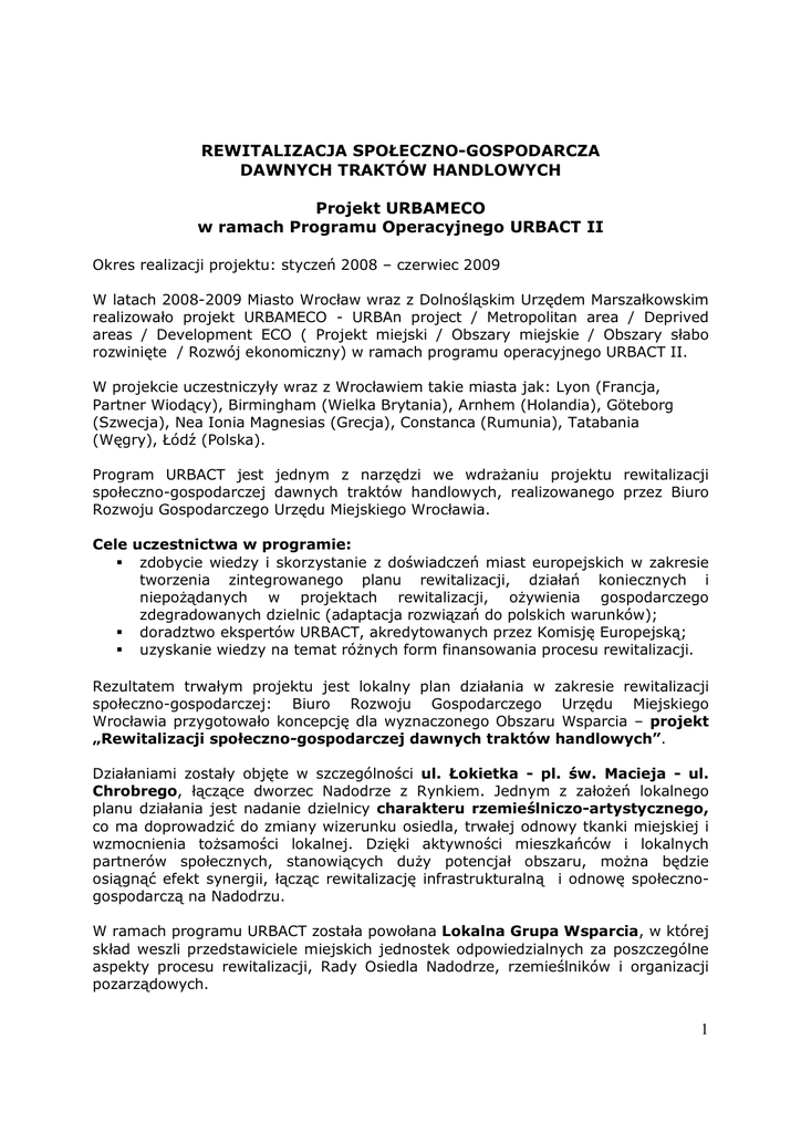 REWITALIZACJA SPOŁECZNO-GOSPODARCZA DAWNYCH TRAKTÓW HANDLOWYCH Projekt URBAMECO w ramach Programu Operacyjnego URBACT II Okres realizacji projektu: styczeń 2008 – czerwiec 2009 W latach 2008-2009 Miasto Wrocław wraz z Dolnośląskim Urzędem Marszałkowskim realizowało projekt URBAMECO - URBAn project / Metropolitan area / Deprived areas / Development ECO ( Projekt miejski / Obszary miejskie / Obszary słabo rozwinięte / Rozwój ekonomiczny) w ramach programu operacyjnego URBACT II. W projekcie uczestniczyły wraz z Wrocławiem takie miasta jak: Lyon (Francja, Partner Wiodący), Birmingham (Wielka Brytania), Arnhem (Holandia), Göteborg (Szwecja), Nea Ionia Magnesias (Grecja), Constanca (Rumunia), Tatabania (Węgry), Łódź (Polska). Program URBACT jest jednym z narzędzi we wdraŜaniu projektu rewitalizacji społeczno-gospodarczej dawnych traktów handlowych, realizowanego przez Biuro Rozwoju Gospodarczego Urzędu Miejskiego Wrocławia. Cele uczestnictwa w programie: zdobycie wiedzy i skorzystanie z doświadczeń miast europejskich w zakresie tworzenia zintegrowanego planu rewitalizacji, działań koniecznych i niepoŜądanych w projektach rewitalizacji, oŜywienia gospodarczego zdegradowanych dzielnic (adaptacja rozwiązań do polskich warunków); doradztwo ekspertów URBACT, akredytowanych przez Komisję Europejską; uzyskanie wiedzy na temat róŜnych form finansowania procesu rewitalizacji. Rezultatem trwałym projektu jest lokalny plan działania w zakresie rewitalizacji społeczno-gospodarczej: Biuro Rozwoju Gospodarczego Urzędu Miejskiego Wrocławia przygotowało koncepcję dla wyznaczonego Obszaru Wsparcia – projekt „Rewitalizacji społeczno-gospodarczej dawnych traktów handlowych”. Działaniami zostały objęte w szczególności ul. Łokietka - pl. św. Macieja - ul. Chrobrego, łączące dworzec Nadodrze z Rynkiem. Jednym z załoŜeń lokalnego planu działania jest nadanie dzielnicy charakteru rzemieślniczo-artystycznego, co ma doprowadzić do zmiany wizerunku osiedla, trwałej odnowy tkanki miejskiej i wzmocnienia toŜsamości lokalnej. Dzięki aktywności mieszkańców i lokalnych partnerów społecznych, stanowiących duŜy potencjał obszaru, moŜna będzie osiągnąć efekt synergii, łącząc rewitalizację infrastrukturalną i odnowę społecznogospodarczą na Nadodrzu. W ramach programu URBACT została powołana Lokalna Grupa Wsparcia, w której skład weszli przedstawiciele miejskich jednostek odpowiedzialnych za poszczególne aspekty procesu rewitalizacji, Rady Osiedla Nadodrze, rzemieślników i organizacji pozarządowych. 1 Eksperci unijni, którzy przebywali we Wrocławiu w ramach projektu zwrócili uwagę na konieczność znacznego oŜywienia obszaru rewitalizowanego – wprowadzenia tu nowych mieszkańców, wsparcia działalności gospodarczej, utworzenia „lokomotyw rozwoju” (miejsc spotkań, wydarzeń kulturalnych, restauracji). Wskazane jest równieŜ uatrakcyjnienie szlaku łączącego Most Uniwersytecki z ul. Łokietka, w celu zachęcenia turystów do wyjścia poza obszar Starego Miasta. Eksperci przekonywali, Ŝe warto zacząć od drobnych spraw, jak np. uporządkowanie obszaru, ujednolicenie oznaczeń, upiększenie podwórek, balkonów i chodników itp. Sieć URBAMECO, w której uczestniczył Wrocław była stawiana jako wzorcowa, poniewaŜ skutecznie wdraŜa innowacyjne rozwiązania i narzędzia programowe. Z budŜetu URBACT współfinansowano m.in. wizytę studyjną wrocławskiej Grupy Wsparcia do Lyonu. Działania Biura Rozwoju Gospodarczego podjęte w ramach inicjatyw wynikających z programu URBACT (kontynuowane): Tworzenie strefy zakupów niecodziennych w obrębie ulic Łokietka - pl. św. Macieja - Chrobrego - program związany z rewitalizacją lokali uŜytkowych, zachęcanie artystów, rzemieślników i przedsiębiorców do lokowania się na Nadodrzu, współudział w organizacji przetargów ofertowych na Obszarze Wsparcia - programu WITRYNY NADODRZA - OKNA NA ŚWIAT – zapoczątkowany przez konkurs dla studentów ASP, mający na celu stworzenie systemu witryn dla sklepów oraz zakładów usługowych i rzemieślniczych znajdujących się na trakcie handlowym w obrębie ulic Łokietka – pl. św. Macieja Chrobrego. Utworzenie INFOPUNKTU przy ul. Łokietka (działa od początku 2010 r.) - miejsce spotkań i debat, centrum informacji o rewitalizacji, biuro projektowe i scena kulturalna; utworzenie Infopunktu w ramach projektu „Rewitalizacji społeczno-gospodarczej dawnych traktów handlowych” wspomaga rozwój partnerstw lokalnych. Ośrodek opiera się na współpracy jednostek publicznych, organizacji pozarządowych i podmiotów prywatnych w zakresie przedsiębiorczości w połączeniu z kulturą czy designem. - nowatorskie zaplecze kreatywne, miejsce debat społecznych z udziałem autorytetów w dziedzinie rozwoju i kształtowania przestrzeni publicznej. Mieszkańcy mogą tu wypowiedzieć się na nurtujące ich tematy i dzięki konsultacjom społecznym mieć wpływ na to, co dzieje się wokół. Infopunkt 2 przygotowuje teŜ ciekawą ofertę dla przedstawicieli biznesu, młodych naukowców i projektantów. Uruchomienie Centrum Rozwoju Zawodowego na Obszarze Wsparcia (planowane w 2012 r.) - modernizacja i zagospodarowanie kompleksu poprzemysłowego przy ul. Dubois i utworzenie w nim miejsca słuŜącego głównie mieszkańcom i osobom chcącym nabyć, rozwinąć lub udoskonalić własne umiejętności zawodowe, centrum będzie mieć charakter edukacyjno-szkoleniowy i konferencyjno-wystawienniczy – utworzenie lokalnego Centrum Rozwoju Zawodowego jest dofinansowane ze środków Unii Europejskiej - - Centrum będzie: ośrodkiem międzynarodowej wymiany i spotkań z uznanymi ekspertami w dziedzinie mody, sztuki, wzornictwa przemysłowego miejscem promocji marki wrocławskiej miejscem doskonalenia zawodowego o charakterze rzemieślniczo-artystycznym siedzibą Akceleratora Designu Rezultaty Projektu zostały przedstawione na K