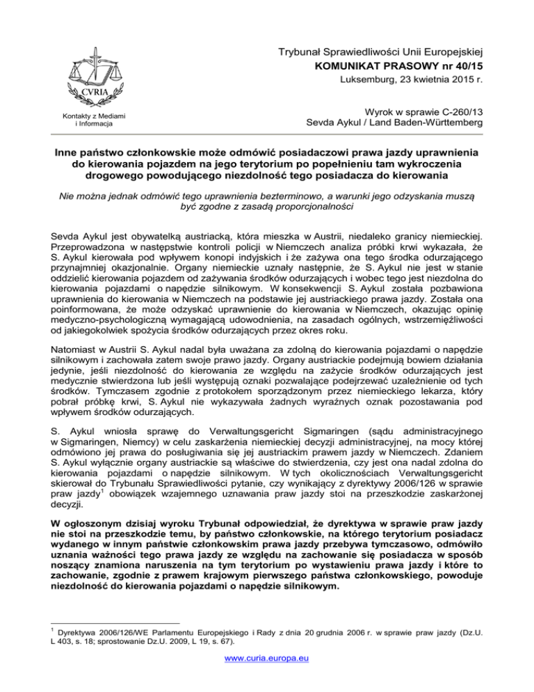 Trybunał Sprawiedliwości Unii Europejskiej KOMUNIKAT PRASOWY nr 40/15 Luksemburg, 23 kwietnia 2015 r. Kontakty z Mediami i Informacja Wyrok w sprawie C-260/13 Sevda Aykul / Land Baden-Württemberg Inne państwo członkowskie może odmówić posiadaczowi prawa jazdy uprawnienia do kierowania pojazdem na jego terytorium po popełnieniu tam wykroczenia drogowego powodującego niezdolność tego posiadacza do kierowania Nie można jednak odmówić tego uprawnienia bezterminowo, a warunki jego odzyskania muszą być zgodne z zasadą proporcjonalności Sevda Aykul jest obywatelką austriacką, która mieszka w Austrii, niedaleko granicy niemieckiej. Przeprowadzona w następstwie kontroli policji w Niemczech analiza próbki krwi wykazała, że S. Aykul kierowała pod wpływem konopi indyjskich i że zażywa ona tego środka odurzającego przynajmniej okazjonalnie. Organy niemieckie uznały następnie, że S. Aykul nie jest w stanie oddzielić kierowania pojazdem od zażywania środków odurzających i wobec tego jest niezdolna do kierowania pojazdami o napędzie silnikowym. W konsekwencji S. Aykul została pozbawiona uprawnienia do kierowania w Niemczech na podstawie jej austriackiego prawa jazdy. Została ona poinformowana, że może odzyskać uprawnienie do kierowania w Niemczech, okazując opinię medyczno-psychologiczną wymagającą udowodnienia, na zasadach ogólnych, wstrzemięźliwości od jakiegokolwiek spożycia środków odurzających przez okres roku. Natomiast w Austrii S. Aykul nadal była uważana za zdolną do kierowania pojazdami o napędzie silnikowym i zachowała zatem swoje prawo jazdy. Organy austriackie podejmują bowiem działania jedynie, jeśli niezdolność do kierowania ze względu na zażycie środków odurzających jest medycznie stwierdzona lub jeśli występują oznaki pozwalające podejrzewać uzależnienie od tych środków. Tymczasem zgodnie z protokołem sporządzonym przez niemieckiego lekarza, który pobrał próbkę krwi, S. Aykul nie wykazywała żadnych wyraźnych oznak pozostawania pod wpływem środków odurzających. S. Aykul wniosła sprawę do Verwaltungsgericht Sigmaringen (sądu administracyjnego w Sigmaringen, Niemcy) w celu zaskarżenia niemieckiej decyzji administracyjnej, na mocy której odmówiono jej prawa do posługiwania się jej austriackim prawem jazdy w Niemczech. Zdaniem S. Aykul wyłącznie organy austriackie są właściwe do stwierdzenia, czy jest ona nadal zdolna do kierowania pojazdami o napędzie silnikowym. W tych okolicznościach Verwaltungsgericht skierował do Trybunału Sprawiedliwości pytanie, czy wynikający z dyrektywy 2006/126 w sprawie praw jazdy1 obowiązek wzajemnego uznawania praw jazdy stoi na przeszkodzie zaskarżonej decyzji. W ogłoszonym dzisiaj wyroku Trybunał odpowiedział, że dyrektywa w sprawie praw jazdy nie stoi na przeszkodzie temu, by państwo członkowskie, na którego terytorium posiadacz wydanego w innym państwie członkowskim prawa jazdy przebywa tymczasowo, odmówiło uznania ważności tego prawa jazdy ze względu na zachowanie się posiadacza w sposób noszący znamiona naruszenia na tym terytorium po wystawieniu prawa jazdy i które to zachowanie, zgodnie z prawem krajowym pierwszego państwa członkowskiego, powoduje niezdolność do kierowania pojazdami o napędzie silnikowym. 1 Dyrektywa 2006/126/WE Parlamentu Europejskiego i Rady z dnia 20 grudnia 2006 r. w sprawie praw jazdy (Dz.U. L 403, s. 18; sprostowanie Dz.U. 2009, L 19, s. 67). www.curia.europa.eu Wprawdzie zgodnie z dyrektywą jedynie państwo członkowskie zwykłego miejsca zamieszkania posiadacza prawa jazdy jest uprawnione do przyjęcia środków ograniczających, zawieszających, cofających lub unieważniających prawo jazdy, które to środki wywołują skutki we wszystkich państwach członkowskich. Jednak dyrektywa upoważnia każde państwo członkowskie (a nie jedynie państwo członkowskie zwykłego miejsca zamieszkania) do zastosowania – na mocy jego krajowego prawa i z powodu noszącego znamiona naruszenia zachowania na jego terytorium posiadacza prawa jazdy wcześniej otrzymanego w innym państwie członkowskim – środków, których zakres jest ograniczony do tego terytorium, a skutki do odmowy uznania ważności prawa jazdy na tym terytorium. Zmuszenie państwa członkowskiego do uznania w sposób bezwarunkowy ważności prawa jazdy w sytuacji takiej jak ta będąca przedmiotem sporu byłoby sprzeczne z celem interesu ogólnego, który polega na poprawie bezpieczeństwa ruchu drogowego i który jest realizowany właśnie przez dyrektywę. Przyznana państwu członkowskiemu możliwość cofnięcia posiadaczowi prawa jazdy upoważnienia do kierowania na terytorium tego państwa, ze względu na popełnione na nim naruszenie, stanowi wprawdzie ograniczenie zasady wzajemnego uznawania praw jazdy, niemniej jednak ograniczenie to, które pozwala zmniejszyć ryzyko występowania wypadków drogowych, zwiększa bezpieczeństwo ruchu drogowego, co leży w interesie każdego obywatela. Ponadto Trybunał stwierdził, że państwo członkowskie, które odmawia uznania ważności prawa jazdy w sytuacji takiej jak ta będąca przedmiotem sporu, jest właściwe do ustalenia warunków, które posiadacz prawa jazdy musi spełnić, by odzyskać uprawnienie do kierowania pojazdami na terytorium tego państwa. Zważywszy bowiem, że odmowa uznania ważności prawa jazdy wydanego przez inne prawo członkowskie jest oparta na przepisach krajowych, które nie muszą koniecznie istnieć w prawie wydającego państwa członkowskiego, jest mało prawdopodobne, że prawo tego ostatniego państwa samo ustanawia warunki, które posiadacz prawa jazdy powinien spełnić w celu odzyskania uprawnienia do kierowania na terytorium innego państwa członkowskiego. Trybunał przywołał jednak swoje orzecznictwo, zgodnie z którym państwo członkowskie nie może bezterminowo odmawiać uznania ważności prawa jazdy wydanego przez inne państwo czł
