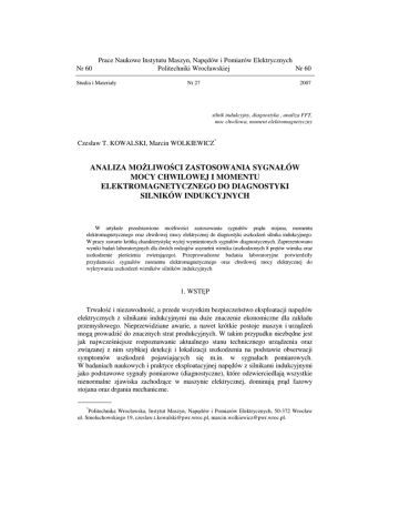 Prace Naukowe Instytutu Maszyn, Napędów i Pomiarów Elektrycznych Nr 60 Politechniki Wrocławskiej Nr 60 Studia i Materiały Nr 27 2007 silnik indukcyjny, diagnostyka , analiza FFT, moc chwilowa, moment elektromagnetyczny Czesław T. KOWALSKI, Marcin WOLKIEWICZ* ANALIZA MOŻLIWOŚCI ZASTOSOWANIA SYGNAŁÓW MOCY CHWILOWEJ I MOMENTU ELEKTROMAGNETYCZNEGO DO DIAGNOSTYKI SILNIKÓW INDUKCYJNYCH W artykule przedstawiono możliwości zastosowania sygnałów prądu stojana, momentu elektromagnetycznego oraz chwilowej mocy elektrycznej do diagnostyki uszkodzeń silnika indukcyjnego. W pracy zawarto krótką charakterystykę wyżej wymienionych sygnałów diagnostycznych. Zaprezentowano wyniki badań laboratoryjnych dla dwóch rodzajów asymetrii wirnika (uszkodzonych 8 prętów wirnika oraz uszkodzenie pierścienia zwierającego). Przeprowadzone badania laboratoryjne potwierdziły przydatności sygnałów momentu elektromagnetycznego oraz chwilowej mocy elektrycznej do wykrywania uszkodzeń wirników silników indukcyjnych 1. WSTĘP Trwałość i niezawodność, a przede wszystkim bezpieczeństwo eksploatacji napędów elektrycznych z silnikami indukcyjnymi ma duże znaczenie ekonomiczne dla zakładu przemysłowego. Nieprzewidziane awarie, a nawet krótkie postoje maszyn i urządzeń mogą prowadzić do znacznych strat produkcyjnych. W takim przypadku niezbędne jest jak najwcześniejsze rozpoznawanie aktualnego stanu technicznego urządzenia oraz związanej z nim szybkiej detekcji i lokalizacji uszkodzenia na podstawie obserwacji symptomów uszkodzeń pojawiających się m.in. w sygnałach pomiarowych. W badaniach naukowych i praktyce eksploatacyjnej napędów z silnikami indukcyjnymi jako podstawowe sygnały pomiarowe (diagnostyczne), które odzwierciedlają wszystkie nienormalne zjawiska zachodzące w maszynie elektrycznej, dominują prąd fazowy stojana oraz drgania mechaniczne. __________ * Politechnika Wrocławska, Instytut Maszyn, Napędów i Pomiarów Elektrycznych, 50-372 Wrocław ul. Smoluchowskiego 19, [email protected], [email protected]. W ostatnich latach pojawiły się publikacje wykazujące również dużą przydatność sygnałów mocy chwilowej i momentu elektromagnetycznego [1], [2], [3], [4]. Wydaje się, że szczególnie chwilowa moc elektryczna, ze względu na łatwość i nieinwazyjność pomiaru, może być sygnałem przydatnym w diagnostyce silników elektrycznych. Metody bezpośredniego pomiaru momentu elektromagnetycznego są dość kłopotliwe i w związku z tym, korzystniejsze mogą być tutaj pośrednie metody pomiaru oparte na jego estymacji na podstawie łatwo mierzalnych wielkości elektrycznych (prądów i napięć) [4]. W powyższych sygnałach poszukuje się przede wszystkim charakterystycznych częstotliwości, których amplituda jest cechą służącą do oceny poziomu uszkodzenia. Poniżej na przykładzie uszkodzeń wirnika klatkowego przedstawiono przydatność sygnału mocy elektrycznej i momentu elektromagnetycznego w diagnostyce silników indukcyjnych. 2. METODYKA BADAŃ LABORATORYJNYCH Badania laboratoryjne przeprowadzono na silniku indukcyjnym małej mocy typu STg 80x-4c (1,1 kW) firmy Besel. Uszkodzenia wirników były modelowane fizycznie poprzez celowe niszczenie (rozwiercanie) wybranych prętów i pierścienia zwierającego. Do wykrywania uszkodzeń wirników klatkowych silników indukcyjnych jedną z najczęściej stosowanych metod jest analiza częstotliwościowa sygnałów diagnostycznych. Metoda ta została wykorzystana do analizy sygnałów: 1. Prądu stojana isA(t), 2. Estymowanego momentu elektromagnetycznego mesty(t), 4. Całkowitej mocy czynnej p(t), 5. Częściowej mocy czynnej pCB(t). Do pomiarów i analizy częstotliwościowej sygnałów wykorzystano komputer przemysłowy NI PXI 8186 z kartą pomiarową NI PXI – 4472. Dokładnej oceny amplitud charakterystycznych częstotliwości dokonano za pomocą opracowanego przyrządu wirtualnego w środowisku LabView 7.1. Uzyskane widma częstotliwościowe zostały przedstawione w skali względnej. Jako odniesienie dla całkowitej mocy czynnej oraz momentu elektromagnetycznego przyjęto amplitudę składowej stałej (częstotliwość fdc = 0 Hz), dla prądu stojana – amplitudę składowej sieciowej (fs = 50 Hz). Amplitudę widma częściowych mocy czynnych odniesiono do składowej podwójnej sieciowej (2fs = 100 Hz). W takim przypadku objawem uszkodzenia wirnika silnika indukcyjnego, przy obciążeniu znamionowym jest wzrost amplitudy harmonicznej uszkodzeniowej powyżej wartości 0,01 w stosunku do amplitudy składowej podstawowej. W skali decybelowej różnica między składową podstawową a harmoniczną uszkodzeniową dla silnika nieuszkodzonego powinna być większa od 45 dB. Silnik należy bezwzględnie wyłączyć, jeżeli różnice w poziomach tych składowych są poniżej 35 dB [3], [4]. 3. ANALIZA CZĘSTOTLIWOŚCIOWA PRĄDU FAZOWEGO STOJANA Analiza widmowa prądu stojana, w literaturze określana często skrótem MCSA (Motor Current Signature Analysis) jest podstawą diagnostyki eksploatacyjnej silników indukcyjnych [3], [4]. W widmie prądu stojana uszkodzeniom wirnika towarzyszą składowe harmoniczne poślizgowe o częstotliwościach: f I = (1 ± 2ks ) f s , (1) Głównymi prążkami, które mówią bezpośrednio o uszkodzeniu klatki wirnika w widmie prądu są składowe poślizgowe wokół harmonicznej podstawowej 50Hz, określone według zależności (1). Dla silnika nieuszkodzonego (rys.1a) widmo częstotliwościowe zawiera oprócz składowej podstawowej o częstotliwości fs = 50 Hz, harmoniczną rotacyjną fr występującą w bocznych wstęgach częstotliwości podstawowej. Rysunek 1b dotyczy silnika z zamodelowanymi uszkodzeniami wirnika. W przebiegach widoczne są dodatkowe wahania amplitudy, które rosną wraz ze stopniem uszkodzenia. Można zauważyć, że w wyniku uszkodzenia wirnika w widmie prądu pojawiają się dodatkowe składowe poślizgowe o częstotliwościach 