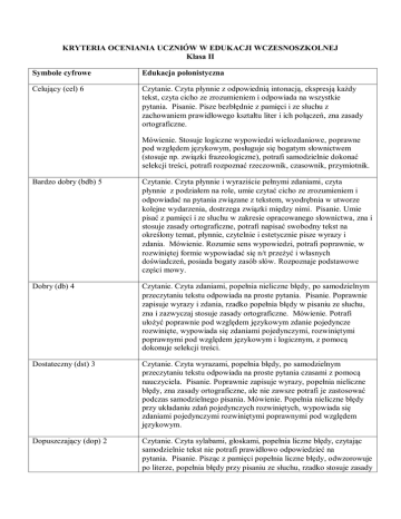 KRYTERIA OCENIANIA UCZNIÓW W EDUKACJI WCZESNOSZKOLNEJ Klasa II Symbole cyfrowe Edukacja polonistyczna (cel) 6 tekst, czyta cicho ze zrozumieniem i odpowiada na wszystkie pytania. , zna zasady ortograficzne. , czasownik, przymiotnik. Bardzo dobry (bdb) 5 , czyta . , zna i stosuj zdania. . Dobry (db) 4 , po samodzielnym przeczytaniu tekstu odpowiada na proste pytania. Pisanie. Poprawnie zapisuje wyrazy i zdania, rzadk , zna i zazwyczaj stosuje zasady ortograficzne. . Dostateczny (dst) 3 nauczyciela. Pisanie. Poprawnie zapisuje wyrazy, p . (dop) 2 pytania. , odwz , rzadko stosuje zasady ortograficzne. , wykazuje u Niedostateczny (ndst) 1 , opuszcza litery i wyrazy, nie stosuje zasad ortograficznych. . Symbole cyfrowe Edukacja matematyczna (cel) 6 wykonywania dz . , zawsze ze ). Bardzo dobry (bdb) 5 100 (bi . , rysunku, cznego. . Dobry (db) 4 , dzielenia. Samodzielnie dodaje i odejmuje i odejm . . Dostateczny (dst) 3 , dzielenia. . , rysunku, schematu . (dop) 2 , dzielenia. arytmetycznego. . Niedostateczny (ndst) 1 , dzielenia. dzielenia w zakresie 30. Zadania tekstowe. zad , rysunku, schematu z zasto . Symbole cyfrowe Edukacja społeczno – przyrodnicza (cel) 6 . Bardzo dobry (bdb) 5 roku, zna nazwy i i , owoce i warzywa, umie , przestrzega zasad i higieny. Dobry (db) 4 , zwykle okazuje szacunek dla innych ludzi, zazwyczaj przestrzega zasad higieny. – Dostateczny (dst) 3 ruchu drogowym, nie zawsze przestrzega zasad higieny. (dop) 2 . Niedostateczny (ndst) 1 w ruchu drogowym. Symbole cyfrowe Edukacja plastyczno –techniczna (cel) 6 . Bardzo dobry (bdb) 5 Dobry (db) 4 Za . Dostateczny (dst) 3 , prace wykonuje . (dop) 2 rozplanowaniem pracy. Niedostateczny (ndst) 1 czy pracy. Symbole cyfrowe Edukacja muzyczna (cel) 6 . Bardzo dobry (bdb) 5 . Dobry (db) 4 . Dostateczny (dst) 3 . (dop) 2 . Niedostateczny (ndst) 1 . Symbole cyfrowe Wychowanie fizyczne (cel) 6 zawodach sportowych na szczeblu miejskim. Bardzo dobry (bdb) 5 . Dobry (db) 4 – play. Dostateczny (dst) 3 zasad poznanych gier i zabaw, . (dop) 2 . Niedostateczny (ndst) 1 Uchyla s . UWAGA: Ocen an e podan c u ej no c do cz dz ec o p a dło oz oju z czn U ej no c dz ec n epełnosp a n c ocen a s s oso n e do c o oc. Symbole cyfrowe Zaj c a ko pu e o e (cel) 6 przewidzianym programem komputerowym. Jest . Bardzo dobry (bdb) 5 . Wykazuje , efektywnie wykorzystuje czas pracy. Dobry (db) 4 . Dostateczny (dst) 3 , zna podstawowe funkcje i opcje programu. (dop) 2 . Niedostateczny (ndst) 1 . Nie prze .