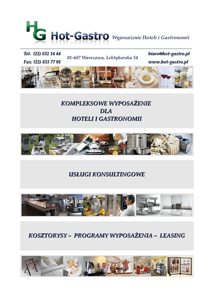 Wyposażenie Hoteli i Gastronomii Tel. (22) 832 14 44 Fax. (22) 833 77 01 01-687 Warszawa, Lektykarska 54 [email protected] www.hot-gastro.pl KOMPLEKSOWE WYPOSAŻENIE DLA HOTELI I GASTRONOMII USŁUGI KONSULTINGOWE KOSZTORYSY – PROGRAMY WYPOSAŻENIA – LEASING OFERTA WSPÓŁPRACY skierowana do właścicieli i inwestorów – firm, planujących inwestycje hotelowe oraz gastronomiczne, jak również modernizację istniejących obiektów HISTORIA DZIAŁALNOŚCI: Firma „Hot-Gastro” istnieje na rynku od 1995 roku. Inicjatorką i założycielką działalności, jest Urszula Zajączkowska, która w latach 80-tych rozpoczęła pracę w firmie „ORBIS S.A” w Dziale Zakupów i Inwestycji odpowiedzialnym za generalne zaopatrywanie hoteli sieci „Orbis”, co umożliwiło poznanie wymogów stawianych hotelom oraz standardów wyposażenia, a nawiązane kontakty z producentami polskimi i zagranicznymi, zaowocowały współpracą, która w wielu przypadkach trwa do dziś. Późniejsza praca dla firmy „Permadeck Joint Venture” budującej i wyposażającej hotele sieci Park oraz współpraca ze spółką „Polskie Hotele”, umożliwiła zdobycie kolejnych doświadczeń, a także członkostwa w „Zrzeszeniu Hoteli Polskich”. Ogromne potrzeby rynku oraz brak firm posiadających tak dużą znajomość branży HoReCa stały się inspiracją do rozpoczęcia własnej działalności – firmy „Hot-Gastro”, której celem od początku było nie tylko kompleksowe wyposażanie hoteli i gastronomii, ale przede wszystkim profesjonalne doradztwo bazujące na zdobytej wiedzy merytorycznej i praktycznej. Chcąc sprostać coraz większym wymaganiom Klientów, wychodząc na przeciw ich oczekiwaniom względem kompleksowej obsługi wraz z profesjonalnym doradztwem „Hot-Gastro” wciąż rozszerza swoją ofertę wprowadzając nowe produkty i podejmując współpracę w zakresie doradztwa z profesjonalistami z branży hotelarsko-gasronomicznej. Oferujemy Państwu kompleksową obsługę doradczą i wykonawczą w zakresie prowadzenia działalności hotelarsko-gastronomicznych począwszy od etapu planowania wraz z kosztorysem, poprzez projektowanie, pierwsze wyposażenie, wsparcie na etapie „Pre-Opening” i dalsze doposażenie, gwarantując płynność przejścia między poszczególnymi etapami oraz minimalizację kosztów. ZAKRES NASZYCH PRAC OBEJMUJE: • PROGRAMY WYPOSAŻENIA - tworzenie programów wyposażeniowych dla hoteli, z uwzględnieniem wymogów jakościowych i ilościowych, w zależności od zakładanego standardu, wraz z dokładną wyceną na potrzeby zewnętrznego finansowania, • PROJEKTY TECHNOLOGICZNE - nadzór nad funkcjonalnym wykonaniem, • WENTYLACJA – projekty techniczne, klimatyzacja, audyty, certyfikaty, serwis • DOBÓR SPRZĘTU - dobór sprzętu gastronomicznego pod projekty technologiczne i ich weryfikację co do zgodności z wymogami HACCP i ustawienia ergonomicznego urządzeń, • WYPOSAŻENIE - dostawy kompleksowego wyposażenia kuchni i zapleczy kuchennych, sal konsumenckich, barów i części hotelowej, • DORADZTWO TECHNICZNE - konsultacje na etapie powstawania projektu architektoniczno- budowlanego, montaż i uruchomienie urządzeń wraz z serwisem, • LEASING - leasing urządzeń gastronomicznych, FRPiIL • REKLAMA - nadzór marketingowy, kreacja, projekty graficzne, materiały reklamowe. ZAKRES NASZYCH DOSTAW OBEJMUJE: GASTRONOMIA HOTEL KUCHNIA I ZAPLECZA KUCHENNE:.......... POKOJE:.......................................................... ✔ ✔ ✔ ✔ ✔ ✔ ✔ meble technologiczne ciągi gastronomiczne urządzenia grzewcze i chłodnicze piece konwekcyjno-parowe sprzęt drobny i akcesoria kuchenne akcesoria HACCP i środki czystości odzież gastronomiczna ✔ ✔ ✔ ✔ ✔ bielizna pościelowa, pościel, narzuty i koce, dekoracja okien bagażniki składane - koziołki dostawki hotelowe i minibary zestawy gościnne i sejfy hotelowe prasowalnice, zestawy do prasowania i wieszaki ZMYWALNIE:..................................................... ŁAZIENKI:....................................................... ✔ ✔ ✔ ✔ zmywarki podblatowe, zmywarki kapturowe, zmywarki tunelowe do szkła, talerzy zmywarki do garów i tac ✔ ✔ ✔ ✔ ręczniki hotelowe, dywaniki, szlafroki kosmetyki hotelowe i galanteria suszarki do rąk i włosów dozowniki mydła i podajniki papieru MAGAZYNY:....................................................... KORYTARZE I HOLE:.................................. regały i skrzynki magazynowe pojemniki do magazynowania i przechowywania żywności ✔ wózki na składniki żywnościowe ✔ ✔ ✔ ✔ ✔ ✔ kosze na śmieci koszopopielnice i popielnice barierki hotelowe - przegrody maszyny do czyszczenia obuwia SPRZĘT CATERINGOWY:............................... RECEPCJA:..................................................... ✔ ✔ ✔ wózki i kosze do transportu szkła i talerzy pojemniki termoizolacyjne termosy cateringowe i tace ✔ ✔ ✔ sejfy hotelowe szafki depozytowe szafki na klucze WYPOSAŻENIE BARU:.................................... WÓZKI HOTELOWE:................................... ✔ ✔ ✔ ✔ ✔ kostkarki i kruszarki blendery barowe i wyciskarki do cytrusów ekspresy do kawy i akcesoria baristyczne sprzęt drobny i akcesoria barmańskie hokery barowe ✔ ✔ ✔ ✔ ✔ wózki bagażowe wózki do obsługi pięter wózki na bieliznę wózki room-service wózki serwisowe WYPOSAŻENIE SAL KONFERENCYJNO-BANKIETOWYCH I RESTAURACYJNYCH: ✔ ✔ ✔ ✔ ✔ ✔ ✔ ✔ stoły i krzesła restauracyjne oraz składane zastawa stołowa – porcelana, sztucćce, szkło bielizna stołowa, przywieszki do stołów bankietowych, pokrowce na krzesła zastawa korpusowa, tace lustrzane i patery wielopoziomowe samowary, dystrybutory napojów, termosy i warniki podgrzewacze gastronomiczne, kociołki do zup i bemary lady samoobsługowe i bufety sałatkowe wózki restauracyjne i barmańskie WSPÓŁPRACUJEMY z producentami po