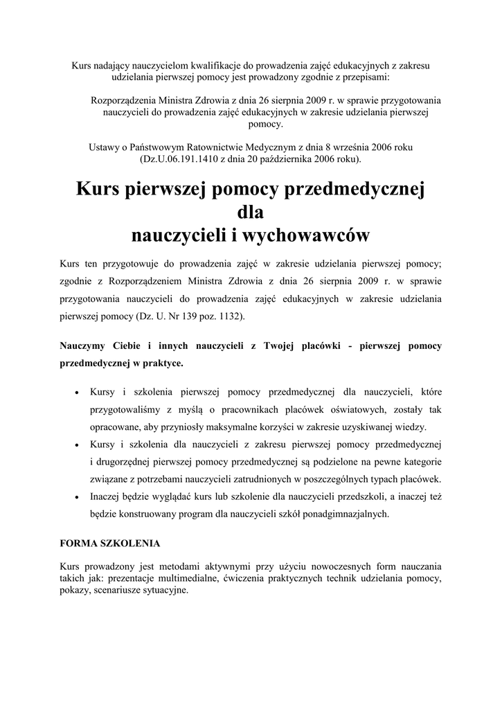 Kurs nadający nauczycielom kwalifikacje do prowadzenia zajęć edukacyjnych z zakresu udzielania pierwszej pomocy jest prowadzony zgodnie z przepisami: Rozporządzenia Ministra Zdrowia z dnia 26 sierpnia 2009 r. w sprawie przygotowania nauczycieli do prowadzenia zajęć edukacyjnych w zakresie udzielania pierwszej pomocy. Ustawy o Państwowym Ratownictwie Medycznym z dnia 8 września 2006 roku (Dz.U.06.191.1410 z dnia 20 października 2006 roku). Kurs pierwszej pomocy przedmedycznej dla nauczycieli i wychowawców Kurs ten przygotowuje do prowadzenia zajęć w zakresie udzielania pierwszej pomocy; zgodnie z Rozporządzeniem Ministra Zdrowia z dnia 26 sierpnia 2009 r. w sprawie przygotowania nauczycieli do prowadzenia zajęć edukacyjnych w zakresie udzielania pierwszej pomocy (Dz. U. Nr 139 poz. 1132). Nauczymy Ciebie i innych nauczycieli z Twojej placówki - pierwszej pomocy przedmedycznej w praktyce.  Kursy i szkolenia pierwszej pomocy przedmedycznej dla nauczycieli, które przygotowaliśmy z myślą o pracownikach placówek oświatowych, zostały tak opracowane, aby przyniosły maksymalne korzyści w zakresie uzyskiwanej wiedzy.  Kursy i szkolenia dla nauczycieli z zakresu pierwszej pomocy przedmedycznej i drugorzędnej pierwszej pomocy przedmedycznej są podzielone na pewne kategorie związane z potrzebami nauczycieli zatrudnionych w poszczególnych typach placówek.  Inaczej będzie wyglądać kurs lub szkolenie dla nauczycieli przedszkoli, a inaczej też będzie konstruowany program dla nauczycieli szkół ponadgimnazjalnych. FORMA SZKOLENIA Kurs prowadzony jest metodami aktywnymi przy użyciu nowoczesnych form nauczania takich jak: prezentacje multimedialne, ćwiczenia praktycznych technik udzielania pomocy, pokazy, scenariusze sytuacyjne. PROGRAM KURSU Moduł Tematyka Teoria Praktyka Razem 1 Podstawy anatomii i fizjologii człowieka. 30 min 30 min 60 minut 2 Wezwanie pomocy. Uruchomienie systemu ratownictwa medycznego, rola świadka zdarzenia w łańcuchu przeżycia. 15 min 30 min 45 minut 3 Bezpieczeństwo własne, poszkodowanego, miejsca zdarzenia. 15 min - 15 minut 4 Poszkodowany nieprzytomny. Zagrożenia wynikające z utraty przytomności, pozycja bezpieczna. 15 min 15 min 30 minut 120 min 180 min 300 minut 30 min 30 min 60 minut 45 min 90 min 135 minut Resuscytacja krążeniowo – oddechowa 5    osoby dorosłej dziecka niemowlęcia Defibrylacja z użyciem automatycznego defibrylatora AED 6 7 Zadławienia. Pierwsza pomoc w zadławieniu u osób dorosłych i dzieci. ) Urazy i skutki urazów. Zasady udzielania pierwszej pomocy ofiarom urazów oraz porażenia prądem, podtopienia, ukąszenia, użądlenia. 8 Tamowanie krwotoków zewnętrznych i opatrywanie ran powierzchniowych. 30 min 45 min 75 minut 9 Wstrząs - zasady postępowania przeciwwstrząsowego, 30 min 15 min 45 minut 10 Unieruchomienie złamań i zwichnięć. 30 min 45 min 75 minut 11 Pierwsza pomoc w przypadku wychłodzenia i przegrzania. Działanie wysokiej i niskiej temperatury na organizm człowieka. Oparzenia termiczne i chemiczne, odmrożenia. 30 min 30 min 60 min 12 Nagłe zachorowania i inne stany zagrożenia zdrowotnego. Omdlenia, zawał serca, napad drgawek, udar mózgu, astma oskrzelowa, reakcja alergiczna. 90 min 30 min 120 minut 13 Zatrucia. Zasady udzielania pomocy w przypadku zatruć 30 min 15 min 45 minut 14 Wsparcie psychiczne poszkodowanego. 45 min 90 min 135 minut 15 Ewakuacja ze strefy zagrożenia. Zachowanie na miejscu wypadku. Ocena zagrożenia i zasady postępowania w zakresie pierwszej 30 min pomocy. 30 min 60 minut 16 Udzielanie pierwszej pomocy w sytuacjach symulowanych. - 90 min 13 godz 17 godz Razem 90 minut 30 godzin Zajęcia prowadzone są metodą warsztatową – wykład obejmujący podstawy teoretyczne na przemian z pracą w grupach i ćwiczeniami praktycznymi. Stworzony by wyszkolić nauczycieli i opiekunów przedszkoli, szkół podstawowych, gimnazjów, szkół średnich i uczelni wyższych. Jak należy reagować, kiedy jest się świadkiem nieszczęśliwego zdarzenia: zasłabnięcia, utraty przytomności, zadławienia, silnego krwawienia, zawały serca, drgawkach, hiper i hipoglikemii. Jak wykonać skutecznie resuscytację krążeniowo-oddechową. Jak użyć Automatycznego Defibrylatora Zewnętrznego (AED). Oferta szkoleniowa jest elastyczna i dopasowana do indywidualnych potrzeb i oczekiwań, tematyka jest dostosowana do specyfiki wykonywanej przez uczestników pracy. Szkolenie takie w żadnej mierzenie przypomina tradycyjnie nudnych wykładów z dziedziny BHP, które „trzeba odbyć”, a pracujący u nas instruktorzy, to ludzie na co dzień pracujący w systemie ratownictwa, specjaliści medycyny ratunkowej, którzy niezależnie od wysokiej jakości samego szkolenia prowadzą zajęcia w niezwykle atrakcyjny i dynamiczny sposób. Uczestnicy otrzymują certyfikaty potwierdzające udział w szkoleniu ważny 5 lat! oraz konspekty, materiały edukacyjne (plakaty, ulotki) materiały metodyczno-dydaktyczne do prowadzenia zajęć z pierwszej pomocy, pakiet z medykamentami do prowadzenia podstawowych zabiegów ratujących życie. Podstawowe informacje o egzaminie Sposób ukończenia/zaliczenia Egzamin z zakresu wiedzy i umiejętności objętych szkolenia programem kursu. Egzamin teoretyczny - test Forma egzaminu Egzamin praktyczny Czas trwania: 30h (w systemie weekendowym – sobota, niedziela) Cena: 550zł (przy liczbie 10 osób)