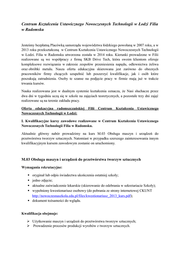 Centrum Kształcenia Ustawicznego Nowoczesnych Technologii w Łodzi Filia w Radomsku Jesteśmy bezpłatną Placówką samorządu województwa łódzkiego powołaną w 2007 roku, a w 2013 roku przekształconą w Centrum Kształcenia Ustawicznego Nowoczesnych Technologii w Łodzi. Filia w Radomsku utworzona została w 2014 roku. Kierunki prowadzone w Filii realizowane są we współpracy z firmą SKB Drive Tech, która swoim klientom oferuje kompleksowe rozwiązania w zakresie zespołów przeniesienia napędu, odlewnictwa żeliwa oraz obróbki metalu. Nasza oferta edukacyjna skierowana jest zarówno do obecnych pracowników firmy chcących uzupełnić lub poszerzyć kwalifikacje, jak i osób które poszukują zatrudnienia. Osoby te szanse na podjęcie pracy w firmie mają już w trakcie trwania kursów. Nauka realizowana jest w dualnym systemie kształcenia oznacza, że Nasi słuchacze przez dwa dni w tygodniu uczą się w szkole na zajęciach teoretycznych, a pozostałe trzy dni zajęć realizowane są na terenie zakładu pracy. Oferta edukacyjna radomszczańskiej Nowoczesnych Technologii w Łodzi: Filii Centrum Kształcenia Ustawicznego I. Kwalifikacyjne kursy zawodowe realizowane w Centrum Kształcenia Ustawicznego Nowoczesnych Technologii Filia w Radomsku. Aktualnie główny nabór prowadzimy na kurs M.03 Obsługa maszyn i urządzeń do przetwórstwa tworzyw sztucznych. Natomiast w przypadku szerszego zainteresowania innym kwalifikacyjnym kursem zawodowym zostanie on uruchomiony. M.03 Obsługa maszyn i urządzeń do przetwórstwa tworzyw sztucznych Wymagania rekrutacyjne: oryginał lub odpis świadectwa ukończenia ostatniej szkoły; jedno zdjęcie; aktualne zaświadczenie lekarskie (skierowanie do odebrania w sekretariacie Szkoły); wypełniony kwestionariusz osobowy (do pobrania ze strony internetowej CKUNT http://nowoczesnaszkola.edu.pl/files/kwestionariusz_2013_kurs.pdf); dokument tożsamości do wglądu. Kwalifikacja obejmuje: Użytkowanie maszyn i urządzeń do przetwórstwa tworzyw sztucznych; Prowadzenie procesów produkcji wyrobów z tworzyw sztucznych. Kurs trwa ok. 1 roku szkolnego (10 miesięcy) Absolwent kwalifikacyjnego kursu zawodowego w zawodzie Operator maszyn i urządzeń do przetwórstwa tworzyw sztucznych będzie przygotowany do wykonywania następujących zadań zawodowych: użytkowania maszyn, urządzeń i narzędzi stosowanych w procesie przetwórstwa tworzyw sztucznych; wytwarzania wyrobów z tworzyw sztucznych; nadzorowania i kontrolowania procesów produkcji wyrobów z tworzyw sztucznych; wykonywania przeglądów, regulacji oraz konserwacji maszyn, urządzeń i narzędzi stosowanych w przetwórstwie tworzyw sztucznych. Absolwent kursu, który uzyska zaświadczenie o ukończeniu kursu i zda egzamin w zakresie kwalifikacji przeprowadzany przez Okręgową Komisję Egzaminacyjną otrzymuje świadectwo potwierdzające kwalifikacje w zawodzie i dodatkowo jeśli posiada co najmniej lub uzupełni wykształcenie do poziomu zasadniczego zawodowego otrzyma dyplom potwierdzający kwalifikacje w zawodzie i tytuł zawodowy Operator maszyn i urządzeń do przetwórstwa tworzyw sztucznych. Nabór trwa, a zajęcia rozpoczną się we wrześniu 2016r. Więcej informacji znajduje się na Naszej stronie internetowej: http://nowoczesnaszkola.edu.pl/files/kursy/Informator_Kkz_M3.pdf E.07 Montaż i konserwacja maszyn i urządzeń elektrycznych Wymagania rekrutacyjne: oryginał lub odpis świadectwa ukończenia ostatniej szkoły; jedno zdjęcie; aktualne zaświadczenie lekarskie (skierowanie do odebrania w sekretariacie Szkoły); wypełniony kwestionariusz osobowy (do pobrania ze strony internetowej CKUNT http://nowoczesnaszkola.edu.pl/files/kwestionariusz_2013_kurs.pdf); dokument tożsamości do wglądu. Kwalifikacja obejmuje: Montaż maszyn i urządzeń elektrycznych; Konserwacja maszyn i urządzeń elektrycznych. Cały kurs trwa ok. 1 roku szkolnego (10 miesięcy) Absolwent kwalifikacyjnego kursu zawodowego w zawodzie Elektromechanik będzie przygotowany do wykonywania następujących zadań zawodowych: klasyfikowania maszyn i urządzeń elektrycznych według określonych kryteriów; określania i rozróżniania parametrów technicznych maszyn i urządzeń elektrycznych; rozpoznawania maszyn i urządzeń elektrycznych oraz ich elementów; rozpoznawania układów zasilania, sterowania i zabezpieczenia maszyn i urządzeń elektrycznych oraz ich elementów; odczytywania i sporządzania rysunków oraz schematów maszyn i urządzeń elektrycznych; wykonywania montażu mechanicznego podzespołów elektrycznych i elektronicznych; montowania układów zasilania, sterowania, regulacji oraz zabezpieczenia maszyn i urządzeń elektrycznych na podstawie dokumentacji; wykonywania pomiarów parametrów maszyn i urządzeń elektrycznych. Osoba, która uzyska zaświadczenie o ukończeniu kursu i zda egzamin w zakresie kwalifikacji E.07 przeprowadzany przez Okręgową Komisję Egzaminacyjną otrzymuje świadectwo potwierdzające kwalifikacje w zawodzie i dodatkowo jeśli posiada co najmniej lub uzupełni wykształcenie do poziomu zasadniczego zawodowego otrzyma dyplom potwierdzający kwalifikacje w zawodzie i tytuł zawodowy elektromechanik. Więcej informacji znajduje się na Naszej stronie internetowej: http://nowoczesnaszkola.edu.pl/files/kursy2014-2015/V_Informator_Kkz_E7.pdf M.04 Użytkowanie maszyn i urządzeń do wykonywania odlewów Wymagania rekrutacyjne: oryginał lub odpis świadectwa ukończenia ostatniej szkoły; jedno zdjęcie; aktualne zaświadczenie lekarskie (skierowanie do odebrania w sekretariacie Szkoły); wypełniony kwestionariusz osobowy (do pobrania ze strony internetowej CKUNT http://nowoczesnaszkola.edu.pl/files/kwestionariusz_2013_kurs.pdf); dokument tożsamości do wglądu. Kwalifikacja obejmuje: Użytkowanie maszyn i urządzeń do przygotowania mas formierskich. Użytkowanie maszyn i urządzeń do wykonywania odlewów w formach nietrwałych. Użytkowanie maszyn i urząd