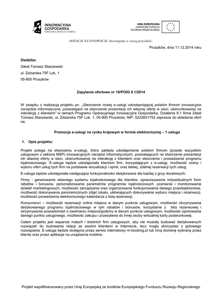 DOTACJE NA INNOWACJE. Inwestujemy w waszą przyszłość. Pruszków, dnia 11.12.2014 roku Siedziba: 2deal Tomasz Staszewski ul. Zdziarska 75F Lok. 1 05-800 Pruszków Zapytanie ofertowe nr 10/POIG 8.1/2014 W związku z realizacją projektu pn. „Stworzenie nowej e-usługi udostepniającej polskim firmom innowacyjne narzędzia informatyczne, pozwalające na stworzenie prezentacji ich własnej oferty w sieci, ukierunkowanej na interakcję z klientami” w ramach Programu Operacyjnego Innowacyjna Gospodarka, Działanie 8.1 firma 2deal Tomasz Staszewski, ul. Zdziarska 75F Lok. 1, 05-800 Pruszków, NIP: 5222651752 zaprasza do składania ofert na: Promocja e-usługi na rynku krajowym w formie elektronicznej – 1 usługa 1. Opis projektu: Projekt polega na stworzeniu e-usługi, która zakłada udostępnienie polskim firmom (przede wszystkim usługowym z sektora MSP) innowacyjnych narzędzi informatycznych, pozwalających na stworzenie prezentacji ich własnej oferty w sieci, ukierunkowanej na interakcję z klientami oraz stworzenie i prowadzenie programu lojalnościowego. E-usługa będzie udostępniała klientom firm, korzystającym z e-usługi, możliwość oceny i wyboru ofert usług tych firm na podstawie wizualizacji i opinii, oraz łatwej, zdalnej rezerwacji tych usług. E-usługa będzie udostępniała następujące funkcjonalności dedykowane dla każdej z grup docelowych: Firmy - generowanie własnego systemu lojalnościowego dla klientów, opracowywanie indywidualnych form rabatów i bonusów, personalizowanie parametrów programów lojalnościowych ,ocenianie i monitorowanie działań marketingowych, możliwość zarządzania oraz organizowania funkcjonowania danego przedsiębiorstwa, możliwość dokonywania panoramicznych zdjęć lokalu, ułatwiających dokonywanie wyboru miejsca i rezerwacji, możliwość prowadzenia elektronicznego kalendarza z listą rezerwacji. Konsumenci – możliwość rezerwacji online miejsca w danym punkcie usługowym, możliwość otrzymywania dedykowanego programu lojalnościowego w tym rabatów i bonusów, korzystanie z listy rezerwowej i otrzymywania powiadomień o zwolnieniu miejsca/godziny w danym punkcie usługowym, możliwość opiniowania danego punktu usługowego, możliwość zakupu i przesyłania do innej osoby wirtualnej karty podarunkowej. Celem projektu jest wsparcie małych i średnich firm usługowych, aby nie musiały budować dedykowanych rozwiązań do budowania relacji ze swoimi klientami w Internecie, lecz mogły skorzystać z gotowego rozwiązania. E-usługa będzie dostępna przez serwis internetowy m-booking.pl lub inną domenę wybraną przez klienta oraz przez aplikacje na urządzenia mobilne. Projekt współfinansowany przez Unię Europejską ze środków Europejskiego Funduszu Rozwoju Regionalnego DOTACJE NA INNOWACJE. Inwestujemy w waszą przyszłość. 2. Opis oczekiwanego produktu: Działania promocjne, mimo świadczenia jednej e-uslugi muszą byc skierowane i dopasowane do potrzeb dwóch różnych grup docelowych, tj. Firm i Konsumentów. Celem działań promocyjnych będzie bardzo precyzyjne dotarcie do grup docelowych, umożliwiające dokładną prezentacje najważniejszych użytecznych dla użytkowników cech e-usługi, stąd też w planowanych działaniach promocyjnych należy położyć duży nacisk na kontekstowe docieranie do potencjalnych odbiorców w momencie, kiedy poszukują konkretnych informacji i rozwiązań. Celem promocji będzie stymulowanie popytu na e-usługę i poinformowanie (zwiększenie rozpoznawalności e-usługi) grupy docelowej o nowych narzędziach, a w konsekwencji przekonanie jak największej liczby potencjalnych odbiorców do skorzystania z e-usługi. a) Działania promocyjne muszą obejmować: SEM -> SEO (pozycjonowanie); SEM -> PPC (linki sponsorowane); Portale społecznościowe (np. Facebook, Twitter, Google+, LinkedIn); Stworzenie mailblasta - mailing (masowa wysyłka e-maili); Fora dyskusyjne; Spoty reklamowe. b) Oczekiwany harmonogram i zakres działań promocyjnych: Działanie / Termin 02.01.2015 – 30.04.2015 SEM -> SEO Wyselekcjonowanie grupy słów i fraz kluczowych Rozpoczęcie pozycjonowania SEO, zarówno dla Firm i Konsumentów Portale społecznościowe Założenie profilu na: Google+, Twitter, LinkedIn + aktualizacja profilu na Facebook Rozpoczęcie komunikacji do potencjalnych klientów SEM -> PPC Wybór słów kluczowych i rozpoczęcie kampanii AdWords do Firm Mailing – stworzenie mailblasta Przygotowanie bazy adresów e-mail do Firm Przygotowanie kreacji mailngowej Wysyłka wiadomości do Firm Fora dyskusyjne Identyfikacja kluczowych miejsc w internecie Umieszczanie postów tematycznych Spoty reklamowe Wyselekcjonowanie bazy docelowych klientów Stworzenie spotu reklamowego Realizacja kampanii wideo dla Firm 01.05.2015 – 20.08.2015 Aktualizacjagrupy słów i fraz kluczowych Kontynuacja działań SEO, zarówno dla Firm i Konsumentów Stała komunikacja do potencjalnych klientów Aktualizacja informacji o e-usłudze na portalach społecznościowych Aktualizacja słów kluczowych i kontynuacja kampanii Adwords AdWords do Firm i Konsumentów Przygotowanie bazy adresów e-mail do Konsumentów i aktualizacja bazy adresów e-mail do Firm Przygotowanie kreacji mailngowych dla Konsumentów i aktualizacja kreacji mailingowej dla Firm Wysyłka wiadomości do Firm i Konsumentów Aktualizacja kluczowych miejsc w internecie Umieszczanie postów tematycznych Aktualizacja bazy docelowych klientów Aktualizacja spotu reklamowego Realizacja kampanii wideo dla Firm i Konsumentów c) Dodatkowo firma 2deal Tomasz Staszewski na etapie realizacji udostępni: Strategie promocji opisującą szczegółowo zakres działań promocyjnych; Specyfikację funkcjonalną e-usługi; Działającą e-usługę. Projekt współfinansowany przez Unię Europejską ze środków Europejskiego Funduszu Rozwoju Regionalnego DOTACJE NA INNOWACJE. Inwestujemy w waszą przyszłość. 3. Zastrzeżenia a) Zamawiający z