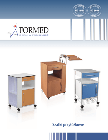 Szafki przyłóżkowe KIWI, KIWI PLUS Szafka przyłóżkowa KIWI oraz KIWI PLUS stanowi podstawowe wyposażenie sal chorych lub domów opieki. Jest bardzo prosta w obsłudze a dodatkowy blat boczny (KIWI PLUS) znacznie zwiększa komfort i wygodę użytkowania. Szafka KIWI posiada możliwość doposażenia jej w blat boczny już w trakcie użytkowania w prosty, niewymagający specjalistycznych narzędzi sposób. Dodatkowo blat boczny można przekładać na prawą lub lewą stronę szafki. W celu zwiększenia funkcjonalności blat boczny posiada funkcję bezstopniowej regulacji wysokości oraz regulację przechyłu bocznego realizowaną stopniowo do 30° lub do 60°. Konstrukcja szafki wykonana jest z blachy ocynkowanej stalowej, rurek metalowych i profili stalowych pokrytych lakierem proszkowym epoksydowym, odpornym na mycie, dezynfekcję szpitalną, uszkodzenia mechaniczne oraz promieniowanie UV. Blaty szafki wykonane są z płyty meblowej a opcjonalnie z płyty HPL. Szuflada posiada wysuw na prowadnicach rolkowych i jest wyposażona w dzielony wkład tworzywowy z możliwością jego wyjęcia do mycia i dezynfekcji, a drzwiczki posiadają zawiasy z funkcją samodomykania. Do otwierania drzwiczek oraz szuflady służą chromowane, zaokrąglone uchwyty. Szafka jest mobilna dzięki czterem podwójnym tworzywowym kołom niebrudzącym podłoża, z których dwa posiadają blokadę. Dodatkowe piąte koło (KIWI PLUS) zwiększa mobilność i stabilność szafki przy rozłożonym blacie bocznym. Na tylnej ściance znajdują się haczyki do zawieszania ręczników. W opcji szafka może posiadać dolną półkę przeznaczoną na basen, obuwie lub inne podręczne rzeczy pacjenta oraz kosz na butelki montowany z boku szafki. Istnieje możliwość wyboru kolorystyki lakieru drzwiczek i czoła szuflad z wzornika FORMED. KIWI PLUS DANE TECHNICZNE: Szerokość całkowita szafki: 420 mm Szerokość całkowita szafki z podporą pod blat: 630 mm (KIWI PLUS) Głębokość całkowita: 430 mm Szerokość x głębokość blatu bocznego: 530 x 340 mm (KIWI PLUS) Wysokość: 820 mm Regulacja wysokości blatu bocznego: 800 do 1200 mm (KIWI PLUS) Średnica kół jezdnych: 50 mm Zastrzega się możliwość modyfikacji wyrobu w wyniku postępu technicznego i indywidualnych wymagań klienta. Wyrób medyczny spełnia wymogi bezpieczeństwa zgodnie z Dyrektywą Europejską 93/42/EEC oraz Ustawą o wyrobach medycznych. KIWI PLUS KIWI Kolorystyka (szafki Emu, Emu Plus, Kiwi, Kiwi Plus) Elementy metalowe szafek pokryte są standardowo lakierem proszkowym w kolorze RAL 9002. Czoła drzwiczek i szuflad lakierowane są według standardowej podanej niżej kolorystyki. Biały Granatowy Szary Beżowy Seledynowy Łososiowy Niebieski Turkusowy Kolory prezentowane w katalogu mogą nieznacznie odbiegać od rzeczywistości z przyczyn drukarsko-technicznnych. 22 www.formed.eu.pl www.formed.eu.pl EMU, EMU PLUS Szafka przyłóżkowa EMU oraz EMU PLUS przeznaczona jest do przechowywania rzeczy osobistych pacjentów na wszystkich oddziałach szpitalnych. Zastosowane rozwiązania konstrukcyjne w postaci dwustronnie wysuwanej szuflady oraz podwójnych drzwiczek stanowią o jej uniwersalności i umożliwiają ustawianie z lewej lub prawej strony łóżka. Konstrukcja szafki wykonana jest z profili stalowych i blachy stalowej ocynkowanej pokrytych lakierem proszkowym epoksydowym odpornym na mycie, dezynfekcję szpitalną, uszkodzenia mechaniczne oraz promieniowanie UV. Szafka EMU PLUS posiada dodatkowy blat boczny z bezstopniową regulacją wysokości realizowaną przy pomocy sprężyny gazowej oraz funkcję przechyłu bocznego do 30° lub do 60°. Blat boczny jest składany do wnęki z boku szafki dzięki czemu nie wystaje poza gabaryty zewnętrzne szafki. Szafka EMU nie posiada blatu bocznego – za to posiada wnękę z tworzywowym dwupoziomowym wkładem i zabezpieczeniem poprzez pręty przed wypadaniem przedmiotów. Wkład ten służy do przechowywania butelek, gazet lub innych rzeczy podręcznych pacjenta. Drzwiczki szafki wyposażone są w zawiasy z funkcją samodomykania. Blaty szafki wykonane są z płyty HPL odpornej na mycie i dezynfekcję. Opcjonalnie mogą być wykonane z tworzywa ABS. Szuflada szafki wyposażona jest w tworzywowy dzielony wkład z możliwością jego wyjęcia do mycia i dezynfekcji. Szafka jest mobilna dzięki czterem tworzywowym podwójnym kołom niebrudzącym podłoża, z których dwa posiadają blokadę. Do otwierania drzwiczek lub szuflady służą chromowane zaokrąglone uchwyty. W opcji szafka może posiadać dolną półkę na basen, obuwie lub inne podręczne rzeczy pacjenta, kosz na butelki montowany z boku szafki oraz poziomą wyjmowaną półkę dzielącą wnętrze na dwie części. Istnieje możliwość wyboru kolorystyki lakieru drzwiczek i czoła szuflad z wzornika FORMED. EMU PLUS EMU DANE TECHNICZNE: Szerokość całkowita: 510 mm Głębokość całkowita: 400 mm Szerokość x głębokość blatu bocznego: 590 x 340 mm (EMU PLUS) Regulacja wysokości blatu bocznego: 740 do 1040 mm (EMU PLUS) Wysokość szafki : 840 mm Obciążenie blatu stałego: 20 kg Obciążenie blatu bocznego: 5 kg (EMU PLUS) Średnica kół jezdnych: 50 mm EMU Zastrzega się możliwość modyfikacji wyrobu w wyniku postępu technicznego i indywidualnych wymagań klienta. Wyrób medyczny spełnia wymogi bezpieczeństwa zgodnie z Dyrektywą Europejską 93/42/EEC oraz Ustawą o wyrobach medycznych. www.formed.eu.pl 33 RAVEN, RAVEN PLUS Szafka przyłóżkowa RAVEN wykonana jest z płyty meblowej i przeznaczona jest do wyposażania domów opieki lub zakładów opiekuńczo-leczniczych. Szafka RAVEN PLUS posiada blat boczny z bezstopniową regulacją wysokości realizowaną przy pomocy sprężyny gazowej oraz funkcją przechyłu bocznego do 30° lub do 60°. Blat ten może być złożony do wnęki z boku szafki dzięki czemu nie wystaje poza gabaryty zewnętrzne szafki. Szafka RAVEN nie posiada blatu bocznego, za to z boku znajduje s