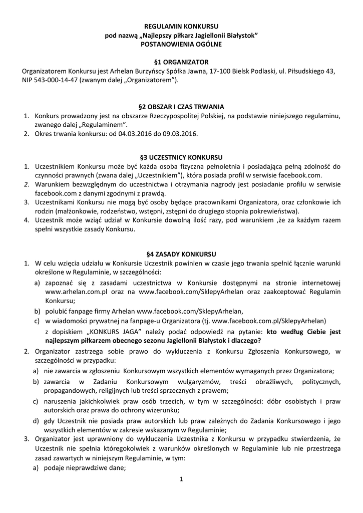 REGULAMIN KONKURSU pod nazwą „Najlepszy piłkarz Jagiellonii Białystok” POSTANOWIENIA OGÓLNE §1 ORGANIZATOR Organizatorem Konkursu jest Arhelan Burzyńscy Spółka Jawna, 17-100 Bielsk Podlaski, ul. Piłsudskiego 43, NIP 543-000-14-47 (zwanym dalej „Organizatorem”). §2 OBSZAR I CZAS TRWANIA 1. Konkurs prowadzony jest na obszarze Rzeczypospolitej Polskiej, na podstawie niniejszego regulaminu, zwanego dalej „Regulaminem”. 2. Okres trwania konkursu: od 04.03.2016 do 09.03.2016. 1. 2. 3. 4. §3 UCZESTNICY KONKURSU Uczestnikiem Konkursu może być każda osoba fizyczna pełnoletnia i posiadająca pełną zdolność do czynności prawnych (zwana dalej „Uczestnikiem”), która posiada profil w serwisie facebook.com. Warunkiem bezwzględnym do uczestnictwa i otrzymania nagrody jest posiadanie profilu w serwisie facebook.com z danymi zgodnymi z prawdą. Uczestnikami Konkursu nie mogą być osoby będące pracownikami Organizatora, oraz członkowie ich rodzin (małżonkowie, rodzeństwo, wstępni, zstępni do drugiego stopnia pokrewieństwa). Uczestnik może wziąć udział w Konkursie dowolną ilość razy, pod warunkiem ,że za każdym razem spełni wszystkie zasady Konkursu. §4 ZASADY KONKURSU 1. W celu wzięcia udziału w Konkursie Uczestnik powinien w czasie jego trwania spełnić łącznie warunki określone w Regulaminie, w szczególności: a) zapoznać się z zasadami uczestnictwa w Konkursie dostępnymi na stronie internetowej www.arhelan.com.pl oraz na www.facebook.com/SklepyArhelan oraz zaakceptować Regulamin Konkursu; b) polubić fanpage firmy Arhelan www.facebook.com/SklepyArhelan, c) w wiadomości prywatnej na fanpage-u Organizatora (tj. www.facebook.com.pl/SklepyArhelan) z dopiskiem „KONKURS JAGA” należy podać odpowiedź na pytanie: kto według Ciebie jest najlepszym piłkarzem obecnego sezonu Jagiellonii Białystok i dlaczego? 2. Organizator zastrzega sobie prawo do wykluczenia z Konkursu Zgłoszenia Konkursowego, w szczególności w przypadku: a) nie zawarcia w zgłoszeniu Konkursowym wszystkich elementów wymaganych przez Organizatora; b) zawarcia w Zadaniu Konkursowym wulgaryzmów, treści obraźliwych, politycznych, propagandowych, religijnych lub treści sprzecznych z prawem; c) naruszenia jakichkolwiek praw osób trzecich, w tym w szczególności: dóbr osobistych i praw autorskich oraz prawa do ochrony wizerunku; d) gdy Uczestnik nie posiada praw autorskich lub praw zależnych do Zadania Konkursowego i jego wszystkich elementów w zakresie wskazanym w Regulaminie; 3. Organizator jest uprawniony do wykluczenia Uczestnika z Konkursu w przypadku stwierdzenia, że Uczestnik nie spełnia któregokolwiek z warunków określonych w Regulaminie lub nie przestrzega zasad zawartych w niniejszym Regulaminie, w tym: a) podaje nieprawdziwe dane; 1 b) jego działania sprzeczne są z prawem lub dobrymi obyczajami, zasadami współżycia społecznego, zasadami fair play, stanowią nieuczciwe praktyki, które naruszają uzasadnione interesy Organizatora, godzą w jego wizerunek lub z innych względów nie nadają się do publicznego rozpowszechniania. 4. Decyzja Organizatora Konkursu w zakresie wykluczenia z Konkursu jest ostateczna. 5. Uczestnik Konkursu wysyłając zgłoszenie oświadcza, że Odpowiedź stanowiąca Zgłoszenie Konkursowe nie była nigdzie wcześniej publikowana, oraz że jest on jedynym właścicielem praw autorskich do tekstu, które nie naruszają przepisów prawa, prawem chronionych dóbr osób lub podmiotów trzecich ani też praw na dobrach niematerialnych. §5 NAGRODY 1. Zwycięzcami konkursu będzie 8 (osiem) osób, które nadeślą najciekawsze Zgłoszenia Konkursowe. 2. Wyboru Zgłoszeń Konkursowych dokona powołana przez Organizatora Komisja Konkursowa. 3. Decyzja Komisji Konkursowej jest suwerenna, nie może zostać zmieniona i nie podlega zaskarżeniu przez Uczestników. Z obrad Komisji Konkursowej zostanie sporządzony protokół podpisany następnie przez wszystkich jej członków. 4. Kryterium wyboru najlepszego Zgłoszenia Konkursowego przez Komisję stanowić będą w szczególności następujące elementy: oryginalność pomysłu, zgodność z tematyką, estetyka. 5. Nagrodami w konkursie jest 7 (siedem) dwuosobowych biletów na mecz Jagiellonii który odbędzie się 12.03.2016r. w Białymstoku o godzinie 15.30, oraz 1 (jedna) koszulka Jagiellonii Białystok z podpisami zawodników. 6. Konkurs nie łączy się z innymi promocjami i rabatami. 7. Organizator opublikuje listę zwycięskich zgłoszeń Konkursowych na stronie internetowej www.facebook.com/SklepyArhelan. Publikacja zwycięzców nastąpi w terminie do 11 marca 2016r. Zwycięzcy zostaną poinformowani o wygranej i poproszeni o kontakt z Organizatorem za pomocą poczty elektronicznej w serwisie www.facebook.com celem ustalenia sposobu przekazania nagrody. 8. Uczestnik, z którym nie uda się skontaktować w ciągu 24h od dnia zakończenia konkursu, traci prawo do nagrody. 9. Organizator zobowiązuje się w ciągu 2 dni od momentu skontaktowania się ze Zwycięzcą, wysłać nagrodę do podanego przez Zwycięzcę punktu sieci Arhelan. 10. W przypadku braku możliwości osobistego odebrania nagrody przez Zwycięzcę, nagrodę w jego imieniu może odebrać Pełnomocnik na podstawie upoważnienia do odbioru nagrody w imieniu Zwycięzcy. Upoważnienie musi określać: dane Zwycięzcy (imię i nazwisko, adres zamieszkania, PESEL, nr dowodu osobistego lub innego dokumentu tożsamości) oraz dane Pełnomocnika (imię i nazwisko, adres zamieszkania, PESEL, nr dowodu osobistego lub innego dokumentu tożsamości). Pełnomocnik musi mieć ukończone 18 lat i wyrazić zgodę na wykorzystanie jego wizerunku we wszelkich materiałach dokumentujących przebieg konkursu. 11. Warunki wydania nagrody w wyznaczonym przez Organizatora terminie: a) stawienie się we wskazanym punkcie sieci Arhelan wraz z dokumentem tożsamości; b) posiadanie poprawnego upoważnienia zwycięzcy oraz kseroko