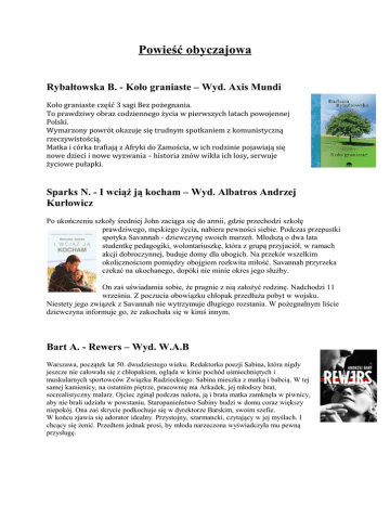 Powieść obyczajowa Rybałtowska B. - Koło graniaste – Wyd. Axis Mundi Koło graniaste część 3 sagi Bez pożegnania. To prawdziwy obraz codziennego życia w pierwszych latach powojennej Polski. Wymarzony powrót okazuje się trudnym spotkaniem z komunistyczną rzeczywistością. Matka i córka trafiają z Afryki do Zamościa, w ich rodzinie pojawiają się nowe dzieci i nowe wyzwania – historia znów wikła ich losy, serwuje życiowe pułapki. Sparks N. - I wciąż ją kocham – Wyd. Albatros Andrzej Kurłowicz Po ukończeniu szkoły średniej John zaciąga się do armii, gdzie przechodzi szkołę prawdziwego, męskiego życia, nabiera pewności siebie. Podczas przepustki spotyka Savannah - dziewczynę swoich marzeń. Młodszą o dwa lata studentkę pedagogiki, wolontariuszkę, która z grupą przyjaciół, w ramach akcji dobroczynnej, buduje domy dla ubogich. Na przekór wszelkim okolicznościom pomiędzy obojgiem rozkwita miłość. Savannah przyrzeka czekać na ukochanego, dopóki nie minie okres jego służby. On zaś uświadamia sobie, że pragnie z nią założyć rodzinę. Nadchodzi 11 września. Z poczucia obowiązku chłopak przedłuża pobyt w wojsku. Niestety jego związek z Savannah nie wytrzymuje długiego rozstania. W pożegnalnym liście dziewczyna informuje go, że zakochała się w kimś innym. Bart A. - Rewers – Wyd. W.A.B Warszawa, początek lat 50. dwudziestego wieku. Redaktorka poezji Sabina, która nigdy jeszcze nie całowała się z chłopakiem, ogląda w kinie pochód uśmiechniętych i muskularnych sportowców Związku Radzieckiego. Sabina mieszka z matką i babcią. W tej samej kamienicy, na ostatnim piętrze, pracownię ma Arkadek, jej młodszy brat, socrealistyczny malarz. Ojciec zginął podczas nalotu, ją i brata matka zamknęła w piwnicy, aby nie brali udziału w powstaniu. Staropanieństwo Sabiny budzi w domu coraz większy niepokój. Ona zaś skrycie podkochuje się w dyrektorze Barskim, swoim szefie. W końcu zjawia się adorator idealny. Przystojny, szarmancki, czytający w jej myślach. I chcący się żenić. Przedtem jednak prosi, by młoda narzeczona wyświadczyła mu pewną przysługę. Janko A. - Dziewczyna z zapałkami - Wyd. Nowy Świat “Dziewczyna z zapałkami” opowiada historię toksycznego związku, na zewnątrz wyglądającego na “normalną współczesną rodzinę”, opowieść kobiety “uwięzionej” w domu w trudnych latach 80. i na początku 90. Bohaterka, która zauważyła, że “życie, jak pogoda, nie dopisało”, nie chce poddać się w walce o własną tożsamość. Kibicujemy jej, śledząc zmagania z mężem, rodziną, z losem. “Na świecie ma się do wyboru tylko samotność albo pospolitość. Tako rzecze Schopenhauer. Zostałam obdarowana jednym i drugim. Na własne życzenie. A miałam pisać wiersze!” – wyjawia bohaterka. Fox M. - Kobieta zaklęta w kamień – Wyd. Literackie Emilia, główna bohaterka pisarka w średnim wieku, cierpi na dziwną chorobę skóry, w wyniku której jej ciało stopniowo kamienieje. Pozornie spełniona, zakochana w obecnym partnerze kobieta, matka dorosłych dzieci, zaczyna szukać źródła choroby w swojej przeszłości. Wyrusza w podróż by stanąć twarzą w twarz z dramatyczną historią sprzed lat, która wciąż rani ją i jej najbliższych. Ostatecznie historia Emilii okazuje się opowieścią o sile kobiecości i odwadze poszukiwania własnej tożsamości. Zachęca do tego, żeby nie przegapić drugiej szansy na szczęście. A przede wszystkim – pokazuje, jak obudzić w sobie to, co często w nas martwe, uśpione, skamieniałe. Ferris J. - I tak doczekaliśmy końca – Wyd. Nowa Proza I tak doczekaliśmy końca to Paragraf 22 w świecie biznesu; przezabawny, wzruszający i surrealistyczny portret współczesnej amerykańskiej korporacji; teatrzyk – chociaż chyba nie dla dzieci? – w którym dziecinna psota miesza się z próżną, małostkową, rozpaczliwą konkurencją. Prawdziwym objawieniem jest fakt, jakich wzruszeń dostarcza ta historia i ile niesie w sobie człowieczeństwa i prawdziwych emocji. Patchett A. - Biegnij - Dom Wydawniczy Rebis Kiedy na zdradliwej, oblodzonej drodze dochodzi do poważnego wypadku, bohaterowie tej powieści – Doyle, były burmistrz Bostonu, i jego dwaj adoptowani synowie – muszą sobie odpowiedzieć na najważniejsze egzystencjalne pytania. "Biegnij", najnowsze dzieło Ann Patchett, to liryczna, ciepła i poruszająca opowieść o tym, w jak przedziwny sposób krzyżują się ścieżki ludzkiego życia, o kruchych nadziejach i lękach o nasze dzieci, o tym, do czego jesteśmy zdolni, by chronić własną rodzinę. Grochola K. - Kryształowy Anioł - Wyd. Literackie Judyta, obwołana najbardziej wpływową bohaterką literacką wolnej Polski, ma godną następczynię. Na niemal sześciuset stronach nowej, znakomitej powieści Kryształowy Anioł Katarzyna Grochola powołuje do istnienia Sarę. Ta inteligentna i wrażliwa trzydziestolatka, podobnie jak wielu przedstawicieli jej pokolenia, wyjeżdża z rodzinnego miasta, aby szukać szczęścia w Warszawie. Niestety – to, co jest szczęściem dla męża Sary, jej przynosi osamotnienie i rozpacz. Powieść sensacyjna Goodman A. - Eon (Powrót Lustrzanego Smoka) - Wyd.Telbit "Kobietom nie przysługuje miejsce w świecie smoczej magii. W powszechnym mniemaniu wprowadzają pierwiastek zepsucia do rzemiosła lorda Smocze Oko, nie posiadają też fizycznej siły i żelaznej woli, niezbędnej do zjednoczenia się ze smokiem. Uważa się, że niewieście oko, zbyt często zapatrzone w siebie, nie potrafi ogarnąć natury świata energii". Choć prawo panujące w Imperium Niebiańskich Smoków jest surowe, jeden z dwunastu kandydatów na ucznia lorda Smocze Oko zdołał ukryć przed światem swoją prawdziwą tożsamość. Stając do walki o przychylność Szczurzego Smoka, który na rok obejmie przywództwo nad duchowymi bestiami, chroniącymi kraj i cesarza, Eon podejm