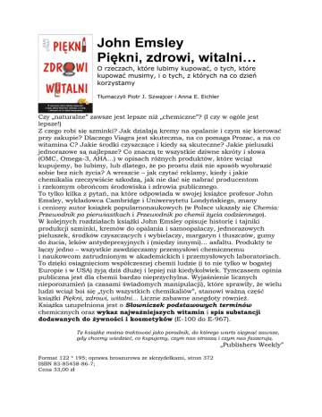 John Emsley Piękni, zdrowi, witalni… O rzeczach, które lubimy kupować, o tych, które kupować musimy, i o tych, z których na co dzień korzystamy Tłumaczyli Piotr J. Szwajcer i Anna E. Eichler Czy „naturalne” zawsze jest lepsze niż „chemiczne”? (I czy w ogóle jest lepsze!) Z czego robi się szminki? Jak działają kremy na opalanie i czym się kierować przy zakupie? Dlaczego Viagra jest skuteczna, na co pomaga Prozac, a na co witamina C? Jakie środki czyszczące i kiedy są skuteczne? Jakie pieluszki jednorazowe są najlepsze? Co znaczą te wszystkie dziwne skróty i słowa (OMC, Omega-3, AHA…) w opisach różnych produktów, które wciąż kupujemy, bo lubimy, lub dlatego, że po prostu dziś nie sposób wyobrazić sobie bez nich życia? A wreszcie – jak czytać reklamy, kiedy i jakie chemikalia rzeczywiście szkodzą, jak nie dać się nabrać producentom i rzekomym obrońcom środowiska i zdrowia publicznego. To tylko kilka z pytań, na które odpowiada w swojej książce profesor John Emsley, wykładowca Cambridge i Uniwersytetu Londyńskiego, znany i ceniony autor książek popularnonaukowych (w Polsce ukazały się Chemia: Przewodnik po pierwiastkach i Przewodnik po chemii życia codziennego). W kolejnych rozdziałach książki John Emsley opisuje historię i tajniki produkcji szminki, kremów do opalania i samoopalaczy, jednorazowych pieluszek, środków czyszczących i wybielaczy, margaryn i tłuszczów, gumy do żucia, leków antydepresyjnych i (między innymi)… asfaltu. Produkty te łączy jedno – wszystkie zawdzięczamy przemysłowi chemicznemu i naukowcom zatrudnionym w akademickich i przemysłowych laboratoriach. To dzięki osiągnięciom współczesnej chemii ludzie (i to nie tylko w bogatej Europie i w USA) żyją dziś dłużej i lepiej niż kiedykolwiek. Tymczasem opinia publiczna jest dla chemii bardzo nieprzychylna. Wyjaśnienie licznych nieporozumień (a czasami świadomych manipulacji), które sprawiły, że wielu ludzi wciąż boi się „tych wszystkich chemikaliów”, stanowi ważną część książki Piękni, zdrowi, witalni… Liczne zabawne anegdoty również. Książka uzupełniona jest o Słowniczek podstawowych terminów chemicznych oraz wykaz najważniejszych witamin i spis substancji dodawanych do żywności i kosmetyków (E-100 do E-967). Tę książkę można traktować jako poradnik, do którego warto sięgnąć zawsze, gdy chcemy wiedzieć, co kupujemy, czym nas straszą i czym nas faszerują. „Publishers Weekly” Format 122 * 195; oprawa broszurowa ze skrzydełkami, stron 372 ISBN 83-85458-86-7; Cena 33,00 zł