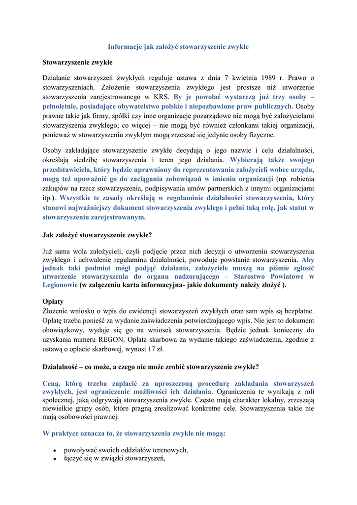 Informacje jak założyć stowarzyszenie zwykłe Stowarzyszenie zwykłe Działanie stowarzyszeń zwykłych reguluje ustawa z dnia 7 kwietnia 1989 r. Prawo o stowarzyszeniach. Założenie stowarzyszenia zwykłego jest prostsze niż utworzenie stowarzyszenia zarejestrowanego w KRS. By je powołać wystarczą już trzy osoby – pełnoletnie, posiadające obywatelstwo polskie i niepozbawione praw publicznych. Osoby prawne takie jak firmy, spółki czy inne organizacje pozarządowe nie mogą być założycielami stowarzyszenia zwykłego; co więcej – nie mogą być również członkami takiej organizacji, ponieważ w stowarzyszeniu zwykłym mogą zrzeszać się jedynie osoby fizyczne. Osoby zakładające stowarzyszenie zwykłe decydują o jego nazwie i celu działalności, określają siedzibę stowarzyszenia i teren jego działania. Wybierają także swojego przedstawiciela, który będzie uprawniony do reprezentowania założycieli wobec urzędu, mogą też upoważnić go do zaciągania zobowiązań w imieniu organizacji (np. robienia zakupów na rzecz stowarzyszenia, podpisywania umów partnerskich z innymi organizacjami itp.). Wszystkie te zasady określają w regulaminie działalności stowarzyszenia, który stanowi najważniejszy dokument stowarzyszenia zwykłego i pełni taką rolę, jak statut w stowarzyszeniu zarejestrowanym. Jak założyć stowarzyszenie zwykłe? Już sama wola założycieli, czyli podjęcie przez nich decyzji o utworzeniu stowarzyszenia zwykłego i uchwalenie regulaminu działalności, powoduje powstanie stowarzyszenia. Aby jednak taki podmiot mógł podjąć działania, założyciele muszą na piśmie zgłosić utworzenie stowarzyszenia do organu nadzorującego – Starostwo Powiatowe w Legionowie (w załączeniu karta informacyjna- jakie dokumenty należy złożyć ). Opłaty Złożenie wniosku o wpis do ewidencji stowarzyszeń zwykłych oraz sam wpis są bezpłatne. Opłatę trzeba ponieść za wydanie zaświadczenia potwierdzającego wpis. Nie jest to dokument obowiązkowy, wydaje się go na wniosek stowarzyszenia. Będzie jednak konieczny do uzyskania numeru REGON. Opłata skarbowa za wydanie takiego zaświadczenia, zgodnie z ustawą o opłacie skarbowej, wynosi 17 zł. Działalność – co może, a czego nie może zrobić stowarzyszenie zwykłe? Ceną, którą trzeba zapłacić za uproszczoną procedurę zakładania stowarzyszeń zwykłych, jest ograniczenie możliwości ich działania. Ograniczenia te wynikają z roli społecznej, jaką odgrywają stowarzyszenia zwykłe. Często mają charakter lokalny, zrzeszają niewielkie grupy osób, które pragną zrealizować konkretne cele. Stowarzyszenia takie nie mają osobowości prawnej. W praktyce oznacza to, że stowarzyszenia zwykłe nie mogą: powoływać swoich oddziałów terenowych, łączyć się w związki stowarzyszeń, zrzeszać osób prawnych (np. innych stowarzyszeń, firm itp.), prowadzić działalności gospodarczej, przyjmować darowizn, spadków, zapisów, otrzymywać dotacji, korzystać z ofiarności publicznej. Składki członkowskie Jedyne źródło dochodu stowarzyszenia zwykłego stanowią składki członkowskie. Są one zwolnione z podatku dochodowego od osób prawnych (art. 17 ust. 1 pkt 40 ustawy o podatku dochodowym od osób prawnych). Stowarzyszenie zwykłe nie ma możliwości pozyskiwania środków pieniężnych z innych źródeł. Złamanie tego przepisu doprowadziłoby do zakazu działalności stowarzyszenia. Wysokość składki członkowskiej w stowarzyszeniu zwykłym powinna być taka sama dla wszystkich członków. W wyjątkowych okolicznościach, ustalonych solidarnie przez członków stowarzyszenia, można kogoś zwolnić z opłacenia składki. Zatrudnianie pracowników Stowarzyszenie zwykłe nie może zatrudniać pracowników, ponieważ nie ma osobowości prawnej i w związku z tym nie może zawierać długotrwałych umów prawnie skutecznych. Może jedynie zlecić komuś krótkotrwałe prace okresowe związane z bieżącą działalnością. W praktyce często zdarza się, że stowarzyszenia zwykłe zlecają coś firmom zewnętrznym. Obowiązki stowarzyszenia zwykłego: NIP, REGON, konto bankowe, księgowość, sprawozdania Z faktu, że stowarzyszenie zwykłe stanowi prostszą formę stowarzyszenia, która nie wymaga rejestracji w KRS i nie ma osobowości prawnej, nie wynika, iż jest zwolnione z innych obowiązków, którym podlegają pozostałe stowarzyszenia. W odrębnych przepisach prawnych obowiązujących wszystkie organizacje nie istnieje wyłączenie dla stowarzyszeń zwykłych. Stowarzyszenie zwykłe, podobnie jak organizacja zarejestrowana w KRS, musi uzyskać numery REGON i NIP. REGON, NIP Po otrzymaniu informacji o wpisie do ewidencji stowarzyszeń zwykłych, organizacja taka powinna zgłosić się do urzędu statystycznego właściwego ze względu na swoją siedzibę (odpowiedni adres można znaleźć na stronie internetowej GUS www.stat.gov.pl) i wystąpić o nadanie numeru REGON. Aby uzyskać REGON, stowarzyszenie zwykłe wypełnia formularz wniosku RG-OP. Wniosek RG-OP można pobrać ze strony http://bip.stat.gov.pl/dzialalnoscstatystyki-publicznej/rejestr-regon/formularze-regon-papierowe/ Do tego formularza stowarzyszenie zwykłe powinno załączyć swój regulamin i kopię zaświadczenia o wpisie do ewidencji stowarzyszeń. Wniosek można przesłać pocztą. REGON zostanie wydany w ciągu 7 dni od daty otrzymania formularza przez właściwy urząd statystyczny. Jednak osobiste złożenie dokumentów gwarantuje otrzymanie zaświadczenia o numerze REGON od ręki. Kiedy stowarzyszenie zwykłe otrzyma numer REGON, musi jeszcze złożyć wniosek o numer identyfikacji podatkowej (NIP). Wydaje się to zaskakujące w obliczu faktu, iż jedyne dochody organizacji pochodzą ze składek członkowskich zwolnionych z podatku dochodowego w części nieprzeznaczanej na działalność gospodarczą, której stowarzyszeniu zwykłemu nie wolno przecież prowadzić. W efekcie 