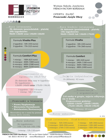 Wyższa Szkoła Językowa FRENCH FACTORY BORDEAUX __Kurs średnio-intensywny __Kurs intensywny 5h dziennie (poniedziałek - piątek) 25h tygodniowo 9h00-12h00 oraz 14h00-16h00 3h dziennie (poniedziałek - piątek) 15h tygodniowo 9h00-12h00 lub 14h00-17h00 Formuła Vivalto Plus Formuła Vivalto 2 tygodnie : 50h (350 euros) 3 tygodnie : 75h (525 euros) 2 tygodnie : 30h (240 euros) 3 tygodnie : 75h (360 euros) Formuła Comfort Plus Formuła Comfort 1 miesiąc : 100h (625 euro) 4 miesiące : 400h (1800 euro) 6 miesięcy : 600h (2580 euro) 8 miesięcy : 800h (3250 euro) 1 miesiąc : 60h (420 euro) 4 miesiące : 240h (1200 euro) 6 miesięcy : 360h (1800 euro) 8 miesięcy : 480h (2400 euro) __Przygotowanie do egzaminów DELF/TCF __Zajęcia indywidualne 2h dziennie dwa razy w tygodniu 4h tygodniowo 12h00-14h00 oraz 17h30-19h30 1h (60min): 42 euro 3 tygodnie : 12h (110 euro) 1 miesiąc: 16h (145 euro) __Francuski w biznesie * Prawo/Dyplomacja * Ekonomia/Zarządzanie * Hotelarstwo/Restauracja Skontaktuj się z nami by poznać naszą ofertę cenową. __Kurs sobotni 3h tygodniowo 10h-13h lub 16h-19h __Konwersacja i argumentacja Ceny zajęć nie obejmują zakwaterowania. Szkoła proponuje zakwaterowanie u starannie wyselekcjonowanych francuskich rodzin (350 euro/miesiac ze śniadaniem ) OFERTA ZAJĘĆ Francuski Język Obcy 2-6 osoby w grupie, zajęcia odbywają się w środy Proponowane godziny: 12h00-13h00, 13h00-14h00, 17h30-18h30, 18h30-19h30 1h (60min): 20 euros __Kursy wakacyjne © FFB Staż intensywny Staż średnio-intensywny 1 miesiąc : 92h (540 euros) 2 miesiące : 184h (956 euros) 3 miesiące : 276h (1335 euros) 1miesiąc : 12h (130 euro) FRENCH FACTORY Bordeaux - 145 rue du Palais Gallien - 33000 Bordeaux /FRANCE/ tél. 0033 5 40 54 67 20 www.ffbordeaux.fr e-mail: [email protected] 1 miesiąc : 60h (360 euros) 2 miesiące : 120h (685 euros) 3 miesiące : 180h (990 euros)