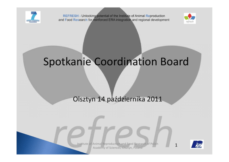Spotkanie Coordination Board Olsztyn 14 października 2011 Institute of Animal Reproduction and Food Research of Polish Academy of Sciences, Olsztyn, Poland 1 Plan spotkania: 1. Przedstawienie nowych pracowników i osób przebywających w Instytucie z zagranicy (część prowadzona w j. angielskim) prezentacje Antonio Galvao i Valentiny Kisielevy 2. krótkie podsumowanie spotkania Advisory Board w Gdańsku 3. prezentacje WP Liderów planów na najbliższe 3 miesiące wg. kolejności pakietów pracy (WP 2,3,4,5,6) 4. uwagi do raportu 5. dyskusja i wolne wnioski Institute of Animal Reproduction and Food Research of the Polish Academy of Sciences in Olsztyn, Poland 2 krótkie podsumowanie spotkania Advisory Board w Gdańsku Institute of Animal Reproduction and Food Research of the Polish Academy of Sciences in Olsztyn, Poland 3 Institute of Animal Reproduction and Food Research of the Polish Academy of Sciences in Olsztyn, Poland 4 Podsumowanie AB meeting: W spotkaniu uczestniczyło 32 osoby: ‐ 15 osób z Instytutu (Dyrektor, Koordynator, WP Liderzy, BWB, Leslie i Barbara Kozakowie oraz 2 osoby, które powróciły z długich wyjazdów w ramach REFRESH) ‐ 11 osób z 9 krajów w tym potencjalny nowy partner z Northumbria University , UK, ‐ 4 partnerów z biznesu i administracji publicznej ‐ 2 zaproszonych gości, Martin Stocks i George Mulewski którzy wygłosili prezentacje o transferze wiedzy w praktyce i finansowym wsparciu inicjatyw S2B Institute of Animal Reproduction and Food Research of the Polish Academy of Sciences in Olsztyn, Poland 5 Podsumowanie AB meeting c.d.: ‐ Oprócz raportów z realizacji zadań projektu REFRESH w 1 roku, partnerzy rozmawiali o potencjalnych wspólnych projektach m.in. pseudocereals (with emphasis to buckwheat) ‐ Prezentacje i raporty przed kolejnym AB meeting powinny być przesłane na 2 tygodnie przed spotkaniem ‐ Została ustalona wstępnie data kolejnego spotkania Advisory Board – 13‐14 września 2012 w Olsztynie Institute of Animal Reproduction and Food Research of the Polish Academy of Sciences in Olsztyn, Poland 6 Prezentacje WP Liderów planów na najbliższe 3 miesiące wg. kolejności pakietów pracy (WP1,2,3,4,5,6) Institute of Animal Reproduction and Food Research of the Polish Academy of Sciences in Olsztyn, Poland 7 WP 1‐ management • Przygotowanie minutes ze spotkania AB (I.Kieda+K.Capłap) i przesłanie do członków AB najpóźniej w ciągu 20 dni po spotkaniu + 10 dni na uzupełnia przez członków AB. • Złożenie raportów z poszczególnych WP do KE do końca października 2011 • Poprawienie raportu przedstawionego na spotkaniu AB w Gdańsku i przesłanie do członków AB oraz do KE wraz z rekomendacjami AB w listopadzie 2011. Institute of Animal Reproduction and Food Research of the Polish Academy of Sciences in Olsztyn, Poland 8 Prezentacje WP Liderów 2,3,4,5,6 plany na najbliższe 3 miesiące Institute of Animal Reproduction and Food Research of the Polish Academy of Sciences in Olsztyn, Poland 9 Uwagi do raportu: K. Capłap M. Piskuła Institute of Animal Reproduction and Food Research of the Polish Academy of Sciences in Olsztyn, Poland 10 Wolne wnioski i dyskusja 11 ‐ Prośba od K. Wilczka o dostarczanie kart czasu pracy jak wcześniej ustalono do 10 dnia każdego następnego miesiąca ‐ podyktowane jest to Kodeksem Pracy i obowiązkiem wypłacenia świadczeń w kolejnym miesiącu następującym po wykonaniu pracy ‐ Zmiana formuły spotkań Coordiantion Board (CB) na referowanie planów przez WP Liderów i rozliczanie tych planów na kolejnym spotkaniu CB ‐ Filmy popularno‐naukowe do TVP (M. Kaczmarek budżet do wykorzystania do końca 2011r.) Institute of Animal Reproduction and Food Research of the Polish Academy of Sciences in Olsztyn, Poland 12 DZIĘKUJĘ ZA UWAGĘ! 13