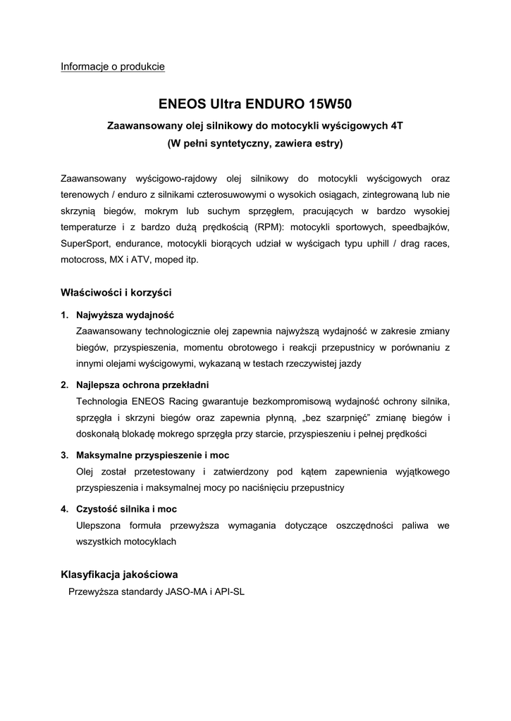 Informacje o produkcie ENEOS Ultra ENDURO 15W50 Zaawansowany olej silnikowy do motocykli wyścigowych 4T (W pełni syntetyczny, zawiera estry) Zaawansowany wyścigowo-rajdowy olej silnikowy do motocykli wyścigowych oraz terenowych / enduro z silnikami czterosuwowymi o wysokich osiągach, zintegrowaną lub nie skrzynią biegów, mokrym lub suchym sprzęgłem, pracujących w bardzo wysokiej temperaturze i z bardzo dużą prędkością (RPM): motocykli sportowych, speedbajków, SuperSport, endurance, motocykli biorących udział w wyścigach typu uphill / drag races, motocross, MX i ATV, moped itp. Właściwości i korzyści 1. Najwyższa wydajność Zaawansowany technologicznie olej zapewnia najwyższą wydajność w zakresie zmiany biegów, przyspieszenia, momentu obrotowego i reakcji przepustnicy w porównaniu z innymi olejami wyścigowymi, wykazaną w testach rzeczywistej jazdy 2. Najlepsza ochrona przekładni Technologia ENEOS Racing gwarantuje bezkompromisową wydajność ochrony silnika, sprzęgła i skrzyni biegów oraz zapewnia płynną, „bez szarpnięć” zmianę biegów i doskonałą blokadę mokrego sprzęgła przy starcie, przyspieszeniu i pełnej prędkości 3. Maksymalne przyspieszenie i moc Olej został przetestowany i zatwierdzony pod kątem zapewnienia wyjątkowego przyspieszenia i maksymalnej mocy po naciśnięciu przepustnicy 4. Czystość silnika i moc Ulepszona formuła przewyższa wymagania dotyczące oszczędności paliwa we wszystkich motocyklach Klasyfikacja jakościowa Przewyższa standardy JASO-MA i API-SL Zastosowanie Czterosuwowe motocykle terenowe, enduro, wyścigowe ze zintegrowaną lub nie skrzynią biegów, mokrym lub suchym sprzęgłem, pracujących w bardzo wysokiej temperaturze i z bardzo dużą prędkością (RPM) Motocykle o dużej mocy, sportowe, speedbajki, Moto-GP, SuperSport, Endurance, motocykle biorące udział w wyścigach typu uphill / drag races, motocross, MX i ATV, moped oraz urządzenia energetyczne wyposażone lub nie w systemy oczyszczania spalin (katalizatory, wtrysk powietrza do rury wydechowej, itp.) Opakowania 1l, 4l, 60l Typowe właściwości Klasa lepkości SAE 15W-50 Gęstość (15oC), g/cm3 0,86 Temperatura zapłonu (COC), C 230 Lepkość kinematyczna (100oC), mm2/s 20,2 Wskaźnik lepkości 170 o Temperatura płynięcia, oC -40,0 Całkowita Liczba Zasadowa – TBN (HClO4), mg KOH/g Wygląd 6,80 Bezbarwny Uwaga: Typowe właściwości mogą ulec zmianie bez uprzedzenia (maj 2011)