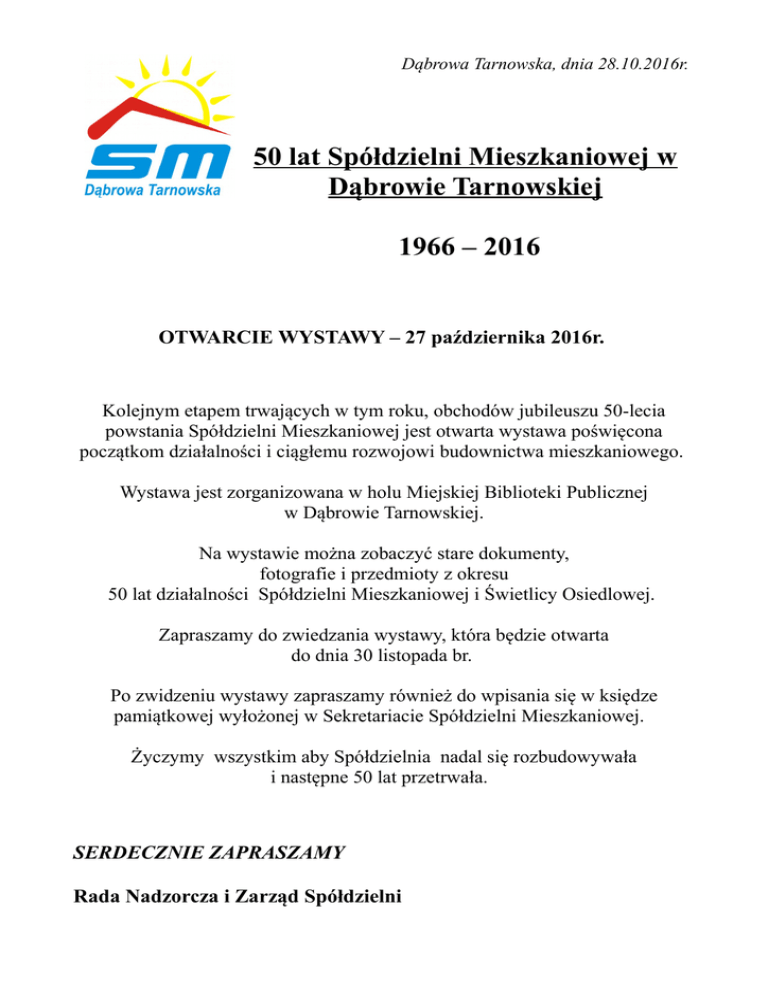 Dąbrowa Tarnowska, dnia 28.10.2016r. 50 lat Spółdzielni Mieszkaniowej w Dąbrowie Tarnowskiej 1966 – 2016 OTWARCIE WYSTAWY – 27 października 2016r. Kolejnym etapem trwających w tym roku, obchodów jubileuszu 50-lecia powstania Spółdzielni Mieszkaniowej jest otwarta wystawa poświęcona początkom działalności i ciągłemu rozwojowi budownictwa mieszkaniowego. Wystawa jest zorganizowana w holu Miejskiej Biblioteki Publicznej w Dąbrowie Tarnowskiej. Na wystawie można zobaczyć stare dokumenty, fotografie i przedmioty z okresu 50 lat działalności Spółdzielni Mieszkaniowej i Świetlicy Osiedlowej. Zapraszamy do zwiedzania wystawy, która będzie otwarta do dnia 30 listopada br. Po zwidzeniu wystawy zapraszamy również do wpisania się w księdze pamiątkowej wyłożonej w Sekretariacie Spółdzielni Mieszkaniowej. Życzymy wszystkim aby Spółdzielnia nadal się rozbudowywała i następne 50 lat przetrwała. SERDECZNIE ZAPRASZAMY Rada Nadzorcza i Zarząd Spółdzielni