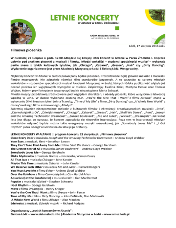 Łódź, 17 sierpnia 2016 roku Filmowa piosenka W niedzielę 21 sierpnia o godz. 17.00 odbędzie się kolejny letni koncert w Altanie w Parku Źródliska I. Impreza upłynie pod znakiem piosenki z musicali i filmów. Młodzi wokaliści – studenci specjalności musical – wykonają partie znane z takich kultowych tytułów, jak „Chicago”, „Cabaret”, „Grease”, „Hair” czy „Dirty Dancing”. Wydarzenie organizowane jest przez Akademię Muzyczną w Łodzi i Zieloną Łódź. Wstęp wolny. Najbliższy koncert w Altanie w całości poświęcony będzie piosence. Prezentowane będą głównie melodie z musicali i filmów muzycznych. Nie zabraknie również kilku standardów jazzowych. A to wszystko za sprawą młodych wokalistów – studentów specjalności musical Akademii Muzycznej w Łodzi, których łódzka publiczność zdążyła już poznać podczas ich wyjątkowych występów w mieście. Zaśpiewają: Ewelina Kisiel, Martyna Henke oraz Tomasz Wojtan, którym przy fortepianie towarzyszyć będzie niezastąpiona Marta Sobczak. Młodzi muzycy przedstawią zróżnicowane pod względem charakteru i obsady piosenki, które wszystkim z łatwością wpadną w ucho. W duecie wykonane zostaną m.in. „You're the One That I Want” z filmu „Grease” znane w wykonaniu Olivii Newton-John i Johna Travolty, „Time of My Life” z filmu „Dirty Dancing” czy „A Whole New World” z disney’owskiego filmu animowanego „Alladyn”. Zabrzmią również niezapomniane melodie z kultowych filmów i ekranizacji broadwayowskich musicali: „Evita”, „Czarnoksiężnik z Oz”, „Dźwięki muzyki”, „Chicago”, „Cabaret”, „Grease”, „Hair”, „Shall We Dance”, „Rent”, „Joseph and the Amazing Technicolor Dreamcoat”, „Sunset Boulevard”, „Me and Juliet”, „Wicked”, „Dreamgirls”. Jak widać lista jest długa, co oznacza, że koncert zapowiada się niezwykle interesująco. Poza tym w interpretacji młodych wokalistów usłyszeć będzie można takie evergreeny muzyki rozrywkowej, jak „Somebody Loves Me” i „I Got Rhythm” pióra George’a Gershwina do słów jego brata Iry. LETNIE KONCERTY W ALTANIE ǀ program koncertu 21 sierpnia pt. „Filmowa piosenka” Close Every Door z musicalu Joseph and the Amazing Technicolor Dreamcoat – Andrew Lloyd Webber Your Eyes z musicalu Rent – Jonathan Larson They Can't Take That Away from Me z filmu Shall We Dance – George Gershwin The Gratest Star of All z musicalu Sunset Boulevard – Andrew Lloyd Webber Somebody Loves Me – George Gershwin Śliska błyskawica z musicalu Grease – Jim Jacobs, Warren Casey All That Jazz z musicalu Chicago – John Kander Maybe This Time z musicalu Cabaret – John Kander We Deserve Each Other z musicalu Me and Juliet – Richard Rodgers You Must Love Me z filmu Evita – Andrew Lloyd Webber Over the Rainbow z filmu Czarnoksiężnik z Oz – Harold Arlen Aquarius (Let the Sunshine In) z musicalu Hair – Galt MacDermot Popular z musicalu Wicked – Stephen Schwartz I Got Rhythm – George Gershwin Move z filmu Dreamgirls – Henry Krieger You're the One That I Want z filmu Grease – John Farrar Time of My Life z filmu Dirty Dancing – John DeNicola, Don Markowitz A Whole New World z filmu Alladyn – Alan Manken Edelweiss z musicalu Dźwięki muzyki – Richard Rodgers Organizatorzy „Letnich koncertów w Altanie”: Zielona Łódź – www.zielonalodz.info ǀ Akademia Muzyczna w Łodzi – www.amuz.lodz.pl