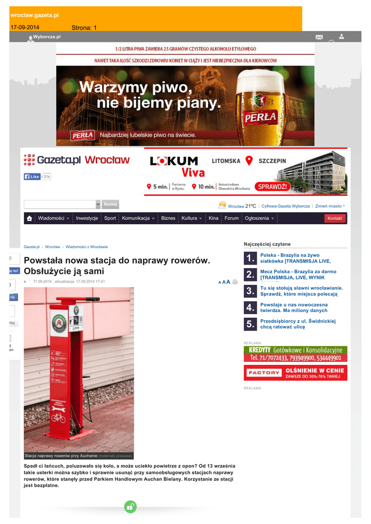 wroclaw.gazeta.pl 17-09-2014 Strona: 1 Wyborcza.pl Like 21k Szukaj Wiadomości Gazeta.pl 0 Lubię to! 0 Wrocław Inwestycje Sport Wrocław 21ºC Komunikacja Biznes Kultura Kina Forum 17.09.2014 , aktualizacja: 17.09.2014 17:41 Zmień miasto Ogłoszenia Kontakt Najczęściej czytane Wiadomości z Wrocławia 3. Polska - Brazylia na żywo siatkówka [TRANSMISJA LIVE, ONLINE, STREAM] Mecz Polska - Brazylia za darmo [TRANSMISJA, LIVE, WYNIK ONLINE] Tu się stołują sławni wrocławianie. Sprawdź, które miejsca polecają 4. Powstaje u nas nowoczesna twierdza. Ma miliony danych 5. Przedsiębiorcy z ul. Świdnickiej chcą ratować ulicę 1. Powstała nowa stacja do naprawy rowerów. Obsłużycie ją sami s Cyfrowa Gazeta Wyborcza A A A odziel się Skomentuj 2. REKLAMA Wyślij e-mailem REKLAMA Stacja naprawy rowerów przy Auchanie (materiały prasowe) Spadł ci łańcuch, poluzowało się koło, a może uciekło powietrze z opon? Od 13 września takie usterki można szybko i sprawnie usunąć przy samoobsługowych stacjach naprawy rowerów, które stanęły przed Parkiem Handlowym Auchan Bielany. Korzystanie ze stacji jest bezpłatne. wroclaw.gazeta.pl 17-09-2014 Strona: 2 Podczas rowerowej wycieczki, a także w drodze do pracy czy domu - nasze jednoślady są narażone na usterki. Jednak niewielu rowerzystów wybiera się w podróż z pełnym zestawem naprawczym. Drobnych korekt można bowiem dokonać przy samoobsługowych stacjach naprawy rowerów. Dwa takie stanowiska pojawiły się właśnie przy Parku Handlowym Auchan Bielany. Zlokalizowane są one w pobliżu dwóch wejść do galerii - Wałbrzych i Jawor. Od 13 września rowerzyści mają tu do dyspozycji stojak oraz niezbędny zestaw wytrzymałych narzędzi. Różnego rodzaju wkrętaki, płaskie klucze, łyżki do opon, a także pompki pasujące do różnych rodzajów wentyli pozwolą doprowadzić jednoślad do ponownego użytku bez wizyty w specjalistycznym serwisie rowerowym. Choć stacje przy galerii handlowej są samoobsługowe, osoby, które nie czują się pewnie w samodzielnej naprawie roweru, mogą skorzystać z podpowiedzi. Na stacjach umieszczono bowiem specjalne kody QR, po zeskanowaniu których użytkownik dowie się krok po kroku, jak szybko usunąć usterkę. REKLAMA Samoobsługowe stacje naprawy rowerów marki IBOMBO dostępne są w Polsce od połowy 2013 roku. Obecnie cieszą się one uznaniem wśród użytkowników na całym świecie, między innymi w Polsce, Niemczech, Włoszech, a nawet Maroku i Nepalu. Stacje dostępne są także przy galeriach handlowych Auchan w podwarszawskich Łomiankach, Bydgoszczy, Częstochowie, Kołbaskowie czy Swadzimiu. REKLAMA Prenumerata cyfrowa Wyborczej dostępna przez internet, telefon, tablet i czytnik e-booków. REKLAMA Wypróbuj teraz za 0,99 zł za miesiąc SERWISY SPECJALNE Zobacz więcej na temat: rowery Auchan Bielany Pociąg do Zachodu. Wyniki konkursu Sprawdź szczegóły Najnowsze wiadomości Zobacz kogo poszukują dolnośląskie firmy Powstała nowa stacja do naprawy rowerów. Obsłużycie ją sami Kres - stylowa knajpka z gruzińskim winem [ZDJĘCIA] Kolejne pociągi z Wi-Fi. Jadące do Wrocławia też [LISTA] Przyznano Dolnośląskie Certyfikaty Gospodarcze [NAGRODZENI] Na Polanie Jakuszyckiej zbudują centrum sportów. Jutro list intencyjny Mecz Rosja - Brazylia za darmo [TRANSMISJA NA ŻYWO, ONLINE, STREAMING] Brazylia - Rosja na żywo siatkówka [TRANSMISJA LIVE, ONLINE, STREAMING] Dolny Śląsk zatrudnia Lotniczy Gądów! Poznaj historię pierwszego wrocławskiego lotniska! REKLAMA PAYPER.PL POLECAMY Warszawa, sobotnia noc. Singiel przemierza miasto... Skomentuj: REKLAMA Zaloguj się Casa Solare - perła architektury na os. Powstańców Śląskich Skomentuj Reklama wroclaw.gazeta.pl 17-09-2014 Strona: 3 Reklamuj się tutaj! Kliknij! Ogłoszenia PRACA WROCŁAW EDUKACJA Technika i inżynieria Najlepszy wdział prawa Praca w sprzedaży Marzysz o zawodzie lekarza? Studiuj... IT - sprawdź setki ofert Pewna praca po tych studiach! DOMIPORTA.PL MOTORYZACJA Oporów, 74 m2 Mieszkania na sprzedaż Mercedes SLK. Luksus i niezawodność Mieszkania do wynajęcia Avensis - najlepsze oferty Najlepsza dziesiątka REKLAMA wroclaw.gazeta.pl 17-09-2014 Strona: 4 Na skróty: Gazeta.pl Polecamy: Miasta Copyright © Agora SA Wiadomości Wpadki O nas Policja Sport.pl Biznes Program TV Gazeta Wyborcza Pogoda Reklama w Gazecie Wyborczej Tematy Prywatność Praca Wideo Program TV Wyniki Lotto Wszystkie artykuły Newsletter Licencje/Kontent Kontakt Facebook RSS Zgłoś błąd Poczta Pomoc