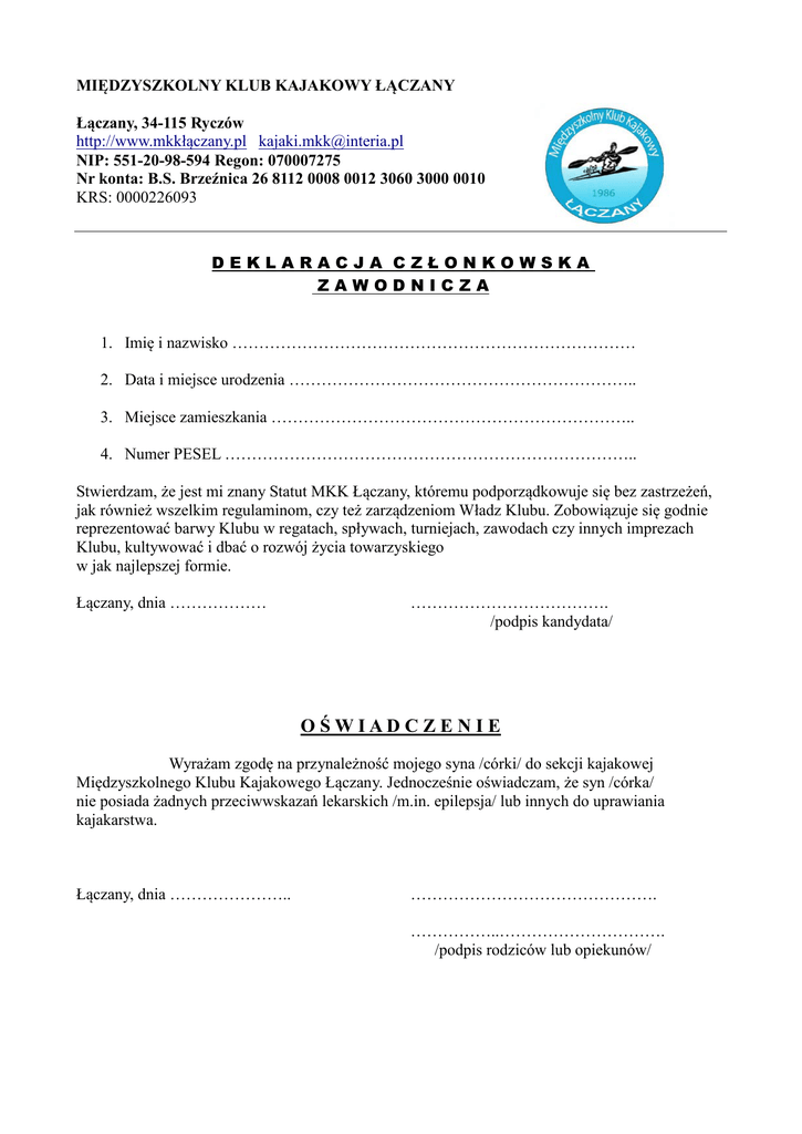 MIĘDZYSZKOLNY KLUB KAJAKOWY ŁĄCZANY Łączany, 34-115 Ryczów http://www.mkkłączany.pl [email protected] NIP: 551-20-98-594 Regon: 070007275 Nr konta: B.S. Brzeźnica 26 8112 0008 0012 3060 3000 0010 KRS: 0000226093 DEKLARACJA CZŁONKOWSKA ZAWODNICZA 1. Imię i nazwisko ………………………………………………………………… 2. Data i miejsce urodzenia ……………………………………………………….. 3. Miejsce zamieszkania ………………………………………………………….. 4. Numer PESEL ………………………………………………………………….. Stwierdzam, że jest mi znany Statut MKK Łączany, któremu podporządkowuje się bez zastrzeżeń, jak również wszelkim regulaminom, czy też zarządzeniom Władz Klubu. Zobowiązuje się godnie reprezentować barwy Klubu w regatach, spływach, turniejach, zawodach czy innych imprezach Klubu, kultywować i dbać o rozwój życia towarzyskiego w jak najlepszej formie. Łączany, dnia ……………… ………………………………. /podpis kandydata/ OŚWIADCZE NI E Wyrażam zgodę na przynależność mojego syna /córki/ do sekcji kajakowej Międzyszkolnego Klubu Kajakowego Łączany. Jednocześnie oświadczam, że syn /córka/ nie posiada żadnych przeciwwskazań lekarskich /m.in. epilepsja/ lub innych do uprawiania kajakarstwa. Łączany, dnia ………………….. ………………………………………. ……………..…………………………. /podpis rodziców lub opiekunów/