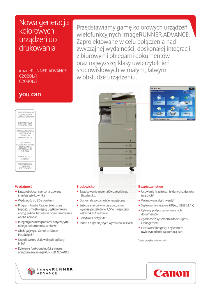 Nowa generacja kolorowych urządzeń do drukowania imageRUNNER ADVANCE C2020L/i C2030L/i Przedstawiamy gamę kolorowych urządzeń wielofunkcyjnych imageRUNNER ADVANCE. Zaprojektowane w celu połączenia nad zwyczajnej wydajności, doskonałej integracji z biurowymi obiegami dokumentów oraz najwyższej klasy uwierzytelnień środowiskowych w małym, łatwym w obsłudze urządzeniu. you can DO 30 STRON/MIN KOLOROWYCH I CZARNO-BIAŁYCH KOMPAKTOWA KONSTRUKCJA ZAAWANSOWANA INTEGRACJA OBIEGÓW DOKUMENTÓW DOTYKOWY KOLOROWY PANEL STEROWANIA O PRZEKĄTNEJ 5,7 CALA NISKIE ZUŻYCIE ENERGII WEWNĘTRZNY FINISHER ZSZYWAJĄCY Wydajność • • Wydajność do 30 stron/min rogram Adobe Reader Extensions • P(opcja), umożliwiający użytkownikom Łatwa obsługa, spersonalizowany interfejs użytkownika ™ edycję plików bez użycia oprogramowania Adobe Acrobat™ ntegracja z rozwiązaniami dotyczącymi • Iobiegu dokumentów w biurze bsługa języka Genuine Adobe • OPostScript3* zeroki zakres skalowalnych aplikacji • SMEAP • Dzielenie funkcjonalności z innymi urządzeniami imageRUNNER ADVANCE Środowisko • • Doskonała wydajność energetyczna użycie energii w trybie spoczynku • Zwynoszące zaledwie 1,5 W – najniższy Zastosowanie materiałów z recyklingu i Bioplastiku. wskaźnik TEC w klasie • Certyfikat Energy Star • Jedne z najmniejszych wymiarów w klasie Bezpieczeństwo suwanie i szyfrowanie danych z dysków • Utwardych* • Wyjmowany dysk twardy* • Szyfrowanie sieciowe (IPSec, IEEE802.1x) yfrowy podpis zeskanowanych • Cdokumentów godność z systemem Adobe Rights • ZManagement ożliwość integracji z systemem • Muwierzytelniania za pomocą kart ™ * dotyczy wyłącznie modeli i Specyfikacja: imageRUNNER ADVANCE C2020L/i / C2030L/i PODSTAWOWE DANE TECHNICZNE Typ Maksymalny rozmiar oryginału Rozmiary kopii Rozdzielczość Szybkość kopiowania/drukowania Powiększenie/pomniejszenie Czas wykonania pierwszej kopii Czas nagrzewania Wiele kopii/wydruków Dupleks Gramatura papieru Pojemność papieru Szybkość procesora Pamięć: Napęd dysku twardego Wyświetlacz Interfejs Protokoły sieciowe Zasilanie Zużycie energii Wymiary (szerokość x głębokość x wysokość) Miejsce montażu (szerokość x głębokość) Ciężar SPECYFIKACJE DRUKOWANIA Języki opisu strony Rozdzielczość Czcionki Obsługiwane systemy operacyjne SPECYFIKACJE SKANOWANIA Opcjonalne/standardowe Szybkość skanowania Rozdzielczość skanowania Sterownik Pull Scan Konsola A3 Kasety od 1 do 4: A3 do A5R, rozmiar dowolny (kaseta 1: od 148 ×182 mm do 297 x 457 mm, kasety 2 – 4: od 140 x 182 mm do 305 x 457 mm). Podajnik ręczny: SRA3 do A5R, rozmiar dowolny (99 x 140 mm – 320 x 457 mm) Odczyt: 600 dpi x 600 dpi, kopiowanie: 600 dpi x 600 dpi Drukowanie: 600 dpi x 600 dpi, 1 200 dpi x 1 200 dpi (połowa prędkości), 9 600 dpi (ulepszenie) x 600 dpi 256 stopni A4: 30 kopii/min (iR-ADV C2030L/i), 20 kopii/min (iR-ADV C2020L/i) A3: 15 kopii/min (iR-ADV C2030L/i), 15 kopii/min (iR-ADV C2020L/i) A4R: 20 kopii/min (iR-ADV C2030L/I, iR-ADV C2020L/i) A5R: 30 kopii/min (iR-ADV C2030L/I, 20 kopii/min (iR-ADV C2020L/i) Zmiana wielkości obrazu: 25 – 400% (stopień zmiany wielkości obrazu o 1%) Czarno-biała: 5,9 sekundy, kolorowa 8,9 sekundy do 38 sekund od 1 do 999 arkuszy standardowy, automatyczny Kasety 1: od 64 do 120, Kasety 2 – 4: 64 – 163 Podajnik ręczny: 64 do 220 Dupleks: 64 do 120 Standardowo: 250 arkuszy + 550 arkuszy Kasety (800 arkuszy) Podajnik ręczny: 100 arkuszy Opcjonalnie: 550 arkuszy x 2 kasety (1 100 arkuszy) Maks. pojemność papieru: 2 000 arkuszy 0,8 GHz RAM: 1 GB + 1 GB (suma: 2 GB) iR-ADV C2020L/2030L: Flash 4 GB iR-ADV C2020i/2030i: Dysk twardy 80 GB 5,7 cala TFT VGA, kolorowy ekran dotykowy Ethernet (1000BaseT/100Base-TX/10Base-T), bezprzewodowa sieć LAN IEEE802.11b/g (opcja), USB 2.0 TCP/IP* (LPD/ Port 9100/ WSD/ IPP/ IPPS/ SMB/ FTP), obsługa SMB wyłącznie w modelu i, IPX/ SPX (NDS, Bindery), AppleTalk, *obsługa IPv4/IPv6 220 – 240 V, 10 A 50/60 Hz do 1,5 kW Modele L: 565 mm x 650 mm x 791 mm Modele i: 565 mm x 680 mm x 928 mm (z ADF) iR-ADV C2030L / 2020L: 846 mm x 1 109 mm (konfiguracja wielotacowa + wysunięta kaseta) iR-ADV C2030i / C2020i: 846 mm x 1 139 mm (konfiguracja wielotacowa + wysunięta kaseta) Sama drukarka: ok. 69 kg (model L), 73 kg (model i) model L + płyta dociskowa: ok. 78 kg, model i + płyta dociskowa 82 kg, model L + ADF: ok. 84 kg, model i + ADF 88 kg UFRII (standardowo we wszystkich modelach) PCL5/6: (standardowo w modelach i, iR-ADV C2030i /2020i, opcjonalnie w modelach L: iR-ADV C2030L/2020L z Canon PCL Printer Kit-AG1), Adobe PostScript 3 (opcjonalnie w modelach i, wyłącznie z zestawem Canon PS Printer Kit– AG1) 600 dpi x 600 dpi, 1 200 dpi x 1 200 dpi (połowa prędkości), 9 600 dpi (ulepszenie) x 600 dpi Czcionki PCL: 93 Roman, 10 Bitmap, 2 OCR, czcionki PS: 136 Roman UFRII: Windows 2000/ XP/ Server 2003/ Vista/ Server 2008/ Windows 7/ Server 2008 R2, MAC OS X (10.4.9 lub nowsze) PCL: Windows 2000/ XP/ Server 2003/ Vista/ Server 2008/ Windows 7/ Server 2008 R2 PS: Windows 2000/ XP/ Server 2003/ Vista/ Server 2008/ Windows 7/ Server 2008 R2, MAC OS X (10.4.9 lub nowsze) MAC-PPD: MAC OS 9.1 lub nowsze, MAC OS X (10.2.8 lub nowsze) Wymaga modułu opcjonalnego dupleksowego kolorowego czytnika obrazów – D1 Skanowanie (jednostronne): A4 30 obrazów/min 600 dpi (kolor/cz.-b.), 44 obrazów/min 300 dpi (kolor/cz.-b.), skanowanie (dwustronne): A4 13 obrazów/min 600 dpi (kolor/cz.-b.) 19 obrazów/min 300 dpi (kolor/cz.-b.) 100 dpi, 150 dpi, 200 x 100 dpi, 200 dpi, 200 x 400 dpi, 300 dpi, 400 dpi, 600 dpi Via Network TWAIN (75 do 600 dpi, czarno-białe i kolorowe) Systemy operacyjne obsługiwane przez sterownik Pull Scan: Windows 2000/ Windows XP/ Windows Server 2003/ Windows Vista/ Windows Server 2008/ Windows 7, (32-bitowy, 64-owy w trybie zgodności) SPECYFIKACJE WYSYŁANIA Opcjonalne/standardowe Lokalizacje docelowe Ksią