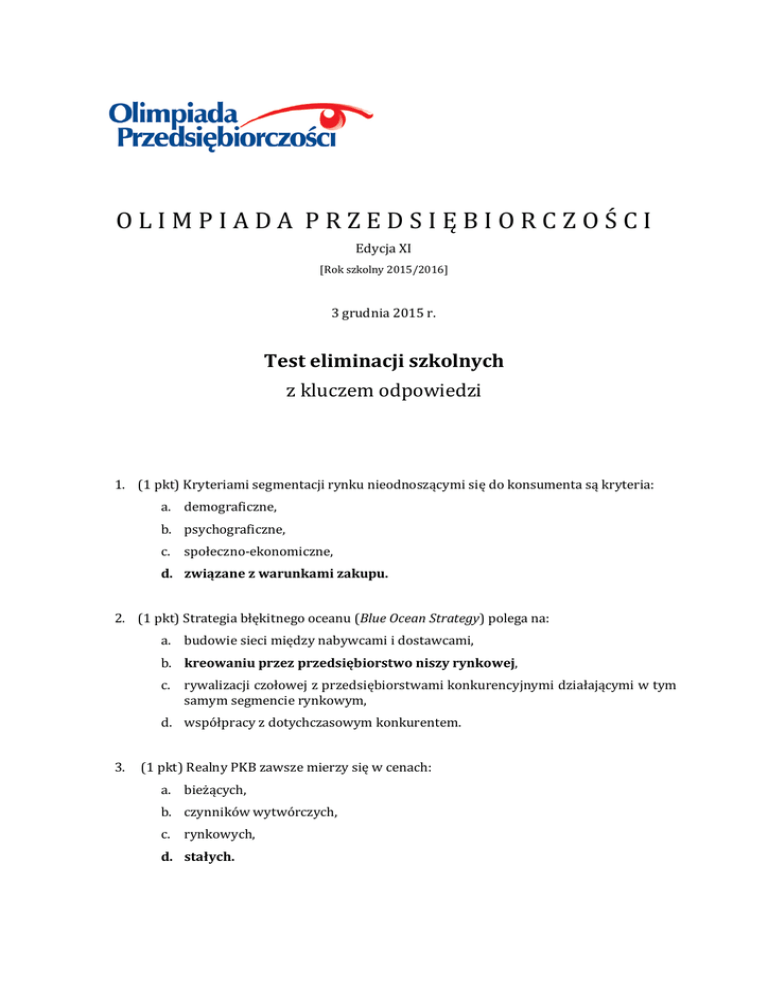 OLIMPIADA PRZEDSIĘBIORCZOŚCI Edycja XI [Rok szkolny 2015/2016] 3 grudnia 2015 r. Test eliminacji szkolnych z kluczem odpowiedzi 1. (1 pkt) Kryteriami segmentacji rynku nieodnoszącymi się do konsumenta są kryteria: a. demograficzne, b. psychograficzne, c. społeczno-ekonomiczne, d. związane z warunkami zakupu. 2. (1 pkt) Strategia błękitnego oceanu (Blue Ocean Strategy) polega na: a. budowie sieci między nabywcami i dostawcami, b. kreowaniu przez przedsiębiorstwo niszy rynkowej, c. rywalizacji czołowej z przedsiębiorstwami konkurencyjnymi działającymi w tym samym segmencie rynkowym, d. współpracy z dotychczasowym konkurentem. 3. (1 pkt) Realny PKB zawsze mierzy się w cenach: a. bieżących, b. czynników wytwórczych, c. rynkowych, d. stałych. Olimpiada Przedsiębiorczości, eliminacje szkolne 3 grudnia 2015 r. 4. (1 pkt) Tezauryzacja oznacza: a. gromadzenie i przechowywanie pieniędzy oraz kruszców poza instytucjami depozytowo-oszczędnościowymi, b. spadek siły nabywczej pieniądza, c. umieszczanie pieniędzy na lokatach bankowych, d. zakup obligacji Skarbu Państwa. 5. (1 pkt) Wskaż zdanie prawdziwe dotyczące oprocentowania salda płatności kartą kredytową. a. Oprocentowanie naliczane jest od razu po dokonaniu płatności kartą. b. Oprocentowanie naliczane jest dopiero po upłynięciu grace period. c. Oprocentowanie nie może przekroczyć najwyższej stopy procentowej NBP. d. Oprocentowanie zależne jest od stawki wynegocjowanej podczas płatności kartą. 6. (1 pkt) Cechą dobrego negocjatora nie jest: a. asertywność, b. empatia, c. kreatywność, d. nieustępliwość. 7. (1 pkt) Do zalet rekrutacji z zewnętrznego rynku pracy zaliczyć można: a. możliwość poprawy stosunków społecznych w przedsiębiorstwie, b. niskie koszty rekrutacji, c. zapewnienie pracownikom przedsiębiorstwa możliwości rozwijania kariery, d. zwiększenie lojalności pracowników. 8. (1 pkt) Zgodnie z prawem podaży: a. jeżeli cena dobra rośnie, to producenci są zainteresowani dostarczeniem mniejszej ilości dobra na rynek, b. jeżeli cena dobra rośnie, to producenci są zainteresowani dostarczeniem większej ilości dobra na rynek, c. jeżeli cena dobra spada, to producenci są zainteresowani dostarczeniem takiej samej ilości dobra na rynek, d. podaż na rynku jest stała. Strona 2 z 12 Copyright by Fundacja Promocji i Akredytacji Kierunków Ekonomicznych Olimpiada Przedsiębiorczości, eliminacje szkolne 3 grudnia 2015 r. 9. (1 pkt) Jeżeli w analizowanym okresie dochody nominalne wzrosły o 10%, a inflacja w tym czasie wyniosła 5%, to dochody realne: a. nie zmieniły się, b. spadły, c. wzrosły, d. nie można tego stwierdzić. 10. (1 pkt) Minimalny kapitał zakładowy spółki z ograniczoną odpowiedzialnością wynosi: a. 5000 zł, b. 50 000 zł, c. 100 000 zł, d. 500 000 zł. 11. (1 pkt) W stosowanej przez inwestorów giełdowych analizie technicznej bierze się pod uwagę przede wszystkim: a. analizę technicznych wskaźników finansowych notowanych spółek, b. analizę otoczenia technologicznego danej spółki, c. analizę zmian kursu danego papieru wartościowego w przeszłości, d. analizę strategii danej spółki i jej najgroźniejszych konkurentów. 12. (1 pkt) Bezpośrednim konkurentem firmy X zawsze będzie: a. firma, która na różnych mapach grup strategicznych występuje najdalej od firmy X, b. firma, która na różnych mapach grup strategicznych występuje najbliżej firmy X, c. jej naśladowca, d. lider rynkowy. 13. (1 pkt) Które ze zdań dotyczących formalizacji nie jest prawdziwe? a. Biurokratyzm oznacza zbyt wysoki stopień formalizacji organizacji. b. Brak formalizacji doprowadza do największej sprawności działania organizacji. c. Miarą stopnia formalizacji jest liczba, szczegółowość i rygorystyczność przepisów obowiązujących w organizacji. d. Zbyt wysoki stopień sformalizowania organizacji obniża jej sprawność. Strona 3 z 12 Copyright by Fundacja Promocji i Akredytacji Kierunków Ekonomicznych Olimpiada Przedsiębiorczości, eliminacje szkolne 3 grudnia 2015 r. 14. (1 pkt) Spółki partnerskiej nie mogą założyć: a. biegli rewidenci, b. brokerzy ubezpieczeniowi, c. lekarze, d. nauczyciele. 15. (1 pkt) Który z poniższych produktów bankowych charakteryzuje się zazwyczaj najniższym oprocentowaniem? a. lokata dwuletnia o oprocentowaniu zmiennym, b. lokata trzymiesięczna, c. rachunek oszczędnościowy, d. ROR. 16. (1 pkt) Od 2009 r. kwota dochodu wolnego od podatku dochodowego PIT wynosi w Polsce około: a. 3100 zł, b. 8000 zł, c. 22 500 zł, d. 85 000 zł. 17. (1 pkt) Krótkoterminowym instrumentem finansowym z terminem wykupu do 52 tygodni jest: a. akcja, b. bon skarbowy, c. jednostka funduszu inwestycyjnego, d. obligacja. 18. (1 pkt) Budżet państwa sporządzany jest na: a. całą kadencję parlamentu, b. dwa lata, c. okres zgodny z wieloletnią perspektywą finansową UE, d. rok. Strona 4 z 12 Copyright by Fundacja Promocji i Akredytacji Kierunków Ekonomicznych Olimpiada Przedsiębiorczości, eliminacje szkolne 3 grudnia 2015 r. 19. (1 pkt) Spadek stopy bezrobocia w okresie wzrostu gospodarczego oznacza, że bezrobocie miało charakter: a. frykcyjny, b. koniunkturalny, c. strukturalny, d. ukryty. 20. (1 pkt) Bezrobocie mierzymy: a. stopą aktywności zawodowej, b. stosunkiem liczby osób aktywnych zawodowo do wszystkich osób w wieku produkcyjnym, c. stosunkiem liczby bezrobotnych osób poszukujących pracy do zasobów siły roboczej, d. stosunkiem liczby bezrobotnych osób poszukujących pracy do wszystkich osób w wieku produkcyjnym. 21. (1 pkt) W przypadku upadłości banku objętego gwarancjami Bankowego Funduszu Gwarancyjnego pojedynczy klient odzyska 100% wpłaconych depozytów, jeżeli ich wysokość nie przekracza: a. 22,5 tys. euro, b. 50 tys. euro, c. 100 tys. euro, d. 1 mln zł. 22. (1 pkt) Który ze składników nie znajdzie się po stronie aktywów przedsiębiorstwa? a. gotówka w kasie, b. maszyny i