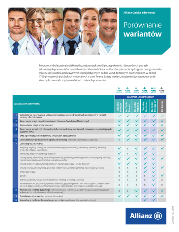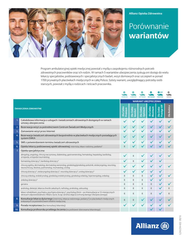 Allianz Opieka Zdrowotna Porównanie wariantów Program ambulatoryjnej opieki medycznej powstał z myślą o zaspokojeniu różnorodnych potrzeb zdrowotnych pracowników oraz ich rodzin. W ramach 5 wariantów ubezpieczenia zyskują oni dostęp do wielu lekarzy specjalistów, podstawowych i specjalistycznych badań, wizyt domowych oraz szczepień w ponad 1700 prywatnych placówkach medycznych w całej Polsce. Szósty wariant, uwzględniający potrzeby osób starszych, powstał z myślą o rodzicach i teściach pracownika. VIP PREMIUM KOMFORT OPTIMUM MAXIMUM PRESTIGE RODZIC Zamawianie wizyt przez Internet 4. Rezerwacja świadczeń zdrowotnych bezpośrednio w placówkach medycznych posiadających system EWKA 5. SMS z potwierdzeniem terminu świadczeń zdrowotnych 6. Opieka lekarzy podstawowej opieki zdrowotnej: internista, lekarz rodzinny, pediatra1) 7. Opieka specjalistyczna: ✓ ✓ ✓ ✓ ✓ ✓ ✓ ✓ ✓ ✓ ✓ ✓ ✓ ✓ ✓ ✓ ✓ ✓ ✓ ✓ ✓ ✓ ✓ ✓ ✓ ✓ ✓ ✓ ✓ ✓ R ✓ ✓ ✓ ✓ ✓ ✓ ✓ ✓ ✓ ✓ onkolog dziecięcy1) R R R geriatra R R R androlog, dietetyk, lekarza chorób zakaźnych, nefrolog, proktolog, seksuolog R R R R lekarz rehabilitant, psychiatra, psychiatra dziecięcy , psycholog (limit – po 4 konsultacje w 12-miesięcznych okresach odpowiedzialności Allianz Życie, licząc od dnia objęcia ochroną danego Ubezpieczonego) R R R R R R ✓ ✓ ✓ ✓ ✓ ✓ ✓ alergolog, angiolog, chirurg naczyniowy, diabetolog, gastroenterolog, hematolog, hepatolog, kardiolog, ortopeda, ortopeda traumatolog hematolog dziecięcy , kardiolog dziecięcy 1) 1) chirurg ogólny, dermatolog, dermatolog wenerolog, ginekolog/ginekolog-położnik, otolaryngolog, neurolog, neurochirurg, okulista, pulmonolog, reumatolog, urolog chirurg dziecięcy , otolaryngolog dziecięcy , neurolog dziecięcy , urolog dziecięcy 1) 1) 1) 1) chirurg onkolog, endokrynolog, ginekolog endokrynolog, ginekolog onkolog, hipertensjolog, onkolog 1) 8. Konsultacje lekarza dyżurnego (internisty, lekarza rodzinnego, pediatry1)) w placówkach medycznych 9. Porada recepturowa (bez konsultacji lekarskiej) 10. ✓ ✓ ✓ ✓ ✓ wskazanych za pośrednictwem Infolinii medycznej Konsultacja profesorska przebiegu leczenia (na podstawie skierowania lekarskiego) –1– R R R R R ✓ ✓ ✓ ✓ ✓ ✓ ✓ ✓ ✓ ✓ ✓ ✓ ✓ ✓ ✓ ✓ ✓ ✓ ✓ R ✓ ✓ ✓ R R ✓ ✓ GZAOZW-K02 09/16 3. Dla Rodzica Rezerwacja wizyt za pośrednictwem Centrum Świadczeń Medycznych Dla Ciebie Prestige VIP 2. Dla Ciebie Maximum Całodobowa informacja o usługach i świadczeniach zdrowotnych dostępnych w ramach umowy ubezpieczenia Dla Ciebie Optimum 1. Dla Ciebie Komfort ŚWIADCZENIA ZDROWOTNE Dla Ciebie Premium WARIANT UBEZPIECZENIA VIP PREMIUM 11. Konsultacja profesorska 12. Limitowane wizyty domowe (2 wizyty w 12-miesięcznych okresach odpowiedzialności Allianz, licząc 13. Nielimitowane wizyty domowe 14. Prowadzenie ciąży: OPTIMUM ✓ od dnia objęcia ochroną danego Ubezpieczonego) opieka lekarza ginekologa, konsultacje lekarskie i badania diagnostyczne dostępne dla danego Ubezpieczonego w ramach wybranego wariantu ubezpieczenia. Badania wykonywane są na podstawie skierowania lekarskiego. 15. KOMFORT ✓ ✓ ✓ MAXIMUM ✓ ✓ ✓ ✓ ✓ Szkoła rodzenia: 17. Konsultacyjne zabiegi ambulatoryjne z zakresu alergologii (na podstawie skierowania lekarskiego): odczulanie lekiem Ubezpieczonego polegające na wykonaniu serii zastrzyków w określonym przez lekarza alergologa czasie ✓ R ✓ ✓ ✓ ✓ ✓ ✓ wykonywanie skórnych testów alergologicznych: punktowych (PRICK) i kontaktowych/płatkowych (PATCH) R R ✓ ✓ ✓ ✓ ✓ ✓ R R ✓ ✓ ✓ R ✓ ✓ ✓ ✓ ✓ ✓ ✓ ✓ ✓ R R R elektrokoagulacja szyjki macicy, krioterapia nadżerek, kolposkopia R R R R ✓ ✓ ✓ ✓ ✓ badanie KTG ✓ ✓ ✓ ✓ ✓ ✓ ✓ ✓ wykonanie doraźnego unieruchomienia w zwichnięciach, skręceniach i drobnych złamaniach, założenie lub zdjęcie opatrunku gipsowego R R R R ✓ ✓ ✓ ✓ ✓ iniekcja dostawowa (Ubezpieczony ponosi koszty podawanych leków) punkcje stawów ✓ ✓ ✓ ✓ ✓ ✓ ✓ ✓ ✓ ✓ ✓ ✓ ✓ ✓ R R R R ✓ R ✓ ✓ ✓ ✓ R R R R ✓ ✓ ✓ ✓ Konsultacyjne zabiegi ambulatoryjne z zakresu chirurgii (na podstawie skierowania lekarskiego): iniekcja dostawowa (Ubezpieczony ponosi koszty podawanych leków), punkcja stawów Konsultacyjne zabiegi ambulatoryjne z zakresu dermatologii (na podstawie skierowania lekarskiego): zeskrobiny zarażonej grzybem płytki paznokcia R dermatoskopia 19. Konsultacyjne zabiegi ambulatoryjne z zakresu ginekologii (na podstawie skierowania lekarskiego): pobranie i wykonanie standardowego wymazu cytologicznego, cytohormonalnego R badanie czystości pochwy – biocenoza 20. 22. Konsultacyjne zabiegi ambulatoryjne z zakresu urologii (na podstawie skierowania lekarskiego): punkcje zatok, płukanie zatok metodą Proteza, płukanie zatok po operacji Caldvell-Luca, anemizacja ujścia zatok, paracenteza R R R R R Ambulatoryjna opieka pielęgniarska (na podstawie skierowania lekarskiego): iniekcje: dożylne, domięśniowe, podskórne, śródskórne (Ubezpieczony ponosi koszty podawanych leków), pomiar ciśnienia tętniczego, próba uczuleniowa na lek, podłączenie wlewu dożylnego/kroplowego (Ubezpieczony ponosi koszty podawanych leków, płynów), zmiana prostego opatrunku i toaleta rany, lewatywa inhalacje (Ubezpieczony ponosi koszty podawanych leków) 25. R R Konsultacyjne zabiegi ambulatoryjne z zakresu laryngologii (na podstawie skierowania lekarskiego): opatrunek uszny z lekiem, pędzlowanie: gardła, jamy ustnej, płukanie uszu, postępowanie zachowawcze w przypadku krwawienia z nosa (założenie gąbki spongostanowej, założenie i usunięcie tamponady przedniej nosa, koagulacja naczyń splotu Kisselbacha), przedmuchiwanie trąbek słuchowych, usuwanie ciała obcego z: ucha, nosa, gardła 24. R R R Konsultacyjne zabiegi ambulatoryjne