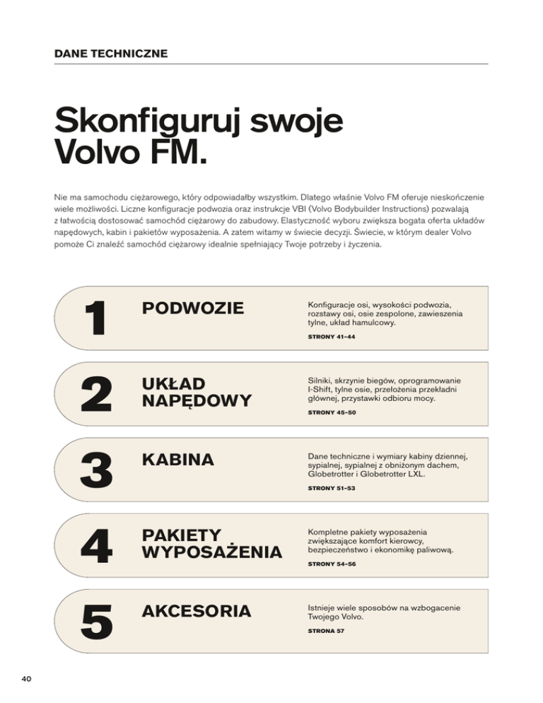 DANE TECHNICZNE Skonfiguruj swoje Volvo FM. Nie ma samochodu ciężarowego, który odpowiadałby wszystkim. Dlatego właśnie Volvo FM oferuje nieskończenie wiele możliwości. Liczne konfiguracje podwozia oraz instrukcje VBI (Volvo Bodybuilder Instructions) pozwalają z łatwością dostosować samochód ciężarowy do zabudowy. Elastyczność wyboru zwiększa bogata oferta układów napędowych, kabin i pakietów wyposażenia. A zatem witamy w świecie decyzji. Świecie, w którym dealer Volvo pomoże Ci znaleźć samochód ciężarowy idealnie spełniający Twoje potrzeby i życzenia. 1 2 3 4 5 40 PODWOZIE Konfiguracje osi, wysokości podwozia, rozstawy osi, osie zespolone, zawieszenia tylne, układ hamulcowy. STRONY 41–44 UKŁAD NAPĘDOWY Silniki, skrzynie biegów, oprogramowanie I‑Shift, tylne osie, przełożenia przekładni głównej, przystawki odbioru mocy. KABINA Dane techniczne i wymiary kabiny dziennej, sypialnej, sypialnej z obniżonym dachem, Globetrotter i Globetrotter LXL. STRONY 45–50 STRONY 51–53 PAKIETY W YPOSAŻENIA Kompletne pakiety wyposażenia zwiększające komfort kierowcy, bezpieczeństwo i ekonomikę paliwową. AKCESORIA Istnieje wiele sposobów na wzbogacenie Twojego Volvo. STRONY 54–56 STRONA 57 PODWOZIE 1 KONFIGURACJA / WYSOKOŚĆ PODWOZIA / ROZSTAW OSI (wymiary w dm) Ciągnik siodłowy 4×2 RAD-L90 High 35 36 37 38 RAD-GR High 35 36 37 38 Med 35 36 37 38 Low 35 36 37 38 X-Low 35 36 37 38 Ciągnik siodłowy 6×2 RADT-AR High 32 34 RADT-GR High 30 32 34 37 Med 30 32 34 37 Low 28,5 30 32 34 37 RAPD-GR High 39 41 Med 39 41 Ciągnik siodłowy 6×4 RADD-BR High 30 32 36 39 RADD-TR1 High 30 32 34 36 39 RADD-TR2 High 30 32 34 36 39 RADD-GR High 30 32 34 36 39 36 39 Ciągnik siodłowy 8×4 RAPDD-GR High KONFIGURACJA / WYSOKOŚĆ PODWOZIA / ROZSTAW OSI (wymiary w dm) Podwozie samochodu ciężarowego 4×2 RAD-L90 High 34 RAD-GR High 34 35 37 40 43 46 49 52 56 60 37 40 43 46 49 52 56 60 63 65 67 37 40 43 46 49 52 56 60 63 65 67 Low 52 56 X-Low 52 56 Med Podwozie samochodu ciężarowego 6×2 RADT-AR High 37 39 43 46 49 52 56 60 RADT-GR High 34 35 37 39 43 46 48 49 52 56 60 Med 35 37 39 43 46 48 49 52 56 60 Low 35 37 39 43 46 48 49 52 56 60 39 43 46 48 49 52 43 46 49 52 56 60 X-Low RAPD-GR High Podwozie samochodu ciężarowego 6×4 RADD-BR High 32 34 37 39 43 46 49 52 56 RADD-TR1 High 32 34 37 39 43 46 49 52 56 52 56 RADD-TR2 High 32 34 37 39 43 46 49 RADD-GR High 32 34 37 39 43 46 49 Med 34 Low 56 37 39 43 46 49 52 56 37 39 43 46 49 52 56 Podwozie samochodu ciężarowego 8×2 RADT-AR High 51 56 60 RADT-GR High 43 43,5 46 49 51 56 60 RAPDT-GR High 43 46 49 51 56 60 Med 43 46 49 51 60 Podwozie samochodu ciężarowego 8×4 RADD-BR High 43 43,5 46 49 51 56 RADD-TR1 High 43 43,5 46 49 51 56 64 RADD-TR2 High 43 43,5 46 49 51 56 60 RADD-GR High 43 46 49 51 56 60 RADDT-GR High 43 46 49 43 46 49 RAPDD-GR High 43 46 49 51 53 56 Med 43 46 49 51 53 56 Med 32 34 37 39 41 37 39 41 62 64 52 52 41 1 PODWOZIE WYSOKOŚCI PODWOZIA X-Low (ciągnik siodłowy) około 810 mm Low około 850 mm Med około 900 mm High około 1000 mm BELKI HOLOWNICZE Dostępne są belki montowane centralnie, częściowo obniżone oraz belki montowane pod ramą, umożliwiające holowanie przyczepy centralnoosiowej. Belki holownicze mogą być mocowane w odstępach co 25 mm. ZBIORNIKI PALIWA Aluminiowe lub stalowe o pojemności od 150 do 900 litrów. Maksymalna pojemność zbiorników paliwa przy montażu łączonym wynosi 1480 litrów (ciągnik siodłowy 4×2). ZBIORNIKI ADBLUE Z tworzywa sztucznego. Pojemność od 32 do 90 l. Pompa AdBlue wbudowana w zbiornik. 42 SIODŁA OSIE WLECZONE Atestowane mocowanie dopuszcza nacisk na siodło wynoszący 36 ton. Ofertę uzupełniają standardowe siodła ISO o różnych wysokościach, mocowane za pośrednictwem kątowników. Dla użytkownika oznacza to dużą swobodę wyboru. Siodło mocowane bezpośrednio do ramy ciągnika jest lżejszą wersją standardowego siodła i nie wymaga stosowania płyty montażowej. Wysokość siodła powyżej ramy zaczyna się od zaledwie około 140 mm. Jako opcja, w specjalnych konfiguracjach, jest dostępny integralny układ smarowania i czujnik podczepienia naczepy. Są dostępne w trzech wersjach: jako niekierowane – z ogumieniem pojedynczym lub bliźniaczym, skrętne samosterowne lub skrętne sterowane elektrohydraulicznie. Dopuszczalny nacisk: 7,5; 9,5 lub 10 ton. OSIE PCHANE Są oferowane w wersji niekierowanej lub skrętnej sterowanej elektrohydraulicznie, dostępne zarówno w ciągnikach siodłowych, jak i podwoziach samochodu ciężarowego. Dopuszczalny nacisk: 7,5 lub 9 ton. DOPUSZCZALNY NACISK NA OŚ AKTYWNY UKŁAD KIEROWNICZY VOLVO PRZEDNIĄ (t) Aktywny, elektryczno-hydraulicznie wspomagany układ kierowniczy (z korektą dynamiczną, tzw. system „torque overlay”). Zapewnia zwiększoną siłę wspomagania przy małych prędkościach jazdy, niweluje szarpnięcia na kole kierownicy i ułatwia utrzymywanie toru jazdy na wprost podczas hamowania na nawierzchniach o zróżnicowanych współczynnikach przyczepności. Koło kierownicy samoczynnie powraca do pozycji środkowej zarówno podczas jazdy do przodu, jak i cofania. Dostępny w ciągnikach siodłowych i podwoziach samochodu ciężarowego 4×2, 6×2, 6×4, 8×2 i 8×4 z pojedynczą osią przednią. Pneum.Mech. X-Low8 – Low 8– Med 910 High910/18* * Z podwójną osią przednią (FAA20/FAA21). PODWOZIE 1 ZAWIESZENIE TYLNE Konfiguracja osi Rodzaj zawieszenia Dopuszcz. nacisk na oś (t) Przekładnia główna RAD-L90 4×2 Resory parab./półelipt. 13 Pojed./zwoln. RAD-GR 4×2 Pneumatyczne 11,5/13 Pojed./zwoln. RADT-AR 6×2 Resory paraboliczne 19/21 Pojed./zwoln. Wleczona niekierowana RADT-GR 6×2/8×2 Pneumatyczne 19/20,5/22,5/23 Pojed./zwoln. Wleczona niekier. / skrętna samost. lub ster. RAPD-GR 6×2 Pneumatyczne 19/22 Pojed./zwoln. Pchana niekier. / skrętna ster. RADD-BR 6×4/8×4 Resory paraboliczne 21 Pojed./zwoln. RADD-TR1 6×4/8×4 Resory parab./półelipt. 23/2