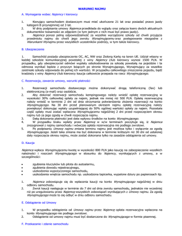 WARUNKI NAJMU A. Wymagania wobec Najemcy i kierowcy 1. Kierujący samochodem dostawczym musi mieć ukończone 21 lat oraz posiadać prawo jazdy kategorii B przynajmniej od 3 lat. 2. W dniu podpisania umowy Najemca przedkłada do wglądu oraz załącza ksero dwóch aktualnych dokumentów tożsamości ze zdjęciem (w tym jednym z nich musi być prawo jazdy). 3. Najemca ponosi pełną odpowiedzialność za wszelkie wyrządzone szkody od chwili przyjęcia przedmiotu najmu do chwili jego zwrotu Wynajmującemu oraz postępowanie niezgodne z Warunkami Wynajmu przez wszystkich uczestników podróży, w tym także kierowcy. B. Ubezpieczenie 1. Samochód posiada ubezpieczenie OC, AC, NW oraz Zieloną Kartę na teren UE. Udział własny w każdej szkodzie komunikacyjnej powstałej z winy Najemcy i/lub kierowcy wynosi 1500 PLN. W przypadku, gdy ubezpieczyciel odmówi wypłaty odszkodowania za szkodę powstałą na pojeździe i ta odmowa wynikać będzie z przyczyn leżących po stronie Wynajmującego, Wynajmujący za wszelkie zaistniałe szkody odpowiada do pełnej ich wartości. W przypadku całkowitego zniszczenia pojazdu, bądź kradzieży z winy Najemcy i/lub kierowcy kaucja całkowicie przepada na rzecz Wynajmującego. C. Rezerwacja, zawarcie umowy, warunki płatności 1. 2. 3. 4. 5. Rezerwacji samochodu dostawczego można dokonywać drogą telefoniczną (fax) lub elektroniczną (e-mail) oraz osobiście. Aby dokonać rezerwacji samochodu kempingowego należy wnieść opłatę rezerwacyjną w wysokości 30% całkowitej opłaty za najem, jednak nie mniej niż 500 PLN. Opłatę rezerwacyjną należy wnieść w terminie 2 dni od dnia otrzymania potwierdzenia złożenia rezerwacji na konto Wynajmującego. Na 30 dni przed planowanym okresem najmu opłatę rezerwacyjną należy powiększyć dokonując wpłaty uzupełniającej do 50% ogólnej wartości opłaty za najem. Pozostała część opłaty musi zostać wpłacona Wynajmującemu najpóźniej 2 dni przed rozpoczęciem okresu najmu lub za jego zgodą w chwili rozpoczęcia najmu. Datą dokonania płatności jest data wpływu środków na konto Wynajmującego. W przypadku braku wpłaty przez Najemcę w w/w terminach poczytuje się, iż Najemca zrezygnował z najmu samochodu i wówczas opłata rezerwacyjna nie podlega zwrotowi. Po podpisaniu Umowy najmu zmiana terminu najmu jest możliwa tylko i wyłącznie za zgodą Wynajmującego. Jeżeli taka zmiana ma być dokonana w terminie krótszym niż 30 dni od ustalonej daty rozpoczęcia okresu najmu, może zostać dokonana tylko na zasadzie odstąpienia od umowy. D. Kaucja Najemca wpłaca Wynajmującemu kwotę w wysokości 800 PLN jako kaucję na zabezpieczenie wszelkich należności i roszczeń Wynajmującego w stosunku do Najemcy, wynikających z umowy, a w szczególności: zgubienia kluczyków lub pilota do autoalarmu, zgubienia dowodu rejestracyjnego, uszkodzenia wypożyczonego samochodu, uszkodzenia wnętrza samochodu np. uszkodzona tapicerka, wypalone dziury po papierosach itp. Najemca zobowiązuje się do wpłacenia kaucji na konto Wynajmującego najpóźniej w dniu odbioru samochodu. 2. Zwrot kaucji następuje w terminie do 7 dni od dnia zwrotu samochodu, jednakże nie wcześniej niż po uregulowaniu przez Najemcę wszystkich zobowiązań wynikających z Umowy najmu. Za zgodą Wynajmującego może to się odbyć w dniu odbioru samochodu. 1. E. Odstąpienie od Umowy W przypadku odstąpienia od Umowy najmu przez Najemcę opłata rezerwacyjna wpłacona na konto Wynajmującego nie podlega zwrotowi. 2. Odstąpienie od umowy najmu musi być dostarczone do Wynajmującego w formie pisemnej. 1. F. Przekazanie i zdanie samochodu 1. 2. 3. 4. 5. W przypadku zdania samochodu po upływie wyznaczonej godziny Najemca zobowiązuje się do zapłaty kary umownej w wysokości 50 zł za każdą rozpoczęta godzinę po upływie terminu. W przypadku opóźnienia w wydaniu samochodu z winy Wynajmującego, zobowiązuje się on do natychmiastowego zwrotu różnicy kosztów wynikających z ilości dni opóźnienia w przekazaniu samochodu. Przed przekazaniem samochodu Najemca jest zobowiązany przejść przeszkolenie w zakresie obsługi samochodu oraz ma możliwość odbycia jazdy próbnej w towarzystwie Wynajmującego. Procedura wydania i zdania samochodu jest zawsze zakończona podpisaniem protokołu zdawczoodbiorczego. Jeżeli Najemca zwróci samochód w terminie wcześniejszym niż wskazany w umowie, Wynajmujący nie jest zobowiązany do zwrotu opłaty z tego tytułu. Jeżeli Najemca nie zwróci pojazdu do 6 godzin po terminie wskazanym w umowie najmu i nie skontaktuje się z Wynajmującym, Wynajmujący poinformuje organa ścigania o kradzieży i spowoduje to całkowitą utratę kaucji. G. Ograniczenia w zakresie użytkowania 1. 2. 3. 4. 5. Samochód dostawczy nie może być wykorzystywany przez Najemcę do celów innych niż przewożenie towarów lub ludzi, a w szczególności nie może brać udziału w imprezach samochodowych, testach samochodów, nie może być także wykorzystywany do transportu ładunków łatwopalnych, materiałów trujących oraz niebezpiecznych. Najemca nie ma prawa do dalszego podnajmu samochodu. Bezwzględnie zabronione jest prowadzenie samochodu pod wpływem alkoholu lub innych używek. Zabronione jest podróżowanie po terenach objętych działaniami wojennymi, rozruchami i zamieszkami. W samochodzie obowiązuje bezwzględny zakaz palenia tytoniu, używania otwartego ognia (np. świece) oraz przewożenia zwierząt. Wynajmujący zastrzega sobie prawo do wykonania wszelkich koniecznych prac związanych z usunięciem zniszczeń powstałych w wyniku palenia tytoniu, używania otwartego ognia w samochodzie lub spowodowanych przez przewożone zwierzęta na koszt Najemcy.