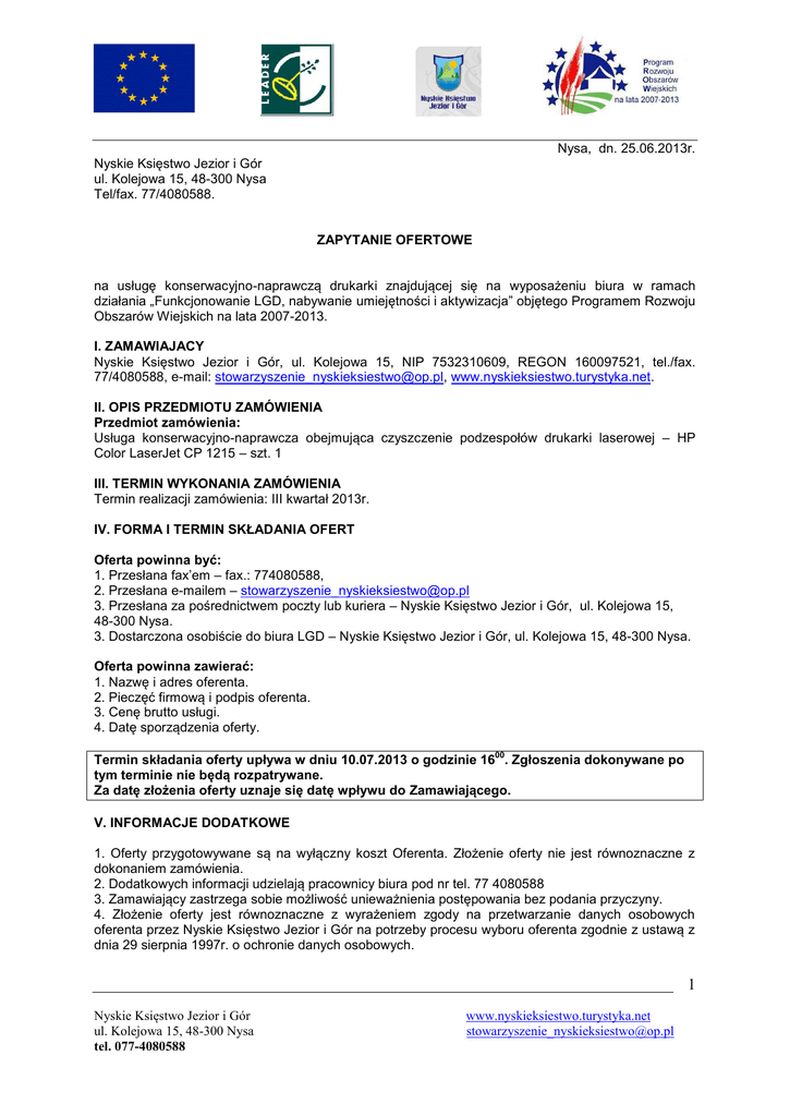 Nysa, dn. 25.06.2013r. Nyskie Księstwo Jezior i Gór ul. Kolejowa 15, 48-300 Nysa Tel/fax. 77/4080588. ZAPYTANIE OFERTOWE na usługę konserwacyjno-naprawczą drukarki znajdującej się na wyposażeniu biura w ramach działania „Funkcjonowanie LGD, nabywanie umiejętności i aktywizacja” objętego Programem Rozwoju Obszarów Wiejskich na lata 2007-2013. I. ZAMAWIAJACY Nyskie Księstwo Jezior i Gór, ul. Kolejowa 15, NIP 7532310609, REGON 160097521, tel./fax. 77/4080588, e-mail: [email protected], www.nyskieksiestwo.turystyka.net. II. OPIS PRZEDMIOTU ZAMÓWIENIA Przedmiot zamówienia: Usługa konserwacyjno-naprawcza obejmująca czyszczenie podzespołów drukarki laserowej – HP Color LaserJet CP 1215 – szt. 1 III. TERMIN WYKONANIA ZAMÓWIENIA Termin realizacji zamówienia: III kwartał 2013r. IV. FORMA I TERMIN SKŁADANIA OFERT Oferta powinna być: 1. Przesłana fax’em – fax.: 774080588, 2. Przesłana e-mailem – [email protected] 3. Przesłana za pośrednictwem poczty lub kuriera – Nyskie Księstwo Jezior i Gór, ul. Kolejowa 15, 48-300 Nysa. 3. Dostarczona osobiście do biura LGD – Nyskie Księstwo Jezior i Gór, ul. Kolejowa 15, 48-300 Nysa. Oferta powinna zawierać: 1. Nazwę i adres oferenta. 2. Pieczęć firmową i podpis oferenta. 3. Cenę brutto usługi. 4. Datę sporządzenia oferty. 00 Termin składania oferty upływa w dniu 10.07.2013 o godzinie 16 . Zgłoszenia dokonywane po tym terminie nie będą rozpatrywane. Za datę złożenia oferty uznaje się datę wpływu do Zamawiającego. V. INFORMACJE DODATKOWE 1. Oferty przygotowywane są na wyłączny koszt Oferenta. Złożenie oferty nie jest równoznaczne z dokonaniem zamówienia. 2. Dodatkowych informacji udzielają pracownicy biura pod nr tel. 77 4080588 3. Zamawiający zastrzega sobie możliwość unieważnienia postępowania bez podania przyczyny. 4. Złożenie oferty jest równoznaczne z wyrażeniem zgody na przetwarzanie danych osobowych oferenta przez Nyskie Księstwo Jezior i Gór na potrzeby procesu wyboru oferenta zgodnie z ustawą z dnia 29 sierpnia 1997r. o ochronie danych osobowych. 1 Nyskie Księstwo Jezior i Gór ul. Kolejowa 15, 48-300 Nysa tel. 077-4080588 www.nyskieksiestwo.turystyka.net [email protected]