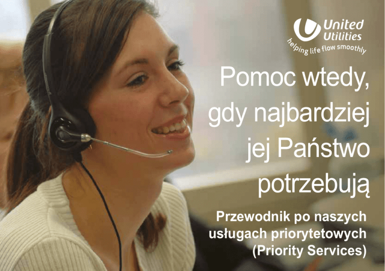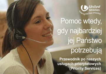 Pomoc wtedy, gdy najbardziej jej Państwo potrzebują Przewodnik po naszych usługach priorytetowych (Priority Services)1 Wstęp Pomoc wtedy, gdy najbardziej jej Państwo potrzebują Wszystkim nam przydaje się dodatkowa pomoc na pewnych etapach naszego życia. Może to być związane z wiekiem, złym stanem zdrowia, niepełnosprawnością, zaburzeniami psychicznymi, kłopotami finansowymi lub barierą językową. Nasze usługi priorytetowe są bezpłatne i dzięki rejestracji będziemy mogli pomóc tym naszym klientom, którzy najbardziej potrzebują dodatkowego wsparcia, i szybko dostosować się do ich szczególnych potrzeb. Niniejsza ulotka wyjaśnia, jakie wsparcie jest dostępne, jeśli zarejestrują się Państwo w usługach priorytetowych. Jeśli uważają Państwo, że nie potrzebują tych usług, proszę się zastanowić, czy członek Państwa rodziny, znajomy lub sąsiad nie chciałby skorzystać z usług priorytetowych, i proszę przekazać im te informacje. Usługi priorytetowe są dostępne dla naszych klientów mieszkających w rejonie północno-zachodnim (North West). Państwa nazwisko nie musi widnieć na rachunku, aby mogli Państwo skorzystać z usług priorytetowych. Rejestracja w usługach priorytetowych jest bardzo łatwa. • • • 2 Proszę do nas zadzwonić pod numer 0345 072 6093 Odwiedzić stronę internetową unitedutilities.com/priorityservices i wypełnić formularz aplikacyjny Wypełnić załączony formularz aplikacyjny i odesłać go do nas Część 1 Usługi priorytetowe... komunikacja z Państwem Zespół gotowy do pomocy Gdy rejestrują się Państwo w usługach priorytetowych, zyskują Państwo dostęp do specjalnie przydzielonego zespołu wyszkolonego, aby jak najlepiej pomóc w odpowiedzi na Państwa pytania. Co roku skontaktujemy się z Państwem, aby upewnić się, że wciąż wspieramy Państwa w najlepszy możliwy sposób. Również raz do roku ocenimy Państwa rachunek za wodę, aby upewnić się, że płacą Państwo najlepszą cenę za otrzymywane od nas usługi. Podczas rejestracji w usługach priorytetowych mogą nam Państwo powiedzieć, w jaki sposób chcieliby Państwo, abyśmy się z Państwem kontaktowali, i w przyszłości będziemy korzystać z tej formy komunikacji. Proszę pamiętać, że wszystko, co nam Państwo powiedzą, traktujemy w sposób ściśle poufny. Program reprezentantów Jeśli mają Państwo problemy z komunikacją lub trudności ze zrozumieniem rachunku i innych informacji, które Państwo od nas otrzymują, mogą Państwo wyznaczyć opiekuna, członka rodziny lub przyjaciela do rozmowy z nami w Państwa imieniu. Ta osoba może również do nas zadzwonić, aby zarejestrować Państwa w usługach priorytetowych, jeśli nie są Państwo w stanie wypełnić załączonego formularza lub osobiście z nami porozmawiać. Możemy również wysłać Państwa rachunek do wskazanej przez Państwa osoby, ale proszę pamiętać, że to wciąż Państwo są odpowiedzialni za uregulowanie rachunku. 3 Usługa Text Relay Jeśli mają Państwo problem ze słuchem lub z mową i korzystają Państwo z telefonu tekstowego, mogą Państwo skorzystać z naszej usługi Text Relay wybierając numer 18001, a następnie numer, pod który chcą Państwo zadzwonić. Ta usługa jest dostępna dla wszystkich numerów telefonów wymienionych w ulotce. Państwa rozmowa zostanie połączona z usługą Text Relay, poprzez którą jeden z pracowników działu obsługi klienta będzie mógł odpowiedzieć na Państwa pytanie. Jeśli kiedykolwiek będą Państwo chcieli się z nami spotkać osobiście, możemy zorganizować obecność tłumacza języka migowego, jeśli byłoby to dla Państwa pomocne. Rachunki w alfabecie Braille’a, dużym drukiem i “mówiące” rachunki Jeśli mają Państwo problemy ze wzrokiem, możemy Państwu wysłać rachunek w alfabecie Braille’a lub dużym drukiem. Możemy również do Państwa zadzwonić i omówić Państwa rachunek, aby wiedzieli Państwo, za co płacą. Program hasła Gdy rejestrują się Państwo w usługach priorytetowych, mogą Państwo wybrać hasło. Potem, jeśli kiedykolwiek będziemy musieli odwiedzić Państwa w domu, podamy hasło, aby wiedzieli Państwo, że osoba, która do Państwa przychodzi, naprawdę dla nas pracuje. Ochroni to Państwa przed oszustami (osobami, które podają się za pracowników United Utilities, aby zdobyć dostęp do Państwa domu). A jeśli powiedzą nam Państwo, że mają Państwo problem z poruszaniem się, kiedy do Państwa przyjdziemy, po zapukaniu poczekamy przed drzwiami o wiele dłużej, aby mieli Państwo czas na dojście do drzwi. 4 Usługi tłumaczeniowe Jeśli woleliby Państwo komunikować się z nami w języku innym niż angielski, możemy zorganizować bezpłatnie tłumacza telefonicznego podczas rozmowy z Państwem. Gdy zarejestrują się Państwo w usługach priorytetowych, mogą Państwo również poprosić o otrzymywanie od nas korespondencji w wybranym przez Państwa języku. Ulotki dostępne na naszej stronie internetowej Na naszej stronie internetowej znajdują się wszystkie ulotki informacyjne, więc mogą je Państwo ściągnąć bez konieczności kontaktu z nami. Możemy przetłumaczyć te ulotki, jeśli chcieliby Państwo je otrzymać w innym języku. Czat internetowy Mogą się Państwo komunikować z nami na naszej stronie internetowej korzystając z internetowego czatu. 5 Część 2 Usługi priorytetowe… i Państwa dostawa wody Zawiadomienia o przerwach w dostawie wody Czasem możemy być zmuszeni do odłączenia Państwu wody z powodu pękniętej rury lub konieczności wykonania ważnych prac konserwacyjnych. Jeśli będziemy musieli odłączyć Państwu wodę w celu przeprowadzenia planowanych prac naprawczych, włożymy Państwu wcześniej do skrzynki na listy kartkę z informacją, kiedy to się stanie. Jeśli są Państwo niewidomi, niedowidzący lub mają Państwo problemy z czytaniem lub rozumieniem po angielsku, skontaktu