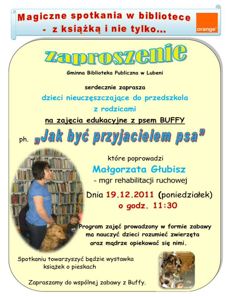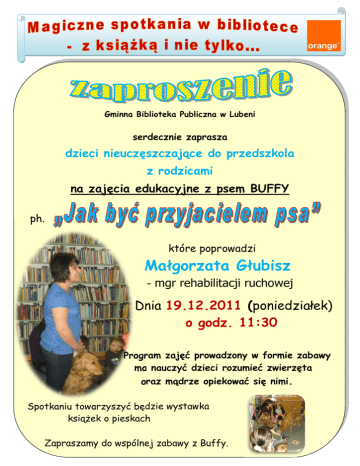 Gminna Biblioteka Publiczna w Lubeni serdecznie zaprasza dzieci nieuczęszczające do przedszkola z rodzicami na zajęcia edukacyjne z psem BUFFY ph. które poprowadzi Małgorzata Głubisz - mgr rehabilitacji ruchowej Dnia 19.12.2011 (poniedziałek) o godz. 11:30 Program zajęć prowadzony w formie zabawy ma nauczyć dzieci rozumieć zwierzęta oraz mądrze opiekować się nimi. Spotkaniu towarzyszyć będzie wystawka książek o pieskach Zapraszamy do wspólnej zabawy z Buffy.