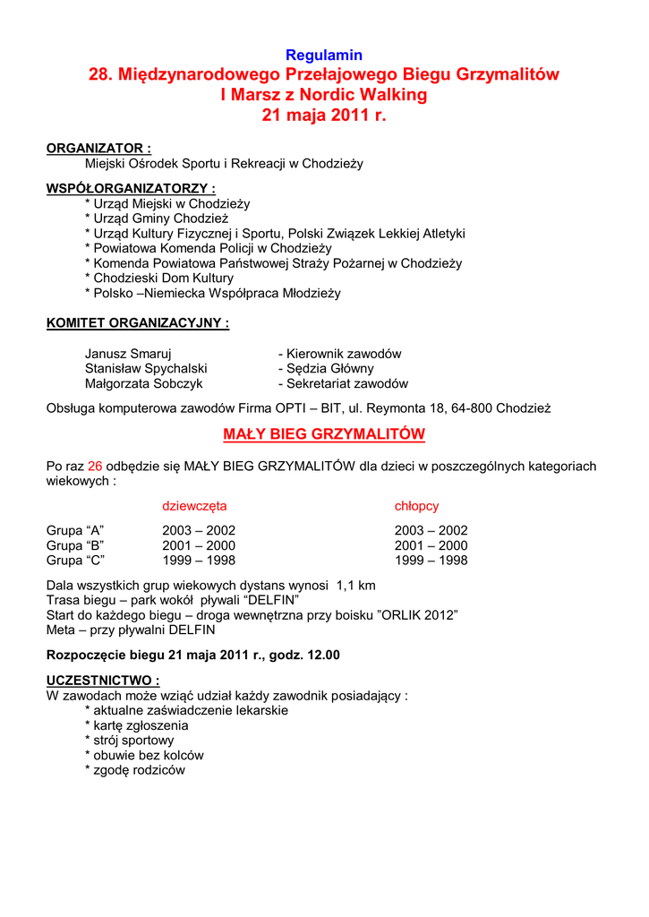 Regulamin 28. Międzynarodowego Przełajowego Biegu Grzymalitów I Marsz z Nordic Walking 21 maja 2011 r. ORGANIZATOR : Miejski Ośrodek Sportu i Rekreacji w Chodzieży WSPÓŁORGANIZATORZY : * Urząd Miejski w Chodzieży * Urząd Gminy Chodzież * Urząd Kultury Fizycznej i Sportu, Polski Związek Lekkiej Atletyki * Powiatowa Komenda Policji w Chodzieży * Komenda Powiatowa Państwowej Straży Pożarnej w Chodzieży * Chodzieski Dom Kultury * Polsko –Niemiecka Współpraca Młodzieży KOMITET ORGANIZACYJNY : - Kierownik zawodów - Sędzia Główny - Sekretariat zawodów Janusz Smaruj Stanisław Spychalski Małgorzata Sobczyk Obsługa komputerowa zawodów Firma OPTI – BIT, ul. Reymonta 18, 64-800 Chodzież MAŁY BIEG GRZYMALITÓW Po raz 26 odbędzie się MAŁY BIEG GRZYMALITÓW dla dzieci w poszczególnych kategoriach wiekowych : Grupa “A” Grupa “B” Grupa “C” dziewczęta chłopcy 2003 – 2002 2001 – 2000 1999 – 1998 2003 – 2002 2001 – 2000 1999 – 1998 Dala wszystkich grup wiekowych dystans wynosi 1,1 km Trasa biegu – park wokół pływali “DELFIN” Start do każdego biegu – droga wewnętrzna przy boisku ”ORLIK 2012” Meta – przy pływalni DELFIN Rozpoczęcie biegu 21 maja 2011 r., godz. 12.00 UCZESTNICTWO : W zawodach może wziąć udział każdy zawodnik posiadający : * aktualne zaświadczenie lekarskie * kartę zgłoszenia * strój sportowy * obuwie bez kolców * zgodę rodziców 28. MIĘDZYNARODOWY PRZEŁAJOWY BIEG GRZYMALITÓW TERMIN I MIEJSCE : Bieg odbędzie się w Chodzieży w dniu 21 maja 2011 r. o godz. 14.00. Start – droga wewnętrzna przy boisku ORLIK 2012 , Meta - przy pływalni “DELFIN” Trasa ok. 5.100 m. wokół Jeziora Miejskiego. UCZESTNICTWO : W zawodach może wziąć udział każdy zawodnik posiadający : * aktualne zaświadczenie lekarskie * kartę zgłoszenia * strój sportowy * obuwie bez kolców SPOSÓB PRZEPROWADZENIA ZAWODÓW : Bieg rozegrany zostanie ze startu wspólnego z podziałem na kategorie wiekowe kobiet i mężczyzn. KATEGORIE WIEKOWE : kobiety 1997 – 1995 1994 – 1991 1990 – 1982 1981 – starsze mężczyźni 1997 – 1995 1994 – 1991 1990 – 1982 1981 – 1972 1971 – 1962 1961 – 1952 1951 - starsi ZGŁOSZENIA : Przyjmuje sekretariat zawodów, który mieści się w budynku krytej pływalni “DELFIN” w Chodzieży, przy ul. Staszica 12, tel/fax. (0-67) 282-02-49, e-mail : [email protected] do dnia 20 maja 2011 r. do godz. 15.30 , oraz w dniu zawodów - osobiście w godzinach od 9.00 do 11.30. NAGRODY : W klasyfikacji generalnej kobiet i mężczyzn zwycięzcy otrzymują nagrody pieniężne i tak : I miejsce - 600,00 zł II miejsce - 500,00 zł III miejsce - 400,00 zł IV miejsce - 300,00 zł V miejsce - 200,00 zł Zwycięzcy w poszczególnych kategoriach wiekowych otrzymają nagrody rzeczowe i dyplomy Zwycięzcy drużynowi w kategorii szkół : podstawowych, gimnazjum i szkół ponadgimnazjalnych otrzymują puchary za zajęcie I-III miejsca. Nagrody dla najlepszego chodzieżaka i chodzieżanki (pula nagród 400,00zł). UWAGI KOŃCOWE : * Obowiązuje limit czasowy dla zawodników „ Dużego Biegu „ – 50 minut. Zawodnicy przekraczający metę po w/w czasie nie będą klasyfikowani. * Organizator w trakcie zawodów zapewnia opiekę medyczną. * Zawodnicy sami ubezpieczają się od następstw nieszczęśliwych wypadków za które organizator nie ponosi odpowiedzialności. * Bieg połączony będzie z festynem rekreacyjnym dla społeczeństwa miasta. * Ostateczna interpretacja regulaminu należy do organizatora. * zdjęcia i wyniki biegu opublikowane będą w prasie i na stronach internetowych . I MARSZ NORDIC WALKING TERMIN I MIEJSCE : Marsz odbędzie się w Chodzieży w dniu 21 maja 2011 r. o godz. 14.10. Start – droga wewnętrzna przy boisku ORLIK 2012 , Meta - przy pływalni “DELFIN” Trasa ok. 5.100 m. wokół Jeziora Miejskiego. ZGŁOSZENIA : Przyjmuje sekretariat zawodów, który mieści się w budynku krytej pływalni “DELFIN” w Chodzieży, przy ul. Staszica 12, tel/fax. (0-67) 282-02-49, e-mail : [email protected] do dnia 20 maja 2011 r. do godz. 15.30 , oraz w dniu zawodów - osobiście w godzinach od 9.00 do 13.30. UCZESTNICTWO : W marszu może wziąć udział każdy chętny posiadający : * oświadczenie o stanie zdrowia ( wypełnione i podpisane w sekretariacie zawodów ). * strój sportowy * obuwie bez kolców * kijki do marszu Marsz wyruszy ze startu wspólnego bez podziału na kategorie wiekowe. NAGRODY : * Dla wszystkich uczestników kończących Marsz, Organizator przewidział okolicznościowe medale porcelanowe. * Wśród uczestników kończących marsz zostaną rozlosowane trzy upominki. UWAGI KOŃCOWE : * Organizator w trakcie zawodów zapewnia opiekę medyczną. * UCZESTNICY sami ubezpieczają się od następstw nieszczęśliwych wypadków za które organizator nie ponosi odpowiedzialności. * Marsz połączony będzie z festynem rekreacyjnym dla społeczeństwa miasta. * Ostateczna interpretacja regulaminu należy do organizatora. * zdjęcia i wyniki biegu opublikowane będą w prasie i na stronach internetowych . * Dla wszystkich uczestników kończących Marsz, Organizator przewidział okolicznościowe medale porcelanowe.