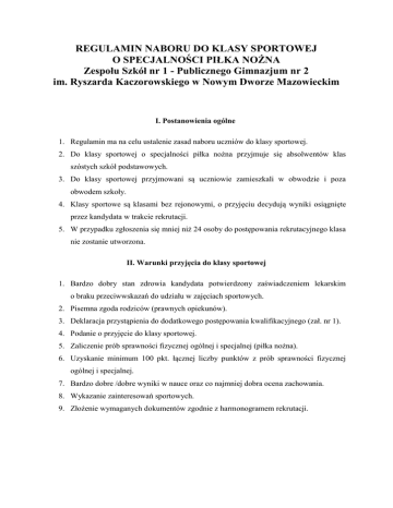 REGULAMIN NABORU DO KLASY SPORTOWEJ O SPECJALNOŚCI PIŁKA NOŻNA Zespołu Szkół nr 1 - Publicznego Gimnazjum nr 2 im. Ryszarda Kaczorowskiego w Nowym Dworze Mazowieckim I. Postanowienia ogólne 1. Regulamin ma na celu ustalenie zasad naboru uczniów do klasy sportowej. 2. Do klasy sportowej o specjalności piłka nożna przyjmuje się absolwentów klas szóstych szkół podstawowych. 3. Do klasy sportowej przyjmowani są uczniowie zamieszkali w obwodzie i poza obwodem szkoły. 4. Klasy sportowe są klasami bez rejonowymi, o przyjęciu decydują wyniki osiągnięte przez kandydata w trakcie rekrutacji. 5. W przypadku zgłoszenia się mniej niż 24 osoby do postępowania rekrutacyjnego klasa nie zostanie utworzona. II. Warunki przyjęcia do klasy sportowej 1. Bardzo dobry stan zdrowia kandydata potwierdzony zaświadczeniem lekarskim o braku przeciwwskazań do udziału w zajęciach sportowych. 2. Pisemna zgoda rodziców (prawnych opiekunów). 3. Deklaracja przystąpienia do dodatkowego postępowania kwalifikacyjnego (zał. nr 1). 4. Podanie o przyjęcie do klasy sportowej. 5. Zaliczenie prób sprawności fizycznej ogólnej i specjalnej (piłka nożna). 6. Uzyskanie minimum 100 pkt. łącznej liczby punktów z prób sprawności fizycznej ogólnej i specjalnej. 7. Bardzo dobre /dobre wyniki w nauce oraz co najmniej dobra ocena zachowania. 8. Wykazanie zainteresowań sportowych. 9. Złożenie wymaganych dokumentów zgodnie z harmonogramem rekrutacji. III. Kwalifikacja uczniów do klasy sportowej 1. W celu przeprowadzenia rekrutacji do klasy sportowej – Dyrektor Szkoły powołuje Szkolną Komisję Rekrutacyjną. 2. W skład komisji wchodzą: a) wicedyrektor jako przewodniczący, b) nauczyciel wychowawca wskazany przez dyrektora szkoły, c) instruktorzy/trenerzy danej dyscypliny sportu będący nauczycielami lub pracownikami Zespołu Szkół nr 1. 3. Szkolna Komisja Rekrutacyjna: a) prowadzi postępowanie kwalifikujące, b) przeprowadza test sprawności ogólnej i ukierunkowanej c) sporządza protokół postępowania kwalifikacyjnego. 4. Tryb odwoławczy: W terminie 7 dni od dnia podania do publicznej wiadomości listy kandydatów przyjętych nieprzyjętych rodzice (prawni opiekunowie) kandydata mogą wystąpić do komisji rekrutacyjnej z wnioskiem o sporządzenie uzasadnienia odmowy przyjęcia kandydata do szkoły. Komisja w ciągu 5 dni sporządza uzasadnienie, w którym podaje przyczynę odmowy przyjęcia. W terminie 7 dni od dnia otrzymania uzasadnienia rodzice (prawni opiekunowie) mogą złożyć odwołanie do dyrektora szkoły. Dyrektor rozpatruje odwołanie w terminie 7 dni od jego otrzymania. 5. Kandydaci do klas sportowych Publicznego Gimnazjum nr 2 im Ryszarda Kaczorowskiego będą przyjmowani w kolejności uzyskanych punktów rekrutacyjnych obliczonych jako suma następujących składników: 5.1 Kryteria ogólne- wszyscy kandydaci do klasy sportowej, bez względu na miejsce zamieszkania, traktowani są jak osoby spoza obwodu szkoły i podlegają rekrutacji zgodnie Uchwałą Rady Miejskiej nr XVII/174 z dnia 8 marca 2016 r., z wyłączeniem §3 ust. 1 pkt. 3 i 5 Maksymalna liczba punktów do zdobycia 99 pkt. 5.2 Testy sprawności ogólnej wybranych cech motorycznych – max 50 pkt. a) szybkość - bieg na 60 m.(max.10 pkt.) b) wytrzymałość szybkościowa – bieg na 300 m.(max.10 pkt.) c) siła mięśni brzucha- siady z leżenia przez 30 sekund(max.10 pkt.) d) wytrzymałość bieg na 100 m max.10 pkt.) e) skoczność – skok w dal z miejsca (max.10 pkt.) Szczegółowy opis testów oraz tabela punktowa w załączniku nr 2. 5.3 Ocena sprawności fizycznej specjalnej – max.80 pkt. Na które składa się: 5.3.1 Test sprawności fizycznej specjalnej PZPN – max. 30 pkt. Szczegółowy opis testu w załączniku nr 3 5.3.2 Ocena umiejętności piłkarskich podczas gry – max 50 pkt. Wykazanie się możliwie najwyższymi umiejętnościami piłkarskimi podczas uproszczonej gry w piłkę nożna w zespołach sześcioosobowych – 50 punktów Szczegółowy opis testu w załączniku nr 4. 6. W przypadku równorzędnych wyników punktowych uzyskanych w postępowaniu kwalifikacyjnym pierwszeństwo w przyjęciu do klasy sportowej maja uczniowie którzy: a) w próbach testu sprawnościowego osiągnął lepszy wynik, b) osiągnął wyższą liczbę punktów ze sprawdzianu szóstoklasisty, c) osiągnął wyższą średnią ocen na koniec szóstej klasy, d) szkołę podstawową ukończył z wyróżnieniem, e) zdobył inne osiągnięcia wymienione na świadectwie ukończenia szkoły. 7. Kandydat może uzyskać łącznie maksymalnie 229 punktów.