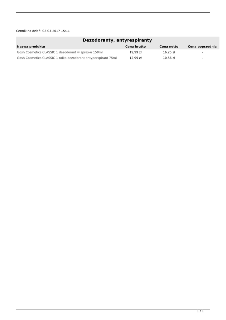Cennik na dzień: 02-03-2017 15:11 Dezodoranty, antyrespiranty Nazwa produktu Cena brutto Cena netto Cena poprzednia Gosh Cosmetics CLASSIC 1 dezodorant w spray-u 150ml 19,99 zł 16,25 zł - Gosh Cosmetics CLASSIC 1 rolka dezodorant antyperspirant 75ml 12,99 zł 10,56 zł - 1/1 Powered by TCPDF (www.tcpdf.org)