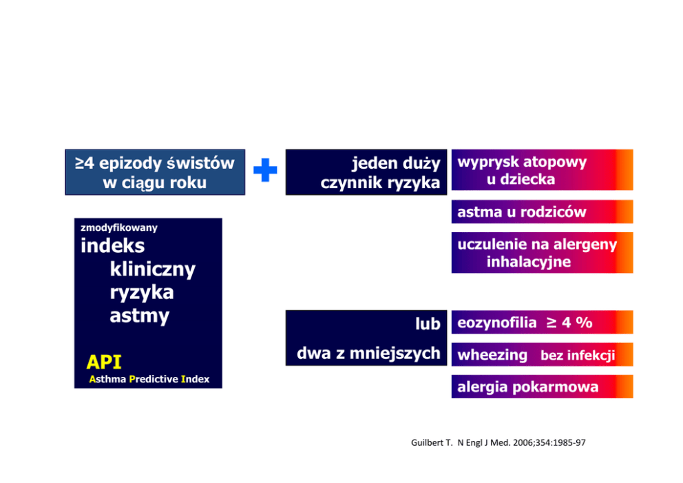Long-term inhaled coricosteroids in preschool children at high risk of asthma ≥4 epizody świstów w ciągu roku jeden duŜy czynnik ryzyka wyprysk atopowy u dziecka astma u rodziców zmodyfikowany indeks kliniczny ryzyka astmy API Asthma Predictive Index uczulenie na alergeny inhalacyjne lub dwa z mniejszych eozynofilia ≥ 4 % wheezing bez infekcji alergia pokarmowa Guilbert T. N Engl J Med. 2006;354:1985-97 Asthma in the preschool child: Still a rose by any other name ? API w przewidywaniu astmy u najmłodszych dzieci Jaka jest wartość API ? API (+) (-) wheezing do 3 r.Ŝ. 93.9 % 86.5 % prawdopodobieństwo wystąpienia astmy w wieku szkolnym bez astmy w 6 r. Ŝ. bez astmy w 13 r. Ŝ. 76% Becker A. J Allergy Clin Immunol 2008;122(Dec):1136-7