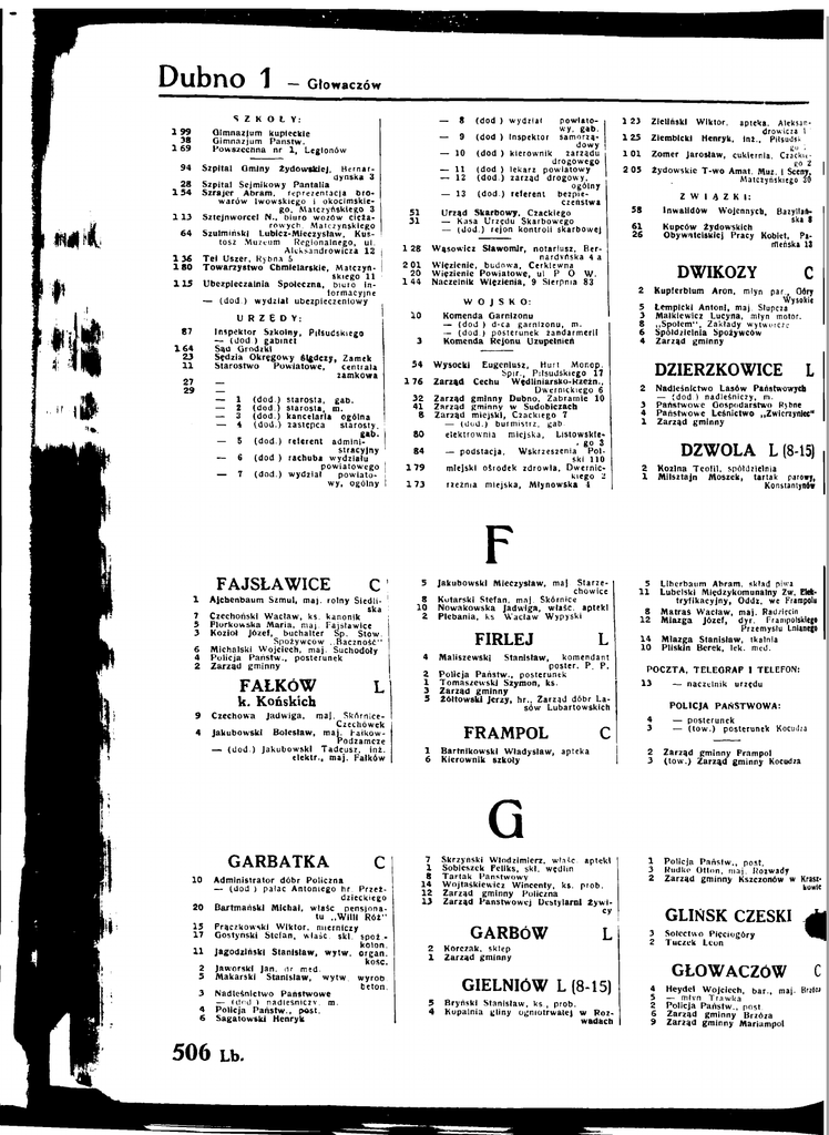 1 Dubno — Głowaczów S Z K O Ł Y : Olmnazjum kupieckie Gimnazjum Państw. Powszechna nr 1 , Legionów 1 99 38 1 69 94 Szpital 28 154 Omlny żydowskiej, Bernar dyńska 3 Szpital Sejmikowy Pantalia Szrajer Abram, reprezentacja bro warów lwowskiego i okocimskie go. Marczyńskiego 3 Sztejnworcel N . , biuro wozów cięża rowych. Matczyńskiego Szulmiński Lublcz-Mieczyslaw, Kus tosz Muzeum Regionalnego, u l . Aleksandrowicza 12 T e l Uszer. Rybna 5 Towarzystwo Cbmlelarskie, Matczyń skiego 11 Ubezpieczalnia Społeczna, biuro I n formacyjne — (dod.) wydział ubezpieczeniowy 113 64 138 180 113 U R Z Ę D Y : Inspektor Szkolny, Piłsudskiego -— (dod.) gabinet Sąd Grodzki Sędzia Okręgowy śledczy, Zamek • Starostwo Powiatowe, centrala zamkowa 87 184 23 11 27 29 1 2 3 4 5 6 7 powiato wy, gab. samorzą dowy zarządu — 10 (dod ) kierownik drogowego 11 (dod.) lekarz powiatowy 12 (dod.) zarząd drogowy, ogólny 13 (dod.) relerent bezpie czeństwa Urząd Skarbowy, Czackiego — Kasa Urzędu Skarbowego — (dod.) rejon kontroli skarbowej (dod.) (dod.) (dod.) (dod.) starosta, gab. starosta, m. kancelaria ogólna zastępca starosty. gab. (dod.) reletent admini stracyjny (dod ) rachuba wydziału powiatowego (dod.) wydział powiato wy, ogólny 51 31 — 8 (dod.) wydział 123 Zieliński Wiktor, — 9 (dod ) Inspektor 123 Zlemblckl 101 2 05 apteka. Aleksan drowicza 1 2 Henryk, Inż., Piłsudskie go 12 Zomer Jarosław, cukiernia, Czackie go 2 Żydowskie T-wo Amal. Muz. I Sceny, Matczyńskiego 30 Z W I Ą Z K I : Inwalidów Wojennych, Bazyliańska 8 Kupców Żydowskich Obywatelskiej Pracy Kobiet, Pa nieńska 13 58 Cl 26 1 28 Wąsowicz Sławomir, notariusz. Ber nardyńska 4 a 2 0 1 Więzienie, budowa, Cerkiewna 20 Wiezienie Powiatowe, ul P O W . 1 4 4 Naczelnik Więzienia, 9 Sierpnia 8 3 dwikozy WOJSKO: Komenda Garnizonu — (dod.) d-ca garnizonu, m. — (dod.) posterunek żandarmerii Komenda Rejonu Uzupełnień 10 54 Wysocki Eugeniusz, Hurt Monop. Spir., Piłsudskiego 17 WędliniarsKo-Kzeźn., Dwernickiego 6 32 Zarząd gminny Dubno, Zabramie 10 41 Zarząd gminny w Sudobiczach 8 Zarząd miejski, Czackiego 7 — (dod.) burmistrz, gab. 80 elektrownia miejska, Listo wskle. go 3 84 — podstacja, Wskrzeszenia Pol ski 110 179 miejski ośrodek zdrowia, Dwernic kiego 'i 173 rzeźnia miejska, Młynowska 1 Zarząd 176 Cechu c Kupferblum Aron, młyn par.. Góry wysokie Lemplckl Antoni, maj. Slupcza Malkiewicz Lucyna, młyn motor. „Spotem", Zakłady wytwórcze Spółdzielnia Spożywców Zarząd gminny dzierzkowice 2 l Nadleśnictwo Lasów Państwowych — (dod.) nadleśniczy, m. Państwowe Gospodarstwo Rybne Państwowe Leśnictwo „Zwierzyniec" Zarząd gminny 3 4 1 dzwola 2 1 L (8-15) Kozina Teofil, spółdzielnia Milsztajn Moszek, tartak parowy, Konstantynów F fajsławice Ajchenbaum Szmul, maj. rolny SledliCzechońskl Wacław, ks. kanonik Piórkowska Maria, maj. Fajsławice Kozioł Józef, buchalter Sp. Stow. Spożywców „Baczność" Michalski Wojciech, maj. Suchodoły Policja Państw., posterunek. Zarząd gminny 9 4 f a ł k ó w k. Końskich Czechowa maj. SkórniceCzechówek Jakubowski Bolesław, maj. KaikowPodzamcze — (dod.) Jakubowski Tadeusz, i n ł . elektr., maj. Falków 5 Jakubowski Mieczysław, ma]. Starzecbowlce Kutarski Stefan, ma). Skórnlce Nowakowska Jadwiga, wlaśc. apteki Plebania, ks. Wacław Wypyskl 8 10 2 firlej 4 2 1 3 5 Jadwiga, Maliszewski komendant poster. P. P. Policja Państw., posterunek Tomaszewski Szymon, ks. Zarząd gminny Żółtowski Jerzy, hr., Zarząd dóbr La sów Lubartowskich frampol 1 6 L Stanisław, c Bartnlkowskl Władysław, apteka Kierownik szkoły 5 Uberbaum Abram. skład piwa 1 1 Lubelski Międzykomunalny Zw. Elek tryfikacyjny, Oddz. we Frampolu 8 Matraś Wacław, maj. Radziecki 12 Miazga Józef, dyr. Frampolskłego Przemysłu Lnianego 14 Miazga Stanisław, tkalnia 10 Pliskin Berek, lek. med. POCZTA, TELEGRAF I TELEFON: 13 — naczelnik urzędu POLICJA PAŃSTWOWA: 4 3 — posterunek — (tow.) posterunek Kocudza 2 3 Zarząd gminny Frampol (tow.) Zarząd gminny Kocudza 1 3 2 Policja Państw., post. Rudkę Otton, maj. Rozwady Zarząd gminny Kszczonów w Kraszkowle G g a r b a t k a 10 20 15 17 11 506 Administrator dóbr Policzna — (dod.) pałac Antoniego hr. Przełdzleckiego Bartmanski Michał, wlaśc pensjona tu „Willi R ó ż " Prączkowskl Wiktor, mierniczy Oostyński Steian, wlaśc. skl. spoż.kolon. Jagodziński Stanisław, wytw. organ, kosc. Jaworski Jan, dr med. Makarski Stanisław,, wytw. wyrób, beton. Nadleśnictwo Państwowe — idod.) nadleśnlczv. m Policja Państw., post. Sagatowski Henryk Lb. 7 1 8 14 12 13 Skrzyński Włodzimierz, wlaśc. apteki Sobieszek Feliks, skl. wędlin Tartak Państwowy Wojtaśklewles Wincenty, ks. prob. Zarząd gminny Policzna Zarząd Państwowej Destylarnl żywi cy garbów 2 1 Korczak, sklep Zarząd gminny g i e l n i ó w l (8-15) 5 4 Bryńskl Stanisław, ks., ptob. Kopalnia gliny ogniotrwałej w Rozwadach glinsk czeski 3 2 L Sołectwo Plęciogóry Tuczek Leon głowaczów C 4 Heydel Wojciech, bar., maj. Bnou 5 — młyn Trawka 2 Policja Państw., post. 6 Zarząd gminny Brzoza 9 Zarząd gminny Mariampol