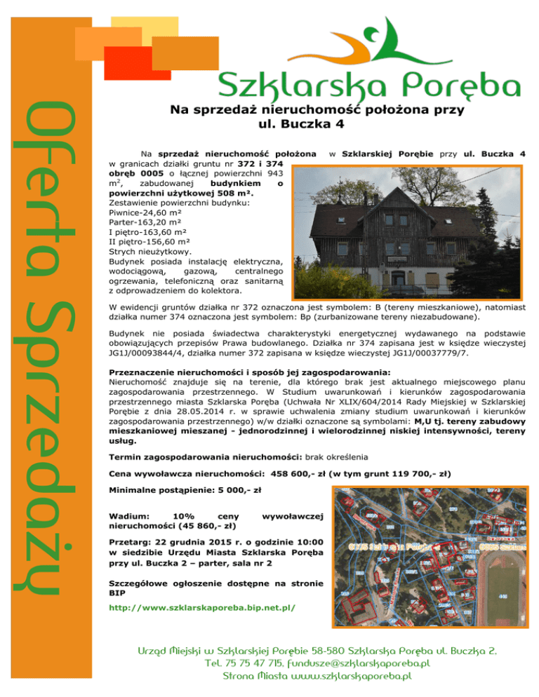 Oferta Sprzedaży Na sprzedaż nieruchomość położona przy ul. Buczka 4 Na sprzedaż nieruchomość położona w granicach działki gruntu nr 372 i 374 obręb 0005 o łącznej powierzchni 943 m2 , zabudowanej budynkiem o powierzchni użytkowej 508 m². Zestawienie powierzchni budynku: Piwnice-24,60 m² Parter-163,20 m² I piętro-163,60 m² II piętro-156,60 m² Strych nieużytkowy. Budynek posiada instalację elektryczna, wodociągową, gazową, centralnego ogrzewania, telefoniczną oraz sanitarną z odprowadzeniem do kolektora. w Szklarskiej Porębie przy ul. Buczka 4 W ewidencji gruntów działka nr 372 oznaczona jest symbolem: B (tereny mieszkaniowe), natomiast działka numer 374 oznaczona jest symbolem: Bp (zurbanizowane tereny niezabudowane). Budynek nie posiada świadectwa charakterystyki energetycznej wydawanego na podstawie obowiązujących przepisów Prawa budowlanego. Działka nr 374 zapisana jest w księdze wieczystej JG1J/00093844/4, działka numer 372 zapisana w księdze wieczystej JG1J/00037779/7. Przeznaczenie nieruchomości i sposób jej zagospodarowania: Nieruchomość znajduje się na terenie, dla którego brak jest aktualnego miejscowego planu zagospodarowania przestrzennego. W Studium uwarunkowań i kierunków zagospodarowania przestrzennego miasta Szklarska Poręba (Uchwała Nr XLIX/604/2014 Rady Miejskiej w Szklarskiej Porębie z dnia 28.05.2014 r. w sprawie uchwalenia zmiany studium uwarunkowań i kierunków zagospodarowania przestrzennego) w/w działki oznaczone są symbolami: M,U tj. tereny zabudowy mieszkaniowej mieszanej - jednorodzinnej i wielorodzinnej niskiej intensywności, tereny usług. Termin zagospodarowania nieruchomości: brak określenia Cena wywoławcza nieruchomości: 458 600,- zł (w tym grunt 119 700,- zł) Minimalne postąpienie: 5 000,- zł Wadium: 10% ceny nieruchomości (45 860,- zł) wywoławczej Przetarg: 22 grudnia 2015 r. o godzinie 10:00 w siedzibie Urzędu Miasta Szklarska Poręba przy ul. Buczka 2 – parter, sala nr 2 Szczegółowe ogłoszenie dostępne na stronie BIP http://www.szklarskaporeba.bip.net.pl/ Urząd Miejski w Szklarskiej Porębie 58-580 Szklarska Poręba ul. Buczka 2, Tel. 75 75 47 715, [email protected] Strona Miasta www.szklarskaporeba.pl
