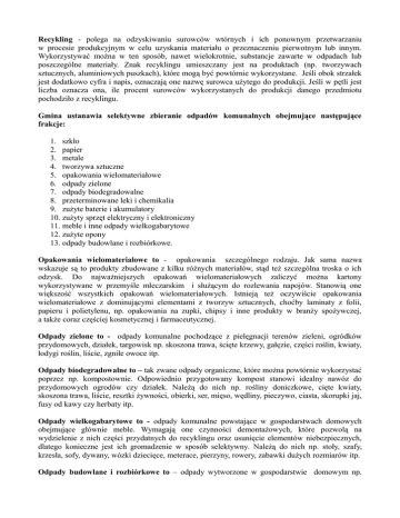 Recykling - polega na odzyskiwaniu surowców wtórnych i ich ponownym przetwarzaniu w procesie produkcyjnym w celu uzyskania materiału o przeznaczeniu pierwotnym lub innym. Wykorzystywać można w ten sposób, nawet wielokrotnie, substancje zawarte w odpadach lub poszczególne materiały. Znak recyklingu umieszczany jest na produktach (np. tworzywach sztucznych, aluminiowych puszkach), które mogą być powtórnie wykorzystane. Jeśli obok strzałek jest dodatkowo cyfra i napis, oznaczają one nazwę surowca użytego do produkcji. Jeśli w pętli jest liczba oznacza ona, ile procent surowców wykorzystanych do produkcji danego przedmiotu pochodziło z recyklingu. Gmina ustanawia selektywne zbieranie odpadów komunalnych obejmujące następujące frakcje: 1. szkło 2. papier 3. metale 4. tworzywa sztuczne 5. opakowania wielomateriałowe 6. odpady zielone 7. odpady biodegradowalne 8. przeterminowane leki i chemikalia 9. zużyte baterie i akumulatory 10. zużyty sprzęt elektryczny i elektroniczny 11. meble i inne odpady wielkogabarytowe 12. zużyte opony 13. odpady budowlane i rozbiórkowe. Opakowania wielomateriałowe to - opakowania szczególnego rodzaju. Jak sama nazwa wskazuje są to produkty zbudowane z kilku różnych materiałów, stąd też szczególna troska o ich odzysk. Do najważniejszych opakowań wielomateriałowych zaliczyć można kartony wykorzystywane w przemyśle mleczarskim i służącym do rozlewania napojów. Stanowią one większość wszystkich opakowań wielomateriałowych. Istnieją też oczywiście opakowania wielomateriałowe z dominującymi elementami z tworzyw sztucznych, choćby laminaty z folii, papieru i polietylenu, np. opakowania na zupki, chipsy i inne produkty w branży spożywczej, a także coraz częściej kosmetycznej i farmaceutycznej. Odpady zielone to - odpady komunalne pochodzące z pielęgnacji terenów zieleni, ogródków przydomowych, działek, targowisk np. skoszona trawa, ścięte krzewy, gałęzie, części roślin, kwiaty, łodygi roślin, liście, zgniłe owoce itp. Odpady biodegradowalne to – tak zwane odpady organiczne, które można powtórnie wykorzystać poprzez np. kompostownie. Odpowiednio przygotowany kompost stanowi idealny nawóz do przydomowych ogrodów czy działek. Należą do nich np. rośliny doniczkowe, cięte kwiaty, skoszona trawa, liście, resztki żywności, obierki, ser, mięso, wędliny, pieczywo, ciasta, skorupki jaj, fusy od kawy czy herbaty itp. Odpady wielkogabarytowe to - odpady komunalne powstające w gospodarstwach domowych obejmujące głównie meble. Wymagają one czynności demontażowych, które pozwolą na wydzielenie z nich części przydatnych do recyklingu oraz usunięcie elementów niebezpiecznych, dlatego konieczne jest ich gromadzenie w sposób selektywny. Należą do nich np. stoły, szafy, krzesła, sofy, dywany, wózki dziecięce, meterace, pierzyny, rowery, zabawki dużych rozmiarów itp. Odpady budowlane i rozbiórkowe to – odpady wytworzone w gospodarstwie domowym np. podczas remontu – drobny gruz, umywalki, muszle klozetowe itp. Odpady niebezpieczne to – odpady które stanowią szczególne zagrożenie dla zdrowia ludzi i środowiska dlatego też gospodarka nimi wymaga prawidłowego prowadzenia i szczególnej kontroli. Odpady niebezpieczne które powstają w gospodarstwach domowych to np. zużyte baterie i akumulatory, resztki farb, lakierów, rozpuszczalników i opakowania po nich, urządzenia zawierające freony, zużyte kartridże, tonery, farby drukarskie, środki do konserwacji i ochrony drewna oraz opakowania po nich, środki ochrony roślin i pojemniki po nich, przeterminowane leki, przedmioty zawierające rtęć (termometry, lampy rtęciowe, świetlówki, przełączniki), detergenty zawierające substancje niebezpieczne i opakowania po nich, pojemniki po aerozolach, pozostałości po domowych środkach do dezynfekcji lub dezynsekcji, smary, środki do konserwacji metali, odczynniki chemiczne wraz z opakowaniami, elektrośmieci czyli zużyty sprzęt AGD, RTV, komputerowy, telefony komórkowe.