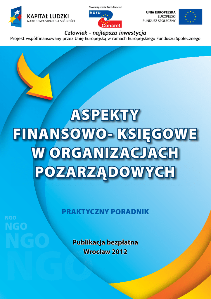 Stowarzyszenie Euro-Concret UNIA EUROPEJSKA EUROPEJSKI FUNDUSZ SPOŁECZNY Człowiek - najlepsza inwestycja Projekt współfinansowany przez Unię Europejską w ramach Europejskiego Funduszu Społecznego ASPEKTY FINANSOWO- KSIĘGOWE W ORGANIZACJACH POZARZĄDOWYCH NGO PRAKTYCZNY PORADNIK NGO NGO NGO Publikacja bezpłatna Wrocław 2012 SPIS TREŚCI I. Wstęp............................................................................................................................... 4 II. Podstawowe akty prawne regulujące gospodarkę finansową............................... 4 III. Formy prowadzenia rachunkowości w organizacjach pozarządowych............................................................................... 5 IV. Polityka rachunkowości i plan kont w organizacjach pozarządowych............................................................................... 6 V. Źródła finansowania.................................................................................................. 23 VI. Koszty organizacji pozarządowych.........................................................................26 VII. Amortyzacja................................................................................................................. 27 VIII. Inwentaryzacja............................................................................................................ 29 IX. Sprawozdawczość organizacji pozarządowych..................................................... 31 X. Podatek dochodowy od osób prawnych..................................................................40 XI. Podatek VAT................................................................................................................42 XII. Podatek od nieruchomości........................................................................................44 XIII. Podatek dochodowy od osób fizycznych................................................................46 XIV. Obowiązki organizacji pozarządowej wobec ZUS............................................... 47 XV. Wolontariat..................................................................................................................48 Zakończenie.................................................................................................................50 3 I WSTĘP Prawidłowe, zgodne z obowiązującymi przepisami, prowadzenie rachunkowości i finansów polegające na rejestracji zdarzeń gospodarczych i prowadzenie racjonalnej gospodarki finansowej powoduje, iż organizacje pozarządowe znajdują się w posiadaniu przejrzystego obrazu prowadzonej działalności. Wytworzone dane finansowe stanowią narzędzie do planowania, organizowania i kontroli czyli zarządzania organizacją. W efekcie skutecznego i efektywnego zarządzanie finansami każda organizacja realizuje cele. Niniejsza publikacja przybliży zasady stosowania przepisów prawa w zakresie polityki rachunkowości, zasad prowadzenia ksiąg rachunkowych, inwentaryzacji i sprawozdawczości w organizacjach pozarządowych oraz sfery podatkowej. Informacje zawarte w niniejszej publikacji umożliwią jednolite stosowanie przepisów prawa, prawidłowe funkcjonowanie rachunkowości i finansów organizacji pozarządowych, a co za tym idzie prowadzenie działalności finansowej zgodnie z obowiązującymi przepisami. Dodatkowo poniższe informacje uregulują podstawy prezentacji sprawozdań finansowych, aby zapewnić porównywalność danych zawartych w sprawozdaniach finansowych jednostki z jej sprawozdaniami z poprzednich okresów oraz ze sprawozdaniami innych jednostek. Zamierzeniem autora jest przybliżenie najistotniejszych kwestii dotyczących sfery finansowej organizacji pozarządowych oraz przekazanie pomocnych informacji dotyczących tak ważnej sfery jaką jest gospodarka finansowa. Mnogość zagadnień realizowanych przez służby finansowe w organizacjach powoduje, iż w niniejszym opracowaniu autor ograniczył się do najistotniejszych zagadnień, które jak wynika z doświadczenia stanowią największą lukę. II PODSTAWOWE AKTY PRAWNE REGULUJĄCE GOSPODARKĘ FINANSOWĄ 1. Ustawa o rachunkowości z 29 września 1994 r. Dz. U z 2009 r. nr 152, poz.1223 z późn. zm. 2. Rozporządzenie Ministra Finansów z dnia 15 listopada 2001r w sprawie szczegółowych zasad rachunkowości dla niektórych spółek nie będących spółkami handlowymi nie prowadzących działalności gospodarczej Dz. U 137 z 2001 r., poz. 1539. 3. Rozporządzeniem Ministra Finansów z dnia 23 grudnia 2004 r. w sprawie obowiązku badania sprawozdań finansowych organizacji pożytku publicznego Dz. U z 2004 r. nr 285 poz.2852 4. Ustawa z dnia 15 marca 1933 o zbiórkach publicznych, Dz. U z 1933 r. 33, poz.162 5. Ustawa z dnia 11 marca 2004 r. o podatku od towarów i usług Dz. U. z 2011 r. nr 177, poz. 1054 tekst jednolity 6. Ustawa o podatku dochodowym od osób prawnych z dnia 15 lutego 1992 Dz. U. z 2011 nr 74 poz. 397 z późn.zm. 4 7. Ustawa o podatku od osób fizycznych z dnia 26 lipca 1991 (Dz. U. z 2012 poz. 361) 8. Ustawa o systemie ubezpieczeń społecznych z dnia 13.10.1998 ( Dz. U. 1998 Nr 137 poz. 887) 9. Ustawa z dnia 28 lipca 1983r o podatku od spadków i darowizn (Dz. U. 1983 Nr 45 poz. 207) 10. Ustawę Prawo o stowarzyszeniach z dnia 7 kwietnia 1989 r. (Dz. U. z 2001 r., Nr 79, poz. 855 z późn. zm.) 11. Ustawa o fundacjach z dnia 6 kwietnia 1984 r. (Dz. U. z 1991 r., Nr 46, poz. 203), 12. Ustawa o działalności pożytku publicznego i o wolontariacie z dnia 24 kwietnia 2003 r. (Dz. U. z 2010 r., Nr 234, poz. 1536 z późn. zm.). III FORMY PROWADZENIE KSIĘGOWOŚCI W ORGANIZACJACH POZARZĄDOWYCH Stowarzyszenie i fundacja jest zobowiązana ustawowo do prowadzenia księgowości, nawet wtedy, gdy jedynym przychodem są składki członkowskie. Obowiązek prowadzenia ksiąg rachunkowych wynika z ustawy o rachunkowości. Księgowość organizacji może być prowadzona w sposób pełny, na podstawie zapisów ustawy o rachu