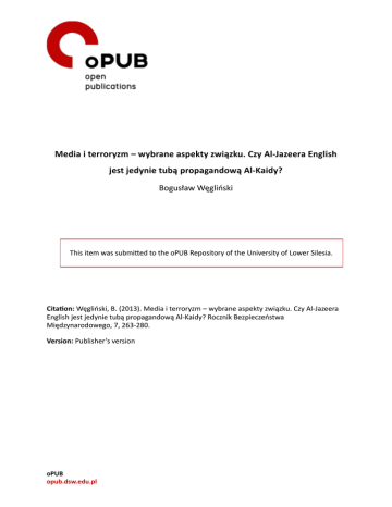" " Media&i&terroryzm&–&wybrane&aspekty&związku.&Czy&Al:Jazeera&English& jest&jedynie&tubą&propagandową&Al:Kaidy?& Bogusław)Węgliński) " This)item)was)submiWed)to)the)oPUB)Repository)of)the)University)of)Lower)Silesia. CitaBon:&Węgliński,)B.)(2013).)Media)i)terroryzm)–)wybrane)aspekty)związku.)Czy)AlGJazeera) English)jest)jedynie)tubą)propagandową)AlGKaidy?)Rocznik)Bezpieczeństwa) Międzynarodowego,)7,)263G280.& Version:)Publisher’s)version) ) oPUB& opub.dsw.edu.pl ) Bogusław WĘGLIŃSKI Dolnośląska Szkoła Wyższa MEDIA I TERRORYZM – WYBRANE ASPEKTY ZWIĄZKU. CZY AL-JAZEERA ENGLISH JEST JEDYNIE TUBĄ PROPAGANDOWĄ AL-KAIDY? Celem artykułu jest ukazanie relacji pomiędzy terrorystami i organizacjami terrorystycznymi a światem mediów. Analizie poddany zostanie aspekt historyczny wzajemnych relacji, a także dynamiczne zmiany zachodzące we wzajemnych stosunkach terrorystów ze współczesnymi organizacjami medialnymi. Autor poddaje także analizie przedsięwzięcie medialne uważane w Europie i Stanach Zjednoczonych za kluczowy przykład współpracy organizacji terrorystycznych z dziennikarzami – Al-Jazeera English. Autor przeanalizuje także wybrane, wewnętrzne kodeksy etyki dziennikarskiej, odnoszące się do przytaczanej problematyki. Podstawowy wniosek, jaki nasuwa się w wyniku analizy wzajemnych oddziaływań mediów i terrorystów, to dynamicznie zmieniająca się rola mediów w przedsięwzięciach terrorystycznych. Z jednej strony organizacje terrorystyczne tworzą własne kanały informacyjne/propagandowe, czy szkoleniowe, z drugiej coraz częściej nie zależy im na pokazaniu tradycyjnych mediach swojej obecności, programu, czy żądań, a jedynie pozostawiają mediom funkcję sprawozdawczą. Przypadek stacji Al-Jazeera English (AJE) i innych stacji pokazuje, że mogą one być tak narzędziami jak i podmiotami tworzenia polityki informacyjnej w zależności od uwarunkowań politycznych, ekonomicznych czy kulturowych. Słowa kluczowe: terroryzm, media, nowe media, Al-Kaida, Al-Jazeera English, terroryzm a media, historia terroryzmu w mediach Media odgrywają coraz większą rolę we współczesnym świecie. Niektórzy badacze twierdzą wręcz wprost, że rola mediów jest zbyt wielka. Warto przytoczyć opinie czynnego dziennikarza Pawła Kwiatkowskiego: Krążymy w błędnym kole, poddając się działaniu nastawionych na zysk mediów, które wprawdzie starają się zaspokajać nasze potrzeby, ale wpierw same ukształtowały te potrzeby, ukazując świat w krzywym zwierciadle. To błędne koło wiruje w tak zawrotnym tempie, że nie mamy już żadnych szans na powrót do źródeł, a więc do sytuacji, w której media niczego nie kreowały, nie starały się zaspokajać naszych potrzeb, ale zwyczajnie mówiły nam o tym, co się wydarzyło językiem prostym i zrozumiałym. Niestety, dzisiejsze sformatowane media mówią nam wyłącznie to, za co skłonni jesteśmy zapłacić – my lub reklamodawcy1. Myślę, że zacytowany fragment nieco zbyt apokaliptycznie diagnozuje dzisiejsze media, nie zmienia to jednak faktu, że ich wpływ na otaczającą nas rzeczywistość jest niewątpliwie znaczący. Wpłynął na to rozwój społeczeństw, a także nieustanna ewolucja mediów. 1 P. Kwiatkowski, Przedsiębiorstwo Apokalipsa – o etyce dziennikarskiej, Rebis, Poznań 2003, s. 223. 264 Rocznik Bezpieczeństwa Międzynarodowego 2012/2013 Celem artykułu jest ukazanie relacji pomiędzy terrorystami i organizacjami terrorystycznymi a światem mediów. Analizie poddany zostanie aspekt historyczny wzajemnych relacji, a także dynamiczne zmiany zachodzące we wzajemnych stosunkach terrorystów ze współczesnymi organizacjami medialnymi. Autor poddaje także analizie przedsięwzięcie medialne uważane w Europie i Stanach Zjednoczonych za kluczowy przykład współpracy organizacji terrorystycznych z dziennikarzami – Al-Jazeera English. Autor przeanalizuje także wybrane, wewnętrzne kodeksy etyki dziennikarskiej, odnoszące się do przytaczanej problematyki. Bruce Hoffman wyróżnia kilka wydarzeń/procesów stanowiących punkty zwrotne w komunikacji masowej: • pierwszym z nich było opisywane wcześniej wynalezienie parowej, a potem rotacyjnej maszyny drukarskiej, • kolejnym znaczącym punktem w historii rozwoju mediów było wystrzelenie przez Stany Zjednoczone w 1968 roku pierwszego satelity telewizyjnego2, • trzecia rewolucja w przekazywaniu informacji nie była już tylko związana z nowymi technologiami; według Hoffmana zrodziło ją raczej powiązanie technologicznych udogodnień, które, nakładając się, zmieniły nie tyle mechanikę prezentacji wiadomości, ile jej styl3. Wynalezienie satelity telekomunikacyjnego jako jedno z ważniejszych wydarzeń w historii rozwoju relacji mediów i terrorystów potwierdzać by mogło dynamiczne pojawienie się bardzo widowiskowej formy terroryzmu, jaką były porwania rejsowych samolotów pasażerskich. Ten rodzaj działań stał się przede wszystkim ulubioną formą działań terrorystów palestyńskich. Można oczywiście wiązać ich aktywność z przegraną przez państwa arabskie wojną sześciodniową, ale rzeczywiście przez kolejne dziesięciolecia relacje z kolejnych aktów piractwa powietrznego często przykuwały zainteresowanie widzów całego świata. O ile terroryści nie mogą funkcjonować bez medialnego rozgłosu, korzyści z tej specyficznej symbiozy odnoszą także media. Według Roberta Borkowskiego to właśnie one znajdują temat będący w centrum zainteresowania odbiorców, co zapewnia komercyjny sukces4. Według tego samego badacza podczas wojny asymetrycznej użycie mediów stanowi istotny element działań. Obrazy przemocy, zniszczeń i cierpień cywilów mają ukazać opinii publicznej wysokość ceny za ignorowanie żądań terrorystów. Twórcy programów informacyjnych chętnie uczestniczą w tego rodzaju spektaklu tworząc z relacji z konfliktu nową jakość „war as 