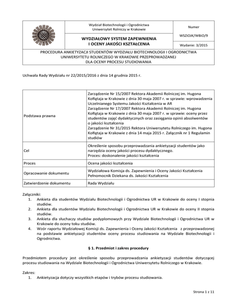Wydział Biotechnologii i Ogrodnictwa Uniwersytet Rolniczy w Krakowie WYDZIAŁOWY SYSTEM ZAPEWNIENIA I OCENY JAKOŚCI KSZTAŁCENIA Numer WSZiOJK/WBiO/9 Wydanie: 3/2015 PROCEDURA ANKIETYZACJI STUDENTÓW WYDZIAŁU BIOTECHNOLOGII I OGRODNICTWA UNIWERSYTETU ROLNICZEGO W KRAKOWIE PRZEPROWADZANEJ DLA OCENY PROCESU STUDIOWANIA Uchwała Rady Wydziału nr 22/2015/2016 z dnia 14 grudnia 2015 r. Podstawa prawna Zarządzenie Nr 15/2007 Rektora Akademii Rolniczej im. Hugona Kołłątaja w Krakowie z dnia 30 maja 2007 r. w sprawie: wprowadzenia Uczelnianego Systemu Jakości Kształcenia w AR Zarządzenie Nr 17/2007 Rektora Akademii Rolniczej im. Hugona Kołłątaja w Krakowie z dnia 30 maja 2007 r. w sprawie: oceny przez studentów zajęć dydaktycznych oraz zasięgania opinii absolwentów o jakości kształcenia Zarządzenie Nr 31/2015 Rektora Uniwersytetu Rolniczego im. Hugona Kołłątaja w Krakowie z dnia 14 maja 2015 r. Załącznik nr 1 Regulamin studiów Cel Określenie sposobu przeprowadzania ankietyzacji studentów jako narzędzia oceny jakości procesu dydaktycznego. Proces: doskonalenie jakości kształcenia Proces Ocena jakości kształcenia Opracowanie dokumentu Wydziałowa Komisja ds. Zapewnienia i Oceny Jakości Kształcenia Pełnomocnik Dziekana ds. Jakości Kształcenia Zatwierdzenie dokumentu Rada Wydziału Załączniki: 1. Ankieta dla studentów Wydziału Biotechnologii i Ogrodnictwa UR w Krakowie do oceny I stopnia studiów. 2. Ankieta dla studentów Wydziału Biotechnologii i Ogrodnictwa UR w Krakowie do oceny II stopnia studiów. 3. Ankieta dla słuchaczy studiów podyplomowych przy Wydziale Biotechnologii i Ogrodnictwa UR w Krakowie do oceny toku studiów. 4. Wzór raportu Wydziałowej Komisji ds. Zapewnienia i Oceny Jakości Kształcenia z przeprowadzonej na podstawie ankietyzacji studentów oceny procesu studiowania na Wydziale Biotechnologii i Ogrodnictwa. § 1. Przedmiot i zakres procedury Przedmiotem procedury jest określenie sposobu przeprowadzania ankietyzacji studentów dotyczącej procesu studiowania na Wydziale Biotechnologii i Ogrodnictwa Uniwersytetu Rolniczego w Krakowie. Zakres: 1. Ankietyzacja dotyczy wszystkich etapów i trybów procesu studiowania. Strona 1 z 11 2. 3. 4. 5. Ocenie podlega sposób organizacji studiów, w tym: plan i program studiów, harmonogram zajęć, praca dziekanatu, samorządu studentów, koła naukowego i biblioteki. Ocenie podlega aktualność treści poszczególnych kursów, spójność i kompletność programu, jakość i warunki prowadzenia zajęć dydaktycznych. Ocenie podlega relacja nauczyciel akademicki – student. Ocenie podlegają warunki finansowe i socjalne studentów w okresie studiowania. § 2. Podstawy i sposób dokonania ankietyzacji 1. 2. 3. 4. Ankietyzację studentów na Wydziale przeprowadza się celem oceny procesu kształcenia i zapewnienia jego właściwej jakości. Ankietyzacja dokonywana jest na podstawie opracowanych ankiet przeznaczonych do wypełnienia przez studentów. Do oceny procesu studiowania (złożenia wypełnionej ankiety) ma prawo każdy student I i II stopnia studiów oraz studiów podyplomowych. Ocena procesu studiowania jest anonimowa i dobrowolna. § 3. Zadania i osoby odpowiedzialne za przeprowadzenie ankietyzacji studentów Wydziału Biotechnologii i Ogrodnictwa Ankietyzacja jest prowadzana przez nauczycieli akademickich – członków Wydziałowej Komisji ds. Zapewnienia i Oceny Jakości Kształcenia Zadanie Osoba odpowiedzialna Opracowanie formularza ankiet do oceny studiowania Komisja Dydaktyczna i Komisja ds. Zapewnienia i Oceny Jakości Kształcenia Przekazanie ankiet studentom i ich odbiór Dziekanat Zestawienie wyników ankiet studenckich Wyznaczeni członkowie Komisji ds. Zapewnienia i Oceny Jakości Kształcenia Przygotowanie raportu z przeprowadzonej ankietyzacji studentów Przewodniczący Komisji Dydaktycznej i Komisji ds. Zapewnienia i Oceny Jakości Kształcenia Przedstawienie rocznego raportu na Radzie Wydziału Pełnomocnik Dziekana ds. Jakości Kształcenia § 4. Harmonogram ankietyzacji 1. 2. 3. 4. 5. 6. Studenci mogą wyrazić opinię o programie kształcenia i planie studiów, nauczycielach akademickich i nauczaniu poprzez uczestnictwo w ocenie prowadzonej w ramach Uczelnianego Systemu Jakości Kształcenia (Regulamin Studiów § 15 pkt. 7.7). Studenci I i II stopnia studiów oraz słuchacze studiów podyplomowych pobierają z wydziałowej strony www lub otrzymują w Dziekanacie ankiety oceniające przebieg studiowania na początku ostatniego semestru toku kształcenia. Wypełnione ankiety studenci składają w wyznaczonym miejscu w Dziekanacie. Wyznaczeni członkowie Komisji ds. Zapewnienia i Oceny Jakości Kształcenia dokonują rocznego zestawienia wyników ankiet studenckich w terminie 60 dni od zakończenia ostatniego semestru toku studiów. Opracowanie raportu końcowego z przeprowadzonej ankietyzacji procesu studiowania powinno nastąpić w ciągu kolejnych 30 dni, tj. najpóźniej 90 dni od zakończenia ostatniego semestru studiów. Roczny raport jest przedstawiany przez Pełnomocnika Dziekana ds. Jakości Kształcenia na Radzie Wydziału podsumowującej proces dydaktyczny danego roku akademickiego. Strona 2 z 11 Załącznik 1 ANKIETA DLA STUDENTÓW WYDZIAŁU BIOTECHNOLOGII I OGRODNICTWA UR W KRAKOWIE DO OCENY I STOPNIA STUDIÓW Dane o absolwencie 1. Kierunek studiów ……………………………….. specjalność ………………………………….. 2. Forma studiów: stacjonarne …………….. niestacjonarne ……………………. 3. Okres studiów od ............................. do .................................. 4. Płeć: kobieta ................ mężczyzna .................. 5. Miejsce stałego zamieszkania: miasto .................... wieś ..................... 6. Ukończona szkoła średnia (zaznacz): liceum ogólnokształcące, technikum, liceum zawodowe, inna szkoła średnia: .............................................................