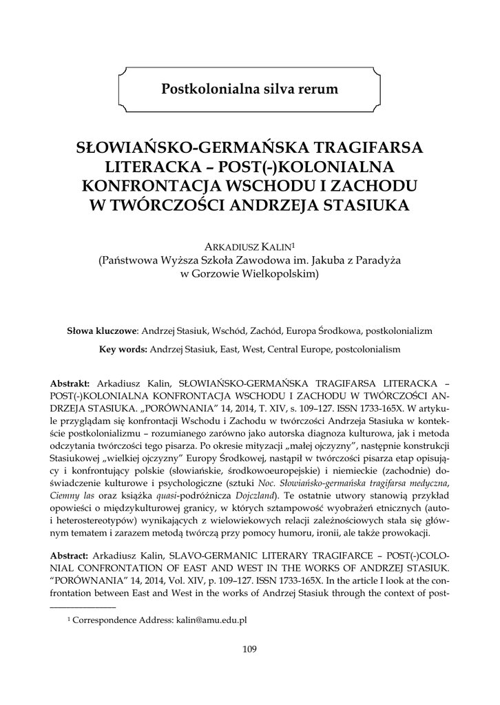 Arkadiusz Kalin, Słowiańsko-germańska tragifarsa literacka – post(-)kolonialna konfrontacja Wschodu i Zachodu Postkolonialna silva rerum SŁOWIAŃSKO-GERMAŃSKA TRAGIFARSA LITERACKA – POST(-)KOLONIALNA KONFRONTACJA WSCHODU I ZACHODU W TWÓRCZOŚCI ANDRZEJA STASIUKA ARKADIUSZ KALIN1 (Państwowa Wyższa Szkoła Zawodowa im. Jakuba z Paradyża w Gorzowie Wielkopolskim) Słowa kluczowe: Andrzej Stasiuk, Wschód, Zachód, Europa Środkowa, postkolonializm Key words: Andrzej Stasiuk, East, West, Central Europe, postcolonialism Abstrakt: Arkadiusz Kalin, SŁOWIAŃSKO-GERMAŃSKA TRAGIFARSA LITERACKA – POST(-)KOLONIALNA KONFRONTACJA WSCHODU I ZACHODU W TWÓRCZOŚCI ANDRZEJA STASIUKA. „PORÓWNANIA” 14, 2014, T. XIV, s. 109–127. ISSN 1733-165X. W artykule przyglądam się konfrontacji Wschodu i Zachodu w twórczości Andrzeja Stasiuka w kontekście postkolonializmu – rozumianego zarówno jako autorska diagnoza kulturowa, jak i metoda odczytania twórczości tego pisarza. Po okresie mityzacji „małej ojczyzny”, następnie konstrukcji Stasiukowej „wielkiej ojczyzny” Europy Środkowej, nastąpił w twórczości pisarza etap opisujący i konfrontujący polskie (słowiańskie, środkowoeuropejskie) i niemieckie (zachodnie) doświadczenie kulturowe i psychologiczne (sztuki Noc. Słowiańsko-germańska tragifarsa medyczna, Ciemny las oraz książka quasi-podróżnicza Dojczland). Te ostatnie utwory stanowią przykład opowieści o międzykulturowej granicy, w których sztampowość wyobrażeń etnicznych (autoi heterostereotypów) wynikających z wielowiekowych relacji zależnościowych stała się głównym tematem i zarazem metodą twórczą przy pomocy humoru, ironii, ale także prowokacji. Abstract: Arkadiusz Kalin, SLAVO-GERMANIC LITERARY TRAGIFARCE – POST(-)COLONIAL CONFRONTATION OF EAST AND WEST IN THE WORKS OF ANDRZEJ STASIUK. “PORÓWNANIA” 14, 2014, Vol. XIV, p. 109–127. ISSN 1733-165X. In the article I look at the confrontation between East and West in the works of Andrzej Stasiuk through the context of post________________ 1 Correspondence Address: [email protected] 109 PORÓWNANIA 14, 2014 colonialism – both understood as an original cultural diagnosis and as a method of reading the writer’s works. Firstly, mythologizing “little homeland”, secondly, designing “the great motherland” of Central Europe, Stasiuk finally made a step toward describing and confronting Polish (Slavic, Central European) and German (Western) cultural and psychological experience (plays Night. Slavo-Germanic medical tragifarce, Dark Woods and the quasi-travelogue book Dojczland). The latter works are examples of cross-border stories in which ethnic clichés (auto- and heterostereotypes) resulting from centuries-old relationship became not only the main literary subject but also a creative method, with the help of humour and irony, as well as provocation. Pochodzę z kraju położonego na wschód od Zachodu i na zachód od Wschodu. S. Mrożek, Kontrakt W formule „post(-)kolonialna” w tytule artykułu zawarta została podstawowa ambiwalencja odczytań twórczości Andrzeja Stasiuka w duchu krytycznej teorii postkolonialnej, a zarazem wieloznaczność nomenklatury badań postkolonialnych, ujawniająca się w ostatnich latach. Rozróżnienie „postcolonial”/„post-colonial” w języku angielskim mogłoby się wydawać tylko obocznością ortograficzną, jednakże zapis z dywizem lub bez odsyłać może również do odmiennych ujęć czy rozumienia postkolonializmu2. Ryzykując spore uproszczenie tej problematyki można by rzec, że określenie „postkolonialna” możemy rozumieć jako odzwierciedlenie stanu skolonizowania, jego obecność w praktykach kulturowych, trwałość takiej mentalności, czyli jako zależnościową relację kolonizator – skolonizowany. Z drugiej strony ujęcie temporalne, dla którego właściwsza byłaby forma „post-kolonialna”, oznaczałoby proces demontażu kolonizacji, przezwyciężania stanu zależności, wydobywania się z niego, stan „po” – a więc też krytyczną nad nim refleksję (wyróżniającą etapy skolonizowania oraz dekolonizacji). Ta niedookreśloność cechująca termin „postkolonializm” właściwa jest też w pewnym sensie – jak sądzę – prozie Stasiuka, skrajnie różnie ocenianej przez interpretatorów w perspektywie postkolonialnej, co postaram się przedstawić na przykładzie utworów dotyczących problematyki polsko-niemieckiej (czy też „słowiańsko-germańskiej”, jak w części nagłówka tego artykułu, która jest zarazem parafrazą podtytułu dramatu Noc Stasiuka), a szerzej – wschodnio-zachodniej. ________________ 2 Obszerne rozważania terminologiczne i metodologiczne dotyczące tego problemu przedstawia D. Skórczewski w artykule Wobec europocentryzmu, dekolonizacji i postmodernizmu. O niektórych problemach teorii postkolonialnej i jej polskich perspektywach. „Teksty Drugie” 2008, nr 1–2. Inne uzasadnienie dla takiego rozróżnienia przedstawia H. Gosk, Opowieści „skolonizowanego/kolonizatora”. W kręgu studiów postzależnościowych nad literaturą polską XX i XXI wieku. Kraków 2010, s. 8–9. 110 Arkadiusz Kalin, Słowiańsko-germańska tragifarsa literacka – post(-)kolonialna konfrontacja Wschodu i Zachodu STASIUK POSTKOLONIALNY Twórczość Andrzeja Stasiuka można dziś postrzegać w szerszej perspektywie jako zespół chronologicznie wyodrębnialnych kompleksów problemowych, choć oczywiście ujęcie takie nie wyczerpuje jej różnorodności tematycznej. Wczesny nostalgiczny Biały kruk stanowił zapowiedź okresu mityzacji małoojczyźnianej z lat 90. ubiegłego wieku (Przez rzekę, Dukla, Opowieści galicyjskie), po czym nastąpiły konstrukcje Stasiukowej „wielkiej ojczyzny” Europy Środkowej (Moja Europa z Jurijem Andruchowyczem [2000], Jadąc do Babadag [2004], Fado [2006], a także Dziennik pisany później [2010]). W tym czasie w twórczości tego pi
