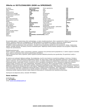 Oferta nr 8375/2566/ODS (DOM na SPRZEDAŻ) Id oferty Stan prawny Cena Powierzchnia Powierzchnia działki Powierzchnia użytkowa Liczba pokoi Rynek Stan nieruchomości Wyposażona kuchnia Woda Typ domu Stan budynku Rok budowy Droga dojazdowa Liczba pięter Garaż Garaż (liczba miejsc) Kształt działki Ogród Dach Ochrona 8375/2566/ODS Teren ogrodzony Własność Gaz 2 300 000 PLN Prąd 250 Siła 1200 Kanalizacja 250 Kominek 6 Telefon Wtórny Internet Idealny Gorąca woda tak Rodzaj ogrzewania tak Liczba sypialni Wolnostojący Typ kuchni Idealny Liczba łazienek 2012 Garderoba Kostka brukowa Powierzchnia działki - jednostka 1 Liczba kondygnacji tak Domofon 2 Alarm Prostokąt Rodzaj kanalizacji tak Ujęcie wody Dachówka ceramiczna Typ pieca tak tak tak tak tak tak tak tak tak Piec gazowy Gazowe 4 Widna 3 tak Sqm 2 tak tak Miejska Miejska Gazowy Na sprzedaż piękny i nowoczesny dom wolnostojący, w stylu rezydencjonalnym. Dom o powierzchni 250m2 w malowniczej okolicy, położony wokół lasu w Magdalence. Działka położona w przepięknym miejscu, słoneczna, bardzo ładnie zagospodarowana, otoczona dużymi drzewami. W otoczeniu nowe domy w zabudowie jednorodzinnej. W pobliżu szkoła podstawowa oraz gimnazjum. Ponadto liczne przedszkola (publiczne oraz prywatne), sklepy, restauracje, apteka, ośrodek zdrowia. W okolicy centrum handlowe Janki. Najbliższa okolica bardzo spokojna oraz przyjazna. Wspaniałe miejsce do zamieszkania. Rozkład pomieszczeń: Parter: kuchnia, jadalnia, salon z kominkiem, łazienka, sypialnia oraz pomieszczenie gospodarcze. Z salonu wyjście na bardzo duży, pięknie usytuowany taras (strona południowo-zachodnia) Piętro: łazienka oraz cztery sypialnie. Jedna sypialnia posiada oddzielną łazienkę oraz garderobę. W sypialniach szafy w zabudowie. W salonie oraz pokojach dębowa podłoga. W przedpokoju, kuchni oraz łazience na parterze podłoga z marmuru. Schody z marmuru (crema marfil) efektownie podświetlone ledami. W całym domu meble pod zabudowę wykonano z bardzo dobrej jakości materiału. W kuchni granitowy blat (cosmic black). W jadalni efektownie podświetlona butelczarka. Dom pobudowany z najwyższej jakości materiałów. Ściany z prothemu 25cm, docieplone styropianem 12cm. Elewacja to połączenie drewna egzotycznego, kamienia oraz tynku silikatowego. Dachówka ceramiczna. Okna sześciokomorowe z bardzo niskim współczynnikiem przenikania. Ogrzewanie gazowe. Ogrzewanie podłogowe w przedpokoju, kuchni oraz wszystkich łazienkach. Efektowne oświetlenie zewnętrzne domu oraz ogrodu. Zagospodarowana działka. Dwa podjazdy z kostki granitowej . Garaż na dwa stanowiska postojowe. Dodatkowo parking dla gości z osobną bramą wjazdową.. Dom wyposażony w instalację alarmową oraz monitoring. Cały dom wykończony w bardzo wysokim standardzie, z najwyższej klasy materiałów. Lokalizacja działki zapewnia bardzo szybki dojazd do Warszawy Al. Krakowską oraz obwodnicą Warszawy. Zachęcam do obejrzenia domu. Kontakt 797700614. Dane maklera Jacek Marczak tel. 797700614 email: [email protected] GRUPA HOME NIERUCHOMOŚCI Powered by TCPDF (www.tcpdf.org)