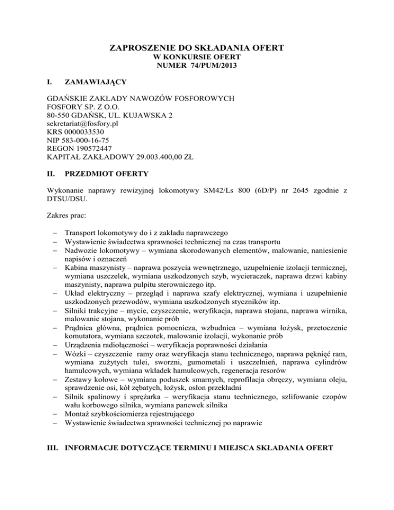 ZAPROSZENIE DO SKŁADANIA OFERT W KONKURSIE OFERT NUMER 74/PUM/2013 I. ZAMAWIAJĄCY GDAŃSKIE ZAKŁADY NAWOZÓW FOSFOROWYCH FOSFORY SP. Z O.O. 80-550 GDAŃSK, UL. KUJAWSKA 2 [email protected] KRS 0000033530 NIP 583-000-16-75 REGON 190572447 KAPITAŁ ZAKŁADOWY 29.003.400,00 ZŁ II. PRZEDMIOT OFERTY Wykonanie naprawy rewizyjnej lokomotywy SM42/Ls 800 (6D/P) nr 2645 zgodnie z DTSU/DSU. Zakres prac: − Transport lokomotywy do i z zakładu naprawczego − Wystawienie świadectwa sprawności technicznej na czas transportu − Nadwozie lokomotywy – wymiana skorodowanych elementów, malowanie, naniesienie napisów i oznaczeń − Kabina maszynisty – naprawa poszycia wewnętrznego, uzupełnienie izolacji termicznej, wymiana uszczelek, wymiana uszkodzonych szyb, wycieraczek, naprawa drzwi kabiny maszynisty, naprawa pulpitu sterowniczego itp. − Układ elektryczny – przegląd i naprawa szafy elektrycznej, wymiana i uzupełnienie uszkodzonych przewodów, wymiana uszkodzonych styczników itp. − Silniki trakcyjne – mycie, czyszczenie, weryfikacja, naprawa stojana, naprawa wirnika, malowanie stojana, wykonanie prób − Prądnica główna, prądnica pomocnicza, wzbudnica – wymiana łoŜysk, przetoczenie komutatora, wymiana szczotek, malowanie izolacji, wykonanie prób − Urządzenia radiołączności – weryfikacja poprawności działania − Wózki – czyszczenie ramy oraz weryfikacja stanu technicznego, naprawa pęknięć ram, wymiana zuŜytych tulei, sworzni, gumometali i uszczelnień, naprawa cylindrów hamulcowych, wymiana wkładek hamulcowych, regeneracja resorów − Zestawy kołowe – wymiana poduszek smarnych, reprofilacja obręczy, wymiana oleju, sprawdzenie osi, kół zębatych, łoŜysk, osłon przekładni − Silnik spalinowy i spręŜarka – weryfikacja stanu technicznego, szlifowanie czopów wału korbowego silnika, wymiana panewek silnika − MontaŜ szybkościomierza rejestrującego − Wystawienie świadectwa sprawności technicznej po naprawie III. INFORMACJE DOTYCZĄCE TERMINU I MIEJSCA SKŁADANIA OFERT − Oferty naleŜy składać w Sekretariacie GZNF FOSFORY Sp. z o.o. 80-550 Gdańsk ul. Kujawska 2, budynek biurowca II piętro z dopiskiem „Oferta wykonania naprawy rewizyjnej lokomotywy SM 42” − Osobą uprawnioną do kontaktów z oferentami jest Pan Łukasz Potrzuski tel. 669 600 002 − Termin składania ofert upływa w dniu 26.02.2013 r. Za datę terminowego doręczenia oferty uwaŜa się datę zarejestrowania oferty w Sekretariacie GZNF. Oferty, które wpłyną po tym terminie nie będą rozpatrywane. IV. KRYTERIA OCENY SPEŁNIENIA WARUNKÓW WYMAGANYCH OD DOSTAWCÓW/WYKONAWCÓW L.p. 1. 2. 3. 4. V. − − − − − − − Kryteria Cena Czas realizacji Referencje Wiarygodność w ocenie członków Komisji Znaczenie 70% 10% 10% 10% OFERTA POWINNA ZAWIERAĆ Szczegółowy zakres robót. Termin wykonania robót. Cenę ofertową za wykonanie kompletnego zakresu robót. Warunki płatności. Warunki gwarancyjne. Informację o kwalifikacjach posiadanej kadry technicznej. Referencje lub informacje o wykonanych pracach podobnego typu. VI. WYMAGANE ZAŁĄCZNIKI − Kserokopia dokumentu rejestrowego oferenta. − Kserokopia numeru NIP, REGON. − Dokumenty pozwalające ocenić wiarygodność techniczną i ekonomiczna oferenta (np. kadra techniczna, sprzęt itp.) − Oświadczenie o sytuacji finansowej zapewniającej wykonanie zamówienia. − Oświadczenie o braku wszczęcia w stosunku do oferenta postępowania upadłościowego lub układowego. − Oświadczenie o nie zaleganiu z uiszczaniem podatków, opłat lub składek na ubezpieczenia społeczne. − Oświadczenie o przyjęciu do wiadomości i stosowania zasad dotyczących obowiązku przestrzegania przepisów BHP oraz w zakresie przestrzegania wymagań ochrony środowiska na terenie GZNF FOSFORY Sp. z o.o. VII. UWAGI KOŃCOWE − Wszystkie dokumenty ofertowe muszą być podpisane przez osoby uprawnione do reprezentowania firmy. − W przypadku zawarcia umowy deklarowane parametry rozliczeń nie będą podlegały zmianie przez cały jej okres działania. − W przypadku wątpliwości lub koniecznych uzupełnień po otwarciu ofert zastrzega się prawo do przeprowadzenia rozmów uzupełniających i ewentualnych negocjacji lub uniewaŜnienia konkursu bez podania przyczyn.