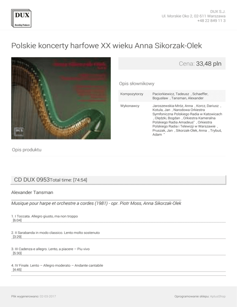 DUX S.J. Ul. Morskie Oko 2, 02-511 Warszawa +48 22 849 11 3 Polskie koncerty harfowe XX wieku Anna Sikorzak-Olek Cena: 33,48 pln Opis słownikowy Kompozytorzy Paciorkiewicz, Tadeusz ∎, Schaeffer, Bogusław ∎, Tansman, Alexander ∎ Wykonawcy Jaroszewskia-Mróz, Anna ∎, Korcz, Dariusz ∎, Kotula, Jan ∎, Narodowa Orkiestra Symfoniczna Polskiego Radia w Katowicach ∎, Olędzki, Bogdan ∎, Orkiestra Kameralna Polskiego Radia Amadeus" ∎, Orkiestra Polskiego Radia i Telewizji w Warszawie ∎, Pruszak, Jan ∎, Sikorzak-Olek, Anna ∎, Trybuś, Adam ∎" Opis produktu CD DUX 0953Total time: [74:54] Alexander Tansman Musique pour harpe et orchestre a cordes (1981) - opr. Piotr Moss, Anna Sikorzak-Olek 1. I Toccata. Allegro giusto, ma non troppo [6:04] 2. II Sarabanda in modo classico. Lento molto sostenuto [3:29] 3. III Cadenza e allegro. Lento, a piacere – Piu vivo [5:30] 4. IV Finale. Lento – Allegro moderato – Andante cantabile [4:45] Plik wygenerowano: 02-03-2017 Oprogramowanie sklepu: AptusShop DUX S.J. Ul. Morskie Oko 2, 02-511 Warszawa +48 22 849 11 3 Tadeusz Paciorkiewicz Concerto na harfę, flet i orkiestrę smyczkową 5. I Allegro non troppo [6:08] 6. II Lento [6:59] 7. III Giocoso [6:04] Bogusław Schaeffer Koncert na harfę i orkiestrę (1986) 8. I ♩ = 48 [6:11] 9. II ♩ = 54 [7:56] 10. III ♩ = 62 [8:03] 11. IV ♩ = 58 [8:10] 12. V ♩ = 56 [5:34] CD DUX 0954Total time: [70:15] Marceli Popławski Morceau de concert na harfę chromatyczną i orkiestrę Plik wygenerowano: 02-03-2017 Oprogramowanie sklepu: AptusShop DUX S.J. Ul. Morskie Oko 2, 02-511 Warszawa +48 22 849 11 3 1. Morceau de concert na harfę chromatyczną i orkiestrę [22:57] Piotr Moss Voyage – koncert na dwie harfy i orkiestrę (2000) 2. Voyage – koncert na dwie harfy i orkiestrę | concerto for two harps and orchestra (2000) [24:36] Jerzy Maksymiuk Muzyka na flet, harfę i orkiestrę 3. Intrada. Lento [5:38] 4. Vivo a piacere [2:56] 5. Quasi scherzo [2:24] 6. Interludium I. Interludium II [2:11] 7. As slow as possible [2:18] 8. Adagio [1:38] 9. Presto [5:38] Wykonawcy: Narodowa Orkiestra Symfoniczna Polskiego Radia w Katowicach Orkiestra Kameralna Polskiego Radia Amadeus Orkiestra Polskiego Radia i Telewizji w Warszawie Adam Trybuś /flet/ Anna Jaroszewskia-Mróz /dyrygent/ Anna Sikorzak-Olek /harfa/ Bogdan Olędzki /dyrygent/ Dariusz Korcz /altówka/ Plik wygenerowano: 02-03-2017 Oprogramowanie sklepu: AptusShop DUX S.J. Ul. Morskie Oko 2, 02-511 Warszawa +48 22 849 11 3 Jan Kotula /kontrabas/ Jan Pruszak /dyrygent/ Plik wygenerowano: 02-03-2017 Powered by TCPDF (www.tcpdf.org) Oprogramowanie sklepu: AptusShop