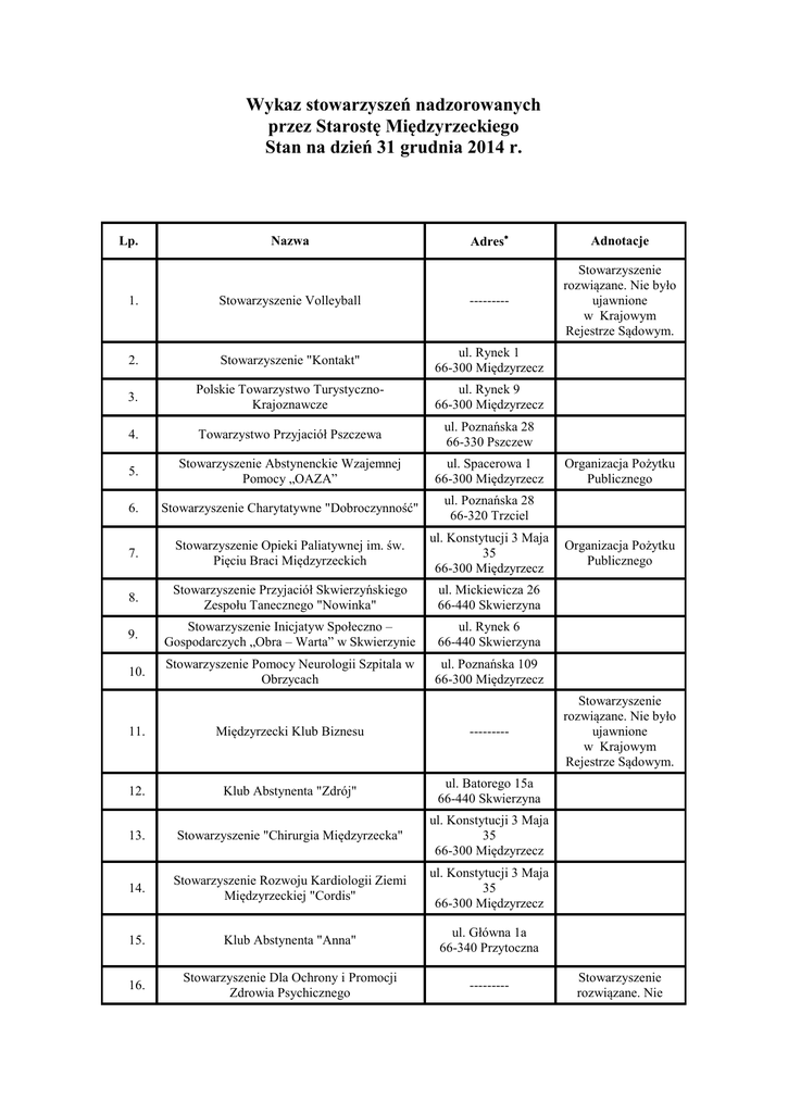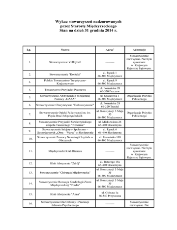 Wykaz stowarzyszeń nadzorowanych przez Starostę Międzyrzeckiego Stan na dzień 31 grudnia 2014 r. Lp. Nazwa Adres Adnotacje Stowarzyszenie rozwiązane. Nie było ujawnione w Krajowym Rejestrze Sądowym. 1. Stowarzyszenie Volleyball --------- 2. Stowarzyszenie "Kontakt" ul. Rynek 1 66-300 Międzyrzecz 3. Polskie Towarzystwo TurystycznoKrajoznawcze ul. Rynek 9 66-300 Międzyrzecz 4. Towarzystwo Przyjaciół Pszczewa ul. Poznańska 28 66-330 Pszczew 5. Stowarzyszenie Abstynenckie Wzajemnej Pomocy „OAZA” ul. Spacerowa 1 66-300 Międzyrzecz 6. Stowarzyszenie Charytatywne "Dobroczynność" ul. Poznańska 28 66-320 Trzciel 7. Stowarzyszenie Opieki Paliatywnej im. św. Pięciu Braci Międzyrzeckich ul. Konstytucji 3 Maja 35 66-300 Międzyrzecz 8. Stowarzyszenie Przyjaciół Skwierzyńskiego Zespołu Tanecznego "Nowinka" ul. Mickiewicza 26 66-440 Skwierzyna 9. Stowarzyszenie Inicjatyw Społeczno – Gospodarczych „Obra – Warta” w Skwierzynie ul. Rynek 6 66-440 Skwierzyna 10. Stowarzyszenie Pomocy Neurologii Szpitala w Obrzycach ul. Poznańska 109 66-300 Międzyrzecz 11. Międzyrzecki Klub Biznesu --------- 12. Klub Abstynenta "Zdrój" ul. Batorego 15a 66-440 Skwierzyna 13. Stowarzyszenie "Chirurgia Międzyrzecka" ul. Konstytucji 3 Maja 35 66-300 Międzyrzecz 14. Stowarzyszenie Rozwoju Kardiologii Ziemi Międzyrzeckiej "Cordis" ul. Konstytucji 3 Maja 35 66-300 Międzyrzecz 15. Klub Abstynenta "Anna" ul. Główna 1a 66-340 Przytoczna 16. Stowarzyszenie Dla Ochrony i Promocji Zdrowia Psychicznego --------- Organizacja Pożytku Publicznego Organizacja Pożytku Publicznego Stowarzyszenie rozwiązane. Nie było ujawnione w Krajowym Rejestrze Sądowym. Stowarzyszenie rozwiązane. Nie wykreślone z KRS 17. Towarzystwo Społeczno-Kulturalne "Obra" Policko 7/1 66-330 Pszczew 18. Stowarzyszenie Agroturystyki ul. Podzamcze 2 66-300 Międzyrzecz 19. Stowarzyszenie Rodziców Dzieci Niepełnosprawnych "Ocalenie" ---------- 20. Stowarzyszenie Rozwoju Ginekologii i Perinatologii ul. Konstytucji 3 Maja 35 66-300 Międzyrzecz Wykreślono z Krajowego Rejestru Sądowego. Stowarzyszenie rozwiązane. Nie było ujawnione w Krajowym Rejestrze Sądowym. 21. Międzynarodowe Centrum Integracyjne w Głębokiem ---------- 22. Lubuskie Stowarzyszenie Promocji i Rozwoju Turystyki ul. Podzamcze 2 66-300 Międzyrzecz 23. Stowarzyszenie Rozwoju Anestezjologii Reanimacji i Intensywnej Terapii Ziemi Lubuskiej "Przywróceni Życiu" ul. Konstytucji 3 maja 35 66-300 Międzyrzecz tel. 0-95 741-22-91 w. 268 24. Stowarzyszenie Fryzjerów i Kosmetyków Województwa Lubuskiego ul. 30-go Stycznia 39 66-300 Międzyrzecz 25. Towarzystwo Miłośników Skwierzyny ul. Sportowa 1 66-440 Skwierzyna 26. Stowarzyszenie Amazonek SP ZOZ Międzyrzecz Zakład Rehabilitacji 27. Międzyrzeckie Stowarzyszenie Rozwoju Pediatrii Międzyrzeckiej ul. Konstytucji 3 Maja 35 Oddział Dziecięcy Samodzielnego Publicznego Zakładu Opieki Zdrowotnej 66-300 Międzyrzecz 28. Międzyrzeckie Stowarzyszenie "Szansa" na Rzecz Dzieci i Młodzieży Niepełnosprawnej Uzdolnionej Artystycznie ul. Staszica 9 66-300 Międzyrzecz 29. Stowarzyszenie Miłośników Trzciela ul. Poznańska 9 66-320 Trzciel Organizacja Pożytku Publicznego Stowarzyszenie rozwiązane. Nie było ujawnione w Krajowym Rejestrze Sądowym. 30. Stowarzyszenie Wzajemnej Pomocy "VIS MAIOR" ---------- 31. Stowarzyszenie Kupieckie w Międzyrzeczu ul. Prusa 1a/9 66-300 Międzyrzecz 32. Stowarzyszenie Nadobrzańskiego Klubu Płetwonurków w Skwierzynie ul. Pola Międzyrzeckie 16A 66-440 Skwierzyna Organizacja Pożytku Publicznego 33. Towarzystwo Przyjaciół św. Klary z Asyżu w Międzyrzeczu ---------- W związku ze zmianą siedziby stowarzyszenia, akta przekazano do nowego Organu Sprawującego Nadzór - Prezydenta Kalisza W związku ze zmianą siedziby stowarzyszenia, akta przekazano do nowego Organu Sprawującego Nadzór - Prezydenta Gorzowa Wlkp. 34. Stowarzyszenie Osób z Uszkodzoną Wątrobą „Życie Po Przeszczepie” ---------- 35. Wolne Dobroczynne Stowarzyszenie "Dary Serca" w Międzyrzeczu ul. Poznańska 109/17b 66-300 Międzyrzecz 36. Koło Stowarzyszenia Rodzin Katolickich w parafii p.w. Św. Jana Chrzciciela w Międzyrzeczu Parafia RzymskoKatolicka p.w. Św. Jana Chrzciciela ul. Spokojna 6 66-300 Międzyrzecz 37. Gminna Grupa Międzyrzeczan ---------- Wykreślono z Krajowego Rejestru Sądowego 38. Stowarzyszenie Budowy i Działalności Ośrodka Leczniczo – Dydaktycznego „Lubuskie Centrum Rehabilitacji i Hipoterapii” w Trzcielu ---------- Wykreślono z Krajowego Rejestru Sądowego. 39. Stowarzyszenie Młodych Skwierzyniaków ul. Teatralna 5 66-440 Skwierzyna 40. Towarzystwo Miłośników Międzyrzeckiego Rejonu Umocnionego w Międzyrzeczu ul. Księdza Skargi 6 66-300 Międzyrzecz 41. Polsko-Niemieckie Stowarzyszenie Europejskiego Kształcenia Zawodowego w Bobowicku ul. Międzyrzecka 7A 66-300 Międzyrzecz 42. Zakład Doskonalenia Zawodowego w Międzyrzeczu Stowarzyszenie Oświatowe ul. Staszica 20 66-300 Międzyrzecz 43. Stowarzyszenie "NASZA WIEŚ JUTRO" Stary Dwór 52 66-304 Brójce 44. Stowarzyszenie Przyjaciół Studia Tańca "REMIX" ul. Teatralna 5 66-440 Skwierzyna Organizacja Pożytku Publicznego 45. Oddział Skwierzyńsko – Międzyrzecki Stowarzyszenia „Dzieci Wojny” w Skwierzynie ---------- Wykreślono z Krajowego Rejestru Sądowego 46. Stowarzyszenie "Zdrowie i Wypoczynek" ul. Poznańska 105b/7 66-300 Międzyrzecz 47. Stowarzyszenie "Jedność Patriotyczna" im. R. ul. Czerwonego Dmowskiego Krzyża 8 66-440 Skwierzyna 48. Stowarzyszenie "Rozwój Poprzez Działanie" Wyszanowo 27A 66-300 Międzyrzecz 49. Stowarzyszenie Noclegownia - Przytulisko im. Najświętszej Marii Panny ul. Chrobrego 26/3 66-300 Międzyrzecz 50. Stowarzyszenie Pomocy Młodzieży „Anastasis” Strychy 42 66-340 Przytoczna 51. Stowarzyszenie Przyjaciół Szkoły Podstawowej w Wierzbnie Wierzbno 31 66-340 Przytoczna 52. Stowarzyszenie Zastępczego Rodzicielstwa Sierczynek 63 66-320 Trzciel 53. St