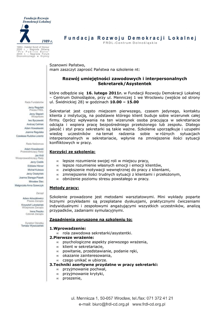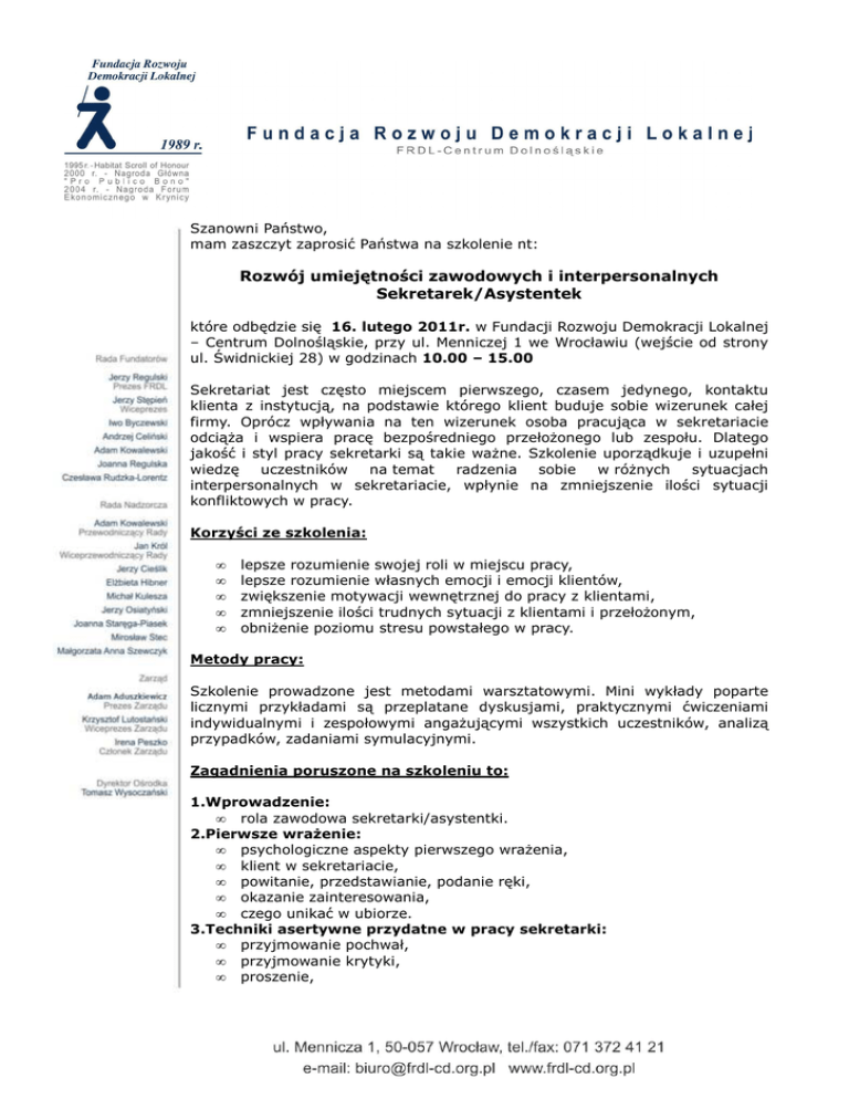 Szanowni Państwo, mam zaszczyt zaprosić Państwa na szkolenie nt: Rozwój umiejętności zawodowych i interpersonalnych Sekretarek/Asystentek które odbędzie się 16. lutego 2011r. w Fundacji Rozwoju Demokracji Lokalnej – Centrum Dolnośląskie, przy ul. Menniczej 1 we Wrocławiu (wejście od strony ul. Świdnickiej 28) w godzinach 10.00 – 15.00 Sekretariat jest często miejscem pierwszego, czasem jedynego, kontaktu klienta z instytucją, na podstawie którego klient buduje sobie wizerunek całej firmy. Oprócz wpływania na ten wizerunek osoba pracująca w sekretariacie odciąża i wspiera pracę bezpośredniego przełożonego lub zespołu. Dlatego jakość i styl pracy sekretarki są takie ważne. Szkolenie uporządkuje i uzupełni wiedzę uczestników na temat radzenia sobie w różnych sytuacjach interpersonalnych w sekretariacie, wpłynie na zmniejszenie ilości sytuacji konfliktowych w pracy. Korzyści ze szkolenia: • • • • • lepsze rozumienie swojej roli w miejscu pracy, lepsze rozumienie własnych emocji i emocji klientów, zwiększenie motywacji wewnętrznej do pracy z klientami, zmniejszenie ilości trudnych sytuacji z klientami i przełożonym, obniżenie poziomu stresu powstałego w pracy. Metody pracy: Szkolenie prowadzone jest metodami warsztatowymi. Mini wykłady poparte licznymi przykładami są przeplatane dyskusjami, praktycznymi ćwiczeniami indywidualnymi i zespołowymi angażującymi wszystkich uczestników, analizą przypadków, zadaniami symulacyjnymi. Zagadnienia poruszone na szkoleniu to: 1.Wprowadzenie: • rola zawodowa sekretarki/asystentki. 2.Pierwsze wrażenie: • psychologiczne aspekty pierwszego wrażenia, • klient w sekretariacie, • powitanie, przedstawianie, podanie ręki, • okazanie zainteresowania, • czego unikać w ubiorze. 3.Techniki asertywne przydatne w pracy sekretarki: • przyjmowanie pochwał, • przyjmowanie krytyki, • proszenie, • odmawianie. 4.Szef i sekretarka: • co sekretarka powinna wiedzieć o szefie? • jak się do siebie zwracać? • jak osłaniać szefa przed nieproszonymi gośćmi? • jak odmawiać prośbom szefa, • trudni szefowie. 5.Telefoniczny kontakt z klientami: • rozmowy przychodzące i wychodzące – podstawowe zasady, • przełączanie rozmów, • jak postępować z interesantami, którzy nie wiedzą z kim chcieliby rozmawiać. Szkolenie poprowadzi: Mirosława Kocoń, dyplomowany trener grupowy (Szkoła Wyższa Psychologii Społecznej/Laboratorium Psychoedukacji), od wielu lat zajmująca się szkoleniami z zakresu obsługi klientów, radzenia sobie ze stresem, komunikacji, negocjacji, budowania zespołów, technik sprzedaży, zarządzania zespołami. Ma doświadczenie w szkoleniu pracowników urzędów, banków, instytucji pomocy społecznej, firm komercyjnych. Współpracuje z FRDL. Cena szkolenia to 299 zł (plus VAT) za pierwszą osobę, dla każdej następnej osoby z tej samej instytucji oferujemy rabat 10%. W cenę szkolenia wliczone są materiały szkoleniowe, zaświadczenie uczestnictwa, catering. Zgłoszenia przyjmujemy do dnia 11.2.2011r UWAGA!!! LICZBA MIEJSC OGRANICZONA!!!
