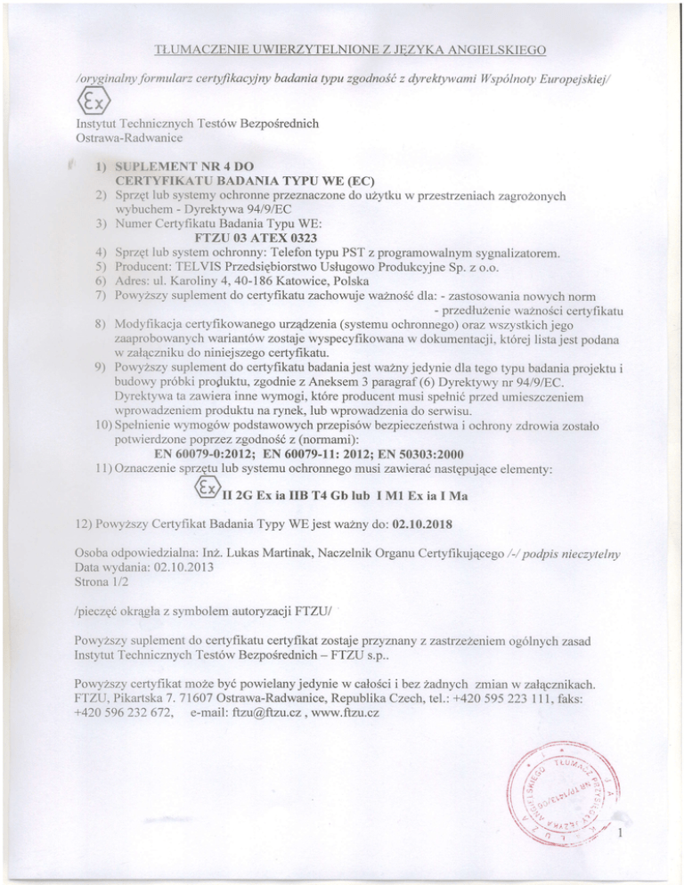DO CERTYFIKATU BADANIA TYPU WE NR FTZU 03 ATEX 0323