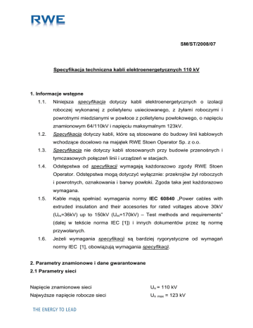 SM/ST/2008/07 Specyfikacja techniczna kabli elektroenergetycznych 110 kV 1. Informacje wstępne 1.1. Niniejsza specyfikacja dotyczy kabli elektroenergetycznych o izolacji roboczej wykonanej z polietylenu usieciowanego, z żyłami roboczymi i powrotnymi miedzianymi w powłoce z polietylenu powłokowego, o napięciu znamionowym 64/110kV i napięciu maksymalnym 123kV. 1.2. Specyfikacja dotyczy kabli, które są stosowane do budowy linii kablowych wchodzące docelowo na majątek RWE Stoen Operator Sp. z o.o. 1.3. Specyfikacja nie dotyczy kabli stosowanych przy budowie przenośnych i tymczasowych połączeń linii i urządzeń w stacjach. 1.4. Odstępstwa od specyfikacji wymagają każdorazowo zgody RWE Stoen Operator. Odstępstwa mogą dotyczyć wyłącznie: przekrojów żył roboczych i powrotnych, oznakowania i barwy powłoki. Zgoda taka jest każdorazowo wymagana. 1.5. Kable mają spełniać wymagania normy IEC 60840 „Power cables with extruded insulation and their accesories for rated voltages above 30kV (Um=36kV) up to 150kV (Um=170kV) – Test methods and requirements” (dalej w tekście norma IEC [1]) i innych dokumentów przez tę normę przywołanych. 1.6. Jeżeli wymagania specyfikacji są bardziej rygorystyczne od wymagań normy IEC [1], obowiązują wymagania specyfikacji. 2. Parametry znamionowe i dane gwarantowane 2.1 Parametry sieci Napięcie znamionowe sieci Un = 110 kV Najwyższe napięcie robocze sieci Un max = 123 kV Częstotliwość znamionowa f = 50 Hz Punkt neutralny uziemiony bezpośrednio Największy spodziewany prąd zwarciowy 3-f i 1-f 40 kA Maksymalny czas wyłączenia zwarcia 3-f i 1-f 0,5 sekundy 3. Parametry kabla Przekroje żył roboczych i powrotnych będą każdorazowo określone w zamówieniu. Pozostałe parametry określono w punkcie 3.1. 3.1. Wymagania konstrukcyjne kabla RWE Stoen Operator dopuszcza do stosowania w sieci kable 110 kV o następującej konstrukcji: 3.1.1. Żyła robocza miedziana, okrągła, wielodrutowa, zagęszczana, miedź elektrolityczna spełniająca wymagania czystości jak dla miedzi M1E. Kable o przekroju znamionowym żyły roboczej 300, 400 i 500mm2 dla wykonywania połączeń rozdzielnia- transformator, a o przekrojach 630, 800, 1000 i 1200 mm2 do wszystkich zastosowań. Wymagane jest dodatkowo, aby żyła robocza o przekroju 1200 mm2 była wykonana jako segmentowa, o segmentach wzajemnie izolowanych (żyła Millikena), przynajmniej 5-cio segmentowa. 3.1.2. Warstwa półprzewodząca na żyle z polietylenu półprzewodzącego o grubości minimalnej 0,6mm. Rezystywność maksymalna polietylenu półprzewodzącego 1000 Ωm. 3.1.3. Izolacja robocza wykonana z polietylenu usieciowanego o grubości znamionowej co najmniej 15mm. Rezystywność minimalna polietylenu izolacyjnego 1016 Ωcm, tangens kąta stratności przy U0 i temp. 900C maksymalnie 10-3, przenikalność dielektryczna w temp. 200C na poziomie 2,4 z dokładnością 20%. 3.1.4. Warstwa półprzewodząca z polietylenu półprzewodzącego na izolacji roboczej o grubości minimalnej 0,8mm i o rezystywności maksymalnej polietylenu półprzewodzącego 500 Ωm. 3.1.5. Obie warstwy półprzewodzące i izolacja robocza wytłaczane w jednym procesie, trwale spojone ze sobą, sieciowane w procesie suchym. 3.1.6. Żyła powrotna wykonana z drutów miedzianych (materiał spełniający wymagania takie, jak dla żyły roboczej), o przekrojach 95 mm2, 120 mm2 lub 150 mm2 każdorazowo określanych w zamówieniu. 3.1.7. Żyła powrotna nawinięta jednowarstwowo, zabezpieczana nawiniętą przeciwskrętnie taśmą miedzianą o grubości 0,2mm. Przekrój taśmy może być wliczony do przekroju żyły powrotnej. 3.1.8. Zapora przeciwwilgociowa wzdłużna z materiałów pęczniejących pod wpływem wilgoci umieszczonych w obszarze żyły powrotnej. 3.1.9. Zapora przeciwwilgociowa wykonana z laminowanej promieniowa taśmy nałożona metalowej, na spojonej żyłę z powrotną, wewnętrzną powierzchnią powłoki zewnętrznej kabla. 3.1.10. Zewnętrzna powłoka wykonana z polietylenu powłokowego odpornego na działanie czynników środowiskowych o grubości znamionowej 3..3,2mm i minimalnej punktowej 2,75mm. Standardowa barwa powłoki czarna. 3.2. Oznakowanie kabla Na powłoce kabla powinny być naniesione co najmniej następujące informacje: a) nazwa producenta kabla, b) rok produkcji, c) oznaczenie typu kabla zawierające informacje o jego napięciu i przekrojach żył, d) znaczniki długości. Oznaczenia wymienione w lit. a, b i c umieszczone nie rzadziej niż co 2 metry, oznaczenie wymienione w lit. d umieszczone co 1 metr. 3.3. Wymagane parametry elektryczne kabla Rezystywność żył roboczej i powrotnej dla DC przy 200C przeliczona na 1mm2 przekroju żyły - maksimum 17,6 Ω/km*mm2 Minimalna gęstość 1-sekundowego prądu zwarciowego żyły roboczej – 140 A/mm2. Minimalna gęstość 1-sekudowego prądu zwarciowego żyły powrotnej – 200 A/mm2. Poziom wyładowań niezupełnych przy napięciu 2U0 AC 50Hz nie więcej niż 2 pC. Poziom wytrzymałości elektrycznej: próba AC 1 minutowa nie mniej niż 230kV, próba LI udarowem piorunowym 1,2/50μs nie mniej niż 550kV. 4. Wymagane badania 4.1. Badania typu i systemu. Do stosowania w swojej sieci RWE Stoen Operator dopuszcza tylko te kable i osprzęt kablowy tworzące system kablowy, dla których przeprowadzone zostały badania kolejnych elementów i całego systemu kablowego zgodnie z normą IEC [1]. Badania typu muszą być przeprowadzone lub potwierdzone przez laboratorium akredytowane, posiadające świadectwo akredytacji wydane przez jednostkę zrzeszoną w International Accreditation Forum (w Polsce jest to Polskie Centrum Akredytacji). Wszystkie składane dokumenty muszą być napisane w języku polskim lub mieć załączone tłumaczenie na język polski. 4.2. Badania odbiorcze kabli. Badania odbiorcze przeprowadzone u producenta dotyczą wszystkich zamówionych odcinków kabli i obejmują: oględziny zewnętrzne pod kątem braku u