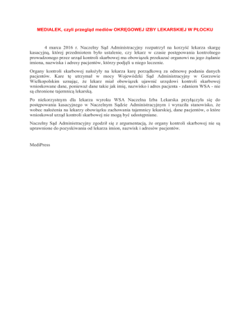 MEDIALEK, czyli przegląd mediów OKRĘGOWEJ IZBY LEKARSKIEJ W PŁOCKU 4 marca 2016 r. Naczelny Sąd Administracyjny rozpatrzył na korzyść lekarza skargę kasacyjną, której przedmiotem było ustalenie, czy lekarz w czasie postępowania kontrolnego prowadzonego przez urząd kontroli skarbowej ma obowiązek przekazać organowi na jego żądanie imiona, nazwiska i adresy pacjentów, którzy podjęli u niego leczenie. Organy kontroli skarbowej nałożyły na lekarza karę porządkową za odmowę podania danych pacjentów. Kare tę utrzymał w mocy Wojewódzki Sąd Administracyjny w Gorzowie Wielkopolskim uznając, że lekarz miał obowiązek ujawnić urzędowi kontroli skarbowej wnioskowane dane, ponieważ dane takie jak imię, nazwisko i adres pacjenta - zdaniem WSA - nie są chronione tajemnicą lekarską. Po niekorzystnym dla lekarza wyroku WSA Naczelna Izba Lekarska przyłączyła się do postępowania kasacyjnego w Naczelnym Sądzie Administracyjnym i wyraziła stanowisko, że wobec nałożenia na lekarzy obowiązku zachowania tajemnicy lekarskiej, dane pacjentów, o które wnioskował urząd kontroli skarbowej nie mogą być udostępniane. Naczelny Sąd Administracyjny zgodził się z argumentacją, że organy kontroli skarbowej nie są uprawnione do pozyskiwania od lekarza imion, nazwisk i adresów pacjentów. MediPress