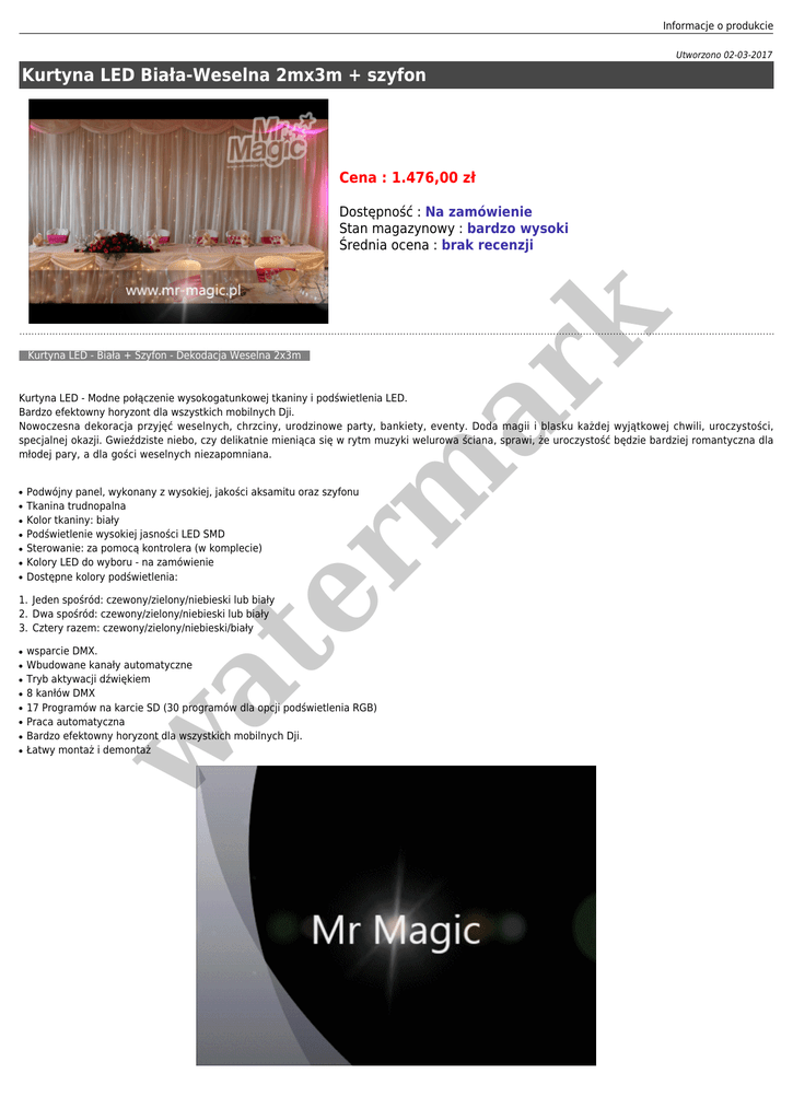 Informacje o produkcie Utworzono 02-03-2017 Kurtyna LED Biała-Weselna 2mx3m + szyfon Cena : 1.476,00 zł er m ar k Dostępność : Na zamówienie Stan magazynowy : bardzo wysoki Średnia ocena : brak recenzji Kurtyna LED - Biała + Szyfon - Dekodacja Weselna 2x3m Kurtyna LED - Modne połączenie wysokogatunkowej tkaniny i podświetlenia LED. Bardzo efektowny horyzont dla wszystkich mobilnych Dji. Nowoczesna dekoracja przyjęć weselnych, chrzciny, urodzinowe party, bankiety, eventy. Doda magii i blasku każdej wyjątkowej chwili, uroczystości, specjalnej okazji. Gwieździste niebo, czy delikatnie mieniąca się w rytm muzyki welurowa ściana, sprawi, że uroczystość będzie bardziej romantyczna dla młodej pary, a dla gości weselnych niezapomniana. ● ● ● ● ● ● ● Podwójny panel, wykonany z wysokiej, jakości aksamitu oraz szyfonu Tkanina trudnopalna Kolor tkaniny: biały Podświetlenie wysokiej jasności LED SMD Sterowanie: za pomocą kontrolera (w komplecie) Kolory LED do wyboru - na zamówienie Dostępne kolory podświetlenia: 1. Jeden spośród: czewony/zielony/niebieski lub biały 2. Dwa spośród: czewony/zielony/niebieski lub biały 3. Cztery razem: czewony/zielony/niebieski/biały ● ● ● ● ● ● wsparcie DMX. Wbudowane kanały automatyczne Tryb aktywacji dźwiękiem 8 kanłów DMX 17 Programów na karcie SD (30 programów dla opcji podświetlenia RGB) Praca automatyczna Bardzo efektowny horyzont dla wszystkich mobilnych Dji. Łatwy montaż i demontaż at ● w ● Specyfikacja techniczna: Produkt Kurtyna Świetlna LED Kolor Biały Wymiary Kurtyny 2mx3m Wymiary Kontrolera 124 x 220 x 60mm Zasilanie AC 90V~260V, 50Hz/60Hz Napięcie wyjściowe DC12V/3A Bezpiecznik 2A Moc 25W Podświetlenie LED SMD 5mm - wysokiej jasności Ilość LED 80 sztuk Kolory podświetlenia - na zamówienie Jeden lub dwa (mieszane) spośród: czewony/zielony/niebieski lub biały 4 kolory razem: Czewony/zielony/niebieski/biały Sterowanie Kotroler / wsparcie dla DMX512 er m ar k Kilka kurtyn może być podpiętych jednocześnie ( wsparcie DMX512 ) Tryb pracy sterownika Full On, Auto program, stroboskop, aktywacja muzyką (wbudowany mikrofon) / DMX Efekt stroboskopowy - regulowana barwa i prędkość (1-12 błysków/sek) 8 kanałów DMX 17 programów Tkanina welur (trudnopalny) + szyfon - kolor: Biały Żywotność Waga Kurtyna / kontroler Certyfikaty Zestaw zawiera 7 / 1kg CE Kurtyna LED, LED Kontroler, Przewód Sygnałowy, Przewód zasilający 18 m-cy w at Gwarancja do 10000 godzin
