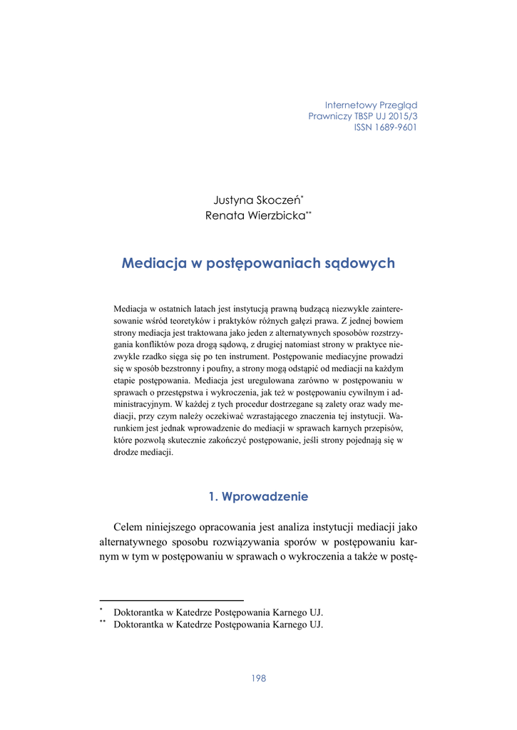 Internetowy Przegląd Prawniczy TBSP UJ 2015/3 ISSN 1689-9601 Justyna Skoczeń* Renata Wierzbicka** Mediacja w postępowaniach sądowych Mediacja w ostatnich latach jest instytucją prawną budzącą niezwykle zainteresowanie wśród teoretyków i praktyków różnych gałęzi prawa. Z jednej bowiem strony mediacja jest traktowana jako jeden z alternatywnych sposobów rozstrzygania konfliktów poza drogą sądową, z drugiej natomiast strony w praktyce niezwykle rzadko sięga się po ten instrument. Postępowanie mediacyjne prowadzi się w sposób bezstronny i poufny, a strony mogą odstąpić od mediacji na każdym etapie postępowania. Mediacja jest uregulowana zarówno w postępowaniu w sprawach o przestępstwa i wykroczenia, jak też w postępowaniu cywilnym i administracyjnym. W każdej z tych procedur dostrzegane są zalety oraz wady mediacji, przy czym należy oczekiwać wzrastającego znaczenia tej instytucji. Warunkiem jest jednak wprowadzenie do mediacji w sprawach karnych przepisów, które pozwolą skutecznie zakończyć postępowanie, jeśli strony pojednają się w drodze mediacji. 1. Wprowadzenie Celem niniejszego opracowania jest analiza instytucji mediacji jako alternatywnego sposobu rozwiązywania sporów w postępowaniu karnym w tym w postępowaniu w sprawach o wykroczenia a także w postę- * ** Doktorantka w Katedrze Postępowania Karnego UJ. Doktorantka w Katedrze Postępowania Karnego UJ. 198 powaniu cywilnym i administracyjnym. Opracowanie to ma na celu ukazanie funkcjonalności i utylitarności instytucji mediacji przy jednoczesnym koncentrowaniu się na poszczególnych przepisach normatywnych i innych aktach prawnych dotyczących mediacji. Artykuł podzielony został na cztery merytoryczne części. Część I poświęcona jest w całości zagadnieniom ogólnym, a w szczególności pojęciu mediacji, ratio legis wprowadzenia tej instytucji, zasadach postępowania mediacyjnego oraz rodzajach mediacji w omawianych postępowaniach: karnym w tym wykroczeń oraz cywilnym i administracyjnym. Część II stanowi analizę instytucji mediacji w postępowaniu karnym. Część III poświęcona jest zagadnieniu mediacji w sprawach dotyczących postępowania wykroczeniowego, część IV dotyczy mediacji w postępowaniu cywilnym a część V – w postępowaniu administracyjnym. Tytułem zakończenia dokonano podsumowania i oceny przedstawionych instytucji. Mediacja (łac. mediare – pośredniczyć w sporze, mediator – pośrednik) to jedna z alternatywnych form rozwiązywania sporów, w ramach której osoba trzecia – mediator, neutralna wobec stron i ich konfliktu, asystuje im w czasie konfliktu lub negocjacji, łagodzi powstające napięcia i pomaga osiągnąć stronom korzystne porozumienie, które jest wzajemnie akceptowalne i uwzględnia interesy, a także potrzeby obu stron – nie narzucając przy tym swojego stanowiska1. Podobnie uważają przedstawiciele doktryny twierdząc, że mediacja ma na celu pojednanie skonfliktowanych ze sobą stron i zawarcie ugody przy udziale bezstronnego mediatora a jej przedmiotem są kwestie restytucyjno-odszkodowawcze związane z zarzucanym przestępstwem2. Mediację traktuje się jako instrument sprawiedliwości naprawczej, który ma charakter uniwersalny, globalny i ponad podziałowy3. Prowadzi się ja w sposób bezstronny i dobrowolny. 1 2 3 W. Kopaliński, Słownik wyrazów obcych i zwrotów obcojęzycznych z almanachem, Warszawa 2000, s. 321. A. Rękas, Mediacja w Polsce na tle doświadczeń państw Unii Europejskiej, w: Mediacja w krajach Unii Europejskiej i w Polsce, J. Szymańczak, A. Chodyra (red.), Konferencje i Seminaria, Warszawa 2003, s. 9-11. G. Skrobotowicz, Zalety mediacji karnej, Prok. i Pr. 2012, nr 2, s. 128. 199 Mediacja ma całkowicie dobrowolny charakter i każda ze stron może w dowolnym czasie odmówić dalszego udziału w postępowaniu mediacyjnym4. Mediację cechuje bowiem: dobrowolność, bezstronność, neutralność, akceptowalność, poufność, profesjonalizm, bezinteresowność, szacunek dla obu stron5. Mediacja nie jest zjawiskiem nowym, była znana prawie we wszystkich kulturach starożytnych. Wprowadzenie tej instytucji do polskiego prawa karnego w tym prawa wykroczeń a także prawa cywilnego i administracyjnego miało na celu ustanowienie alternatywnego do sądowego postępowania, sposobu rozwiązywania konfliktów. 2. Model mediacji w postępowaniu karnym Nowelizacja kodeksu postępowania karnego z 2003 roku dodała do przepisów wstępnych kodeksu postępowanie mediacyjne (art. 23a k.p.k.) oraz zmieniła art. 489 § 2, stanowiąc, że postępowanie mediacyjne stosuje się również odpowiednio do postępowania w sprawach z oskarżenia prywatnego. Aktualnie obowiązujący od 1 lipca 2015 roku art. 23a k.p.k. określa ogólne reguły prowadzenia postępowania mediacyjnego w tym podmioty, które są uprawnione do prowadzenia omawianego postępowania, czas jego trwania a także wprowadza obowiązek sporządzenia sprawozdania z przebiegu i wyników postępowania mediacyjnego. Szczegółowe zasady prowadzenia postępowania mediacyjnego zawiera rozporządzenie Ministra Sprawiedliwości z 13.06.2003 r. w sprawie mediacji w sprawach karnych6. Zgodnie z art. 23a k.p.k. sąd lub referendarz sądowy, a w postępowaniu przygotowawczym prokurator lub inny organ prowadzący to postępowanie, może z inicjatywy lub za zgodą oskarżonego i pokrzywdzonego skierować sprawę do instytucji lub osoby do tego uprawnionej w 4 5 6 R. Morek, ADR w sprawach gospodarczych, Warszawa 2004, s.75. M. Grudziecka, Zawód mediator, w: Mediacja w teorii i w praktyce, red. A. Gretkowski, D. Karbarz, Stalowa Wola 2009, s. 257 i n. Rozporządzenie Ministra Sprawiedliwości z dnia 13.06.2003 r. w sprawie mediacji w sprawach karnych, Dz.U., Nr 108, poz. 1020. 200 celu przeprowadzenia postępowania mediacyjnego między pokrzywdzonym i oskarżonym, o czym się ich poucza, informując o celach i zasadach postępowania mediacyjnego, w 